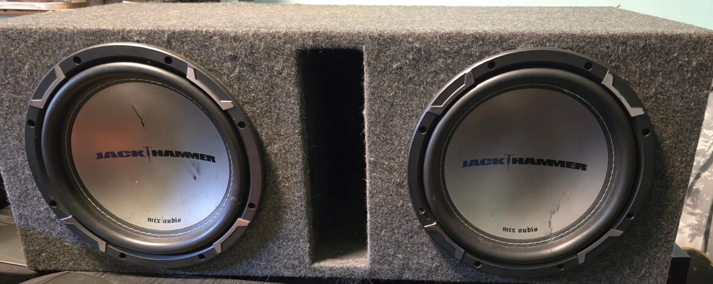 One sub doesn't work, however still puts out some significant bass. Can be heard in a car. This is a dual subwoofer enclosure with two Jack Hammer subwoofers from MTX Audio. L32" X W13" 3/4 X H12".