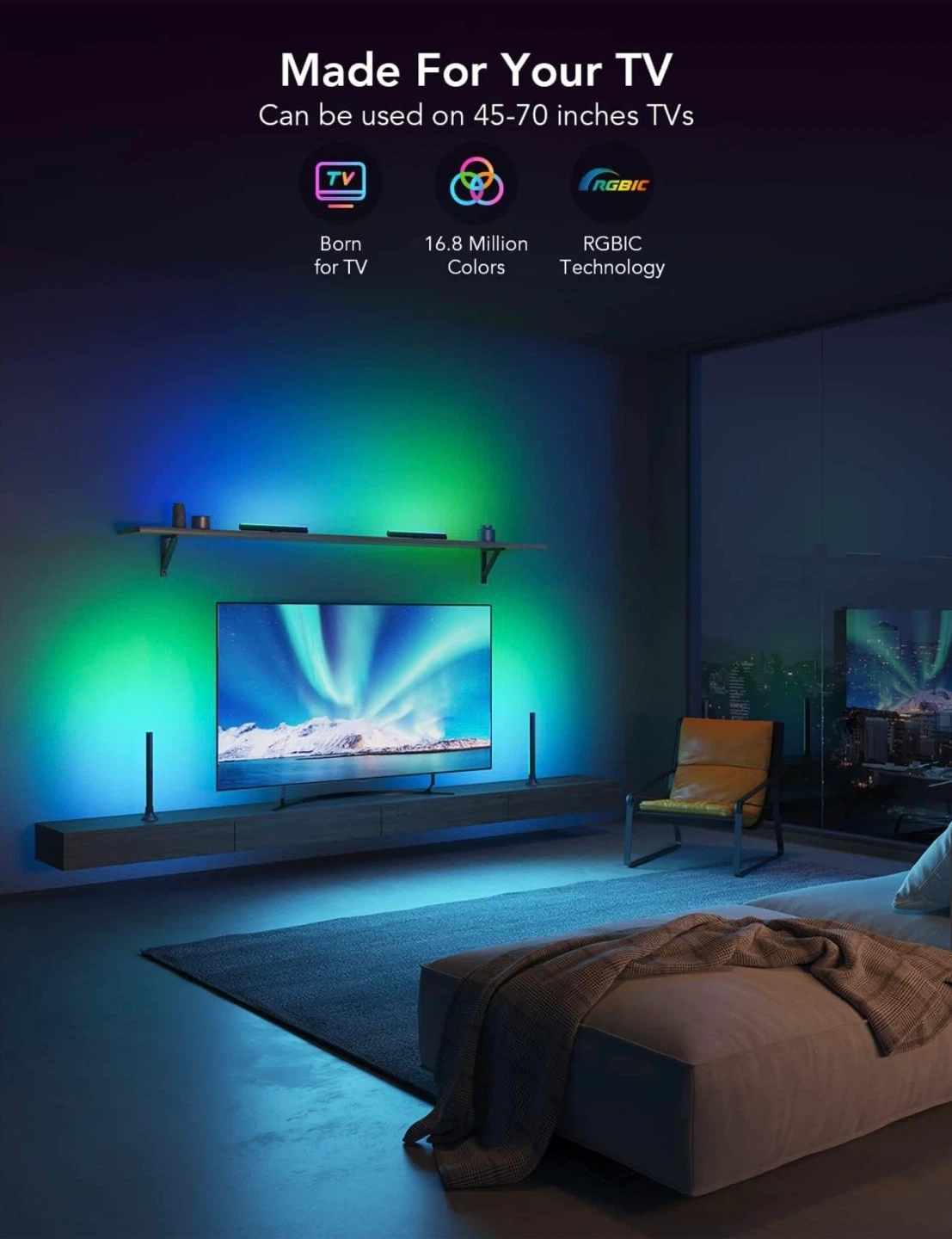Govee RGBIC Light Bars, 15 Inches WiFi TV Backlight Suitable for 45-70 inch TVs, Smart Light Bars with Multiple Placement Options, Work with Alexa and Google Assistant, Black