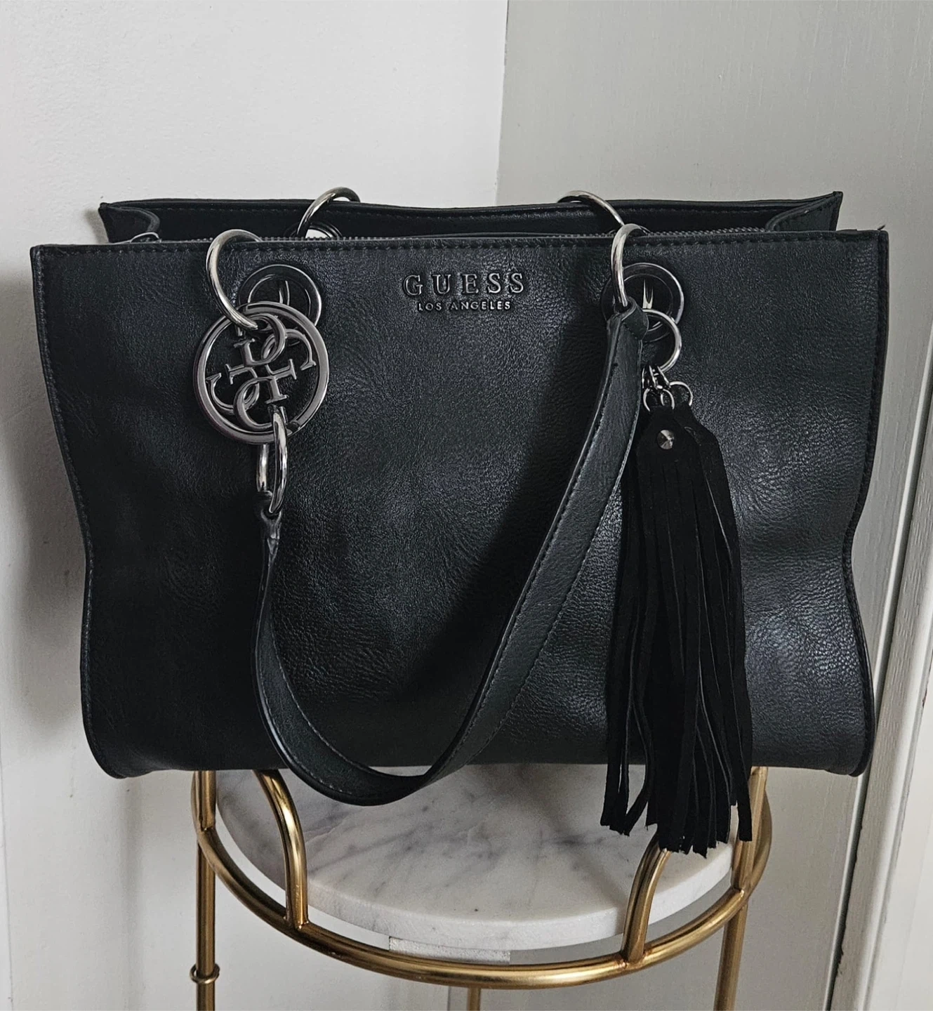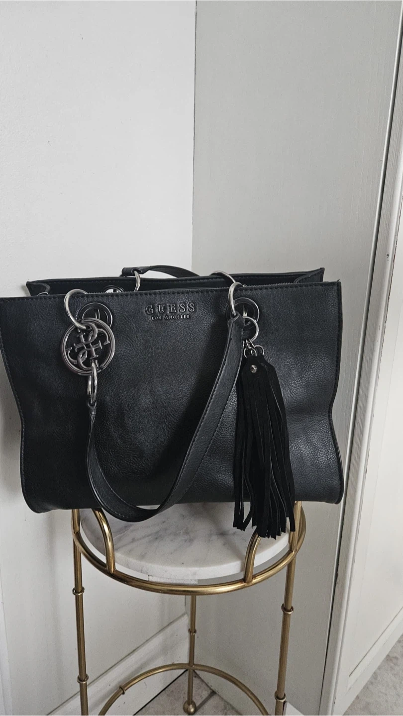 This is a black Guess Los Angeles tote bag. It features silver-tone hardware and a decorative tassel charm. The bag has dual top handles and a detachable shoulder strap. It's a stylish accessory for everyday use!