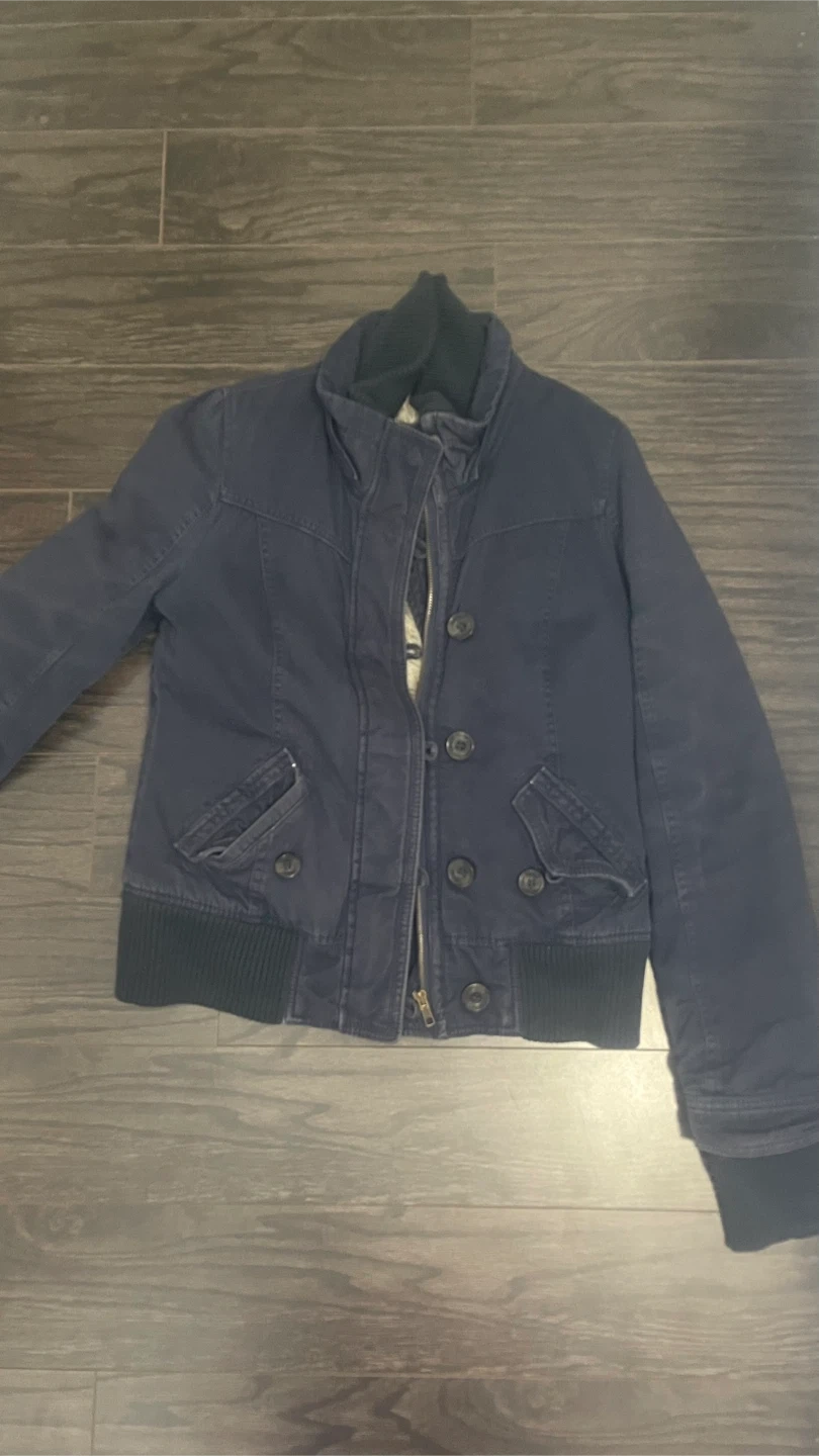 Abercrombie & Fitch bomber jacket in navy. It's a size medium and made in China. This jacket has a faux fur lining and ribbed cuffs and hem.