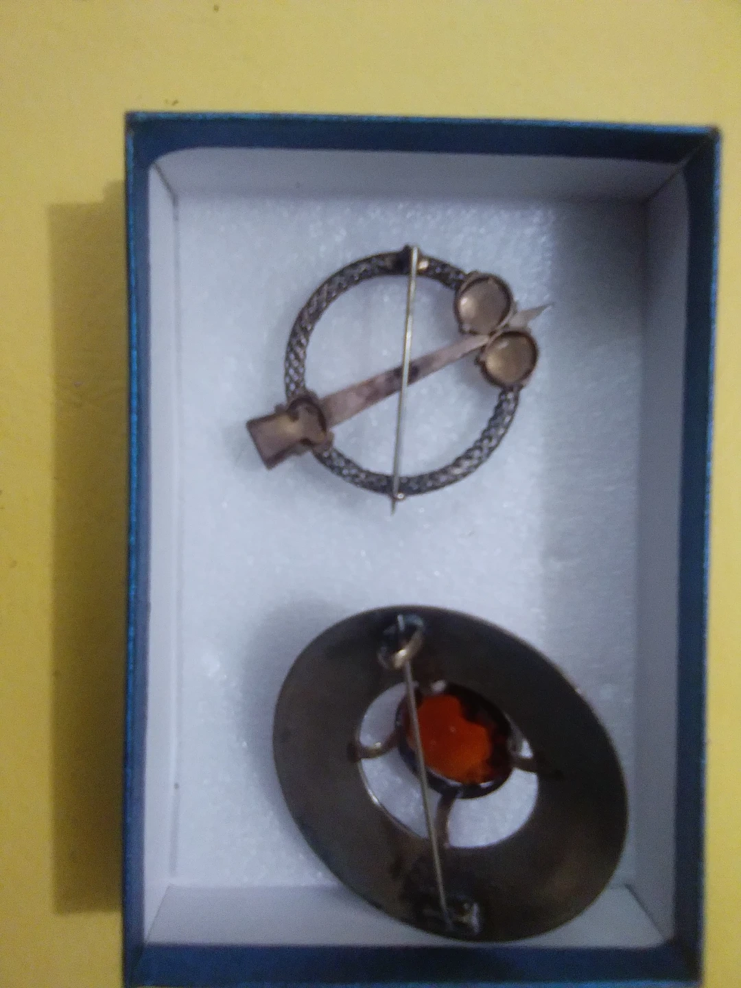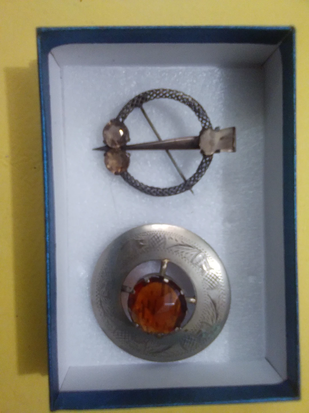 Two antique brooches included, one with a circular knot design and amber-coloured stones, and another larger oval brooch featuring a central amber stone with etched detailing. Both have pin backs for attachment. These pieces have a timeless charm!
