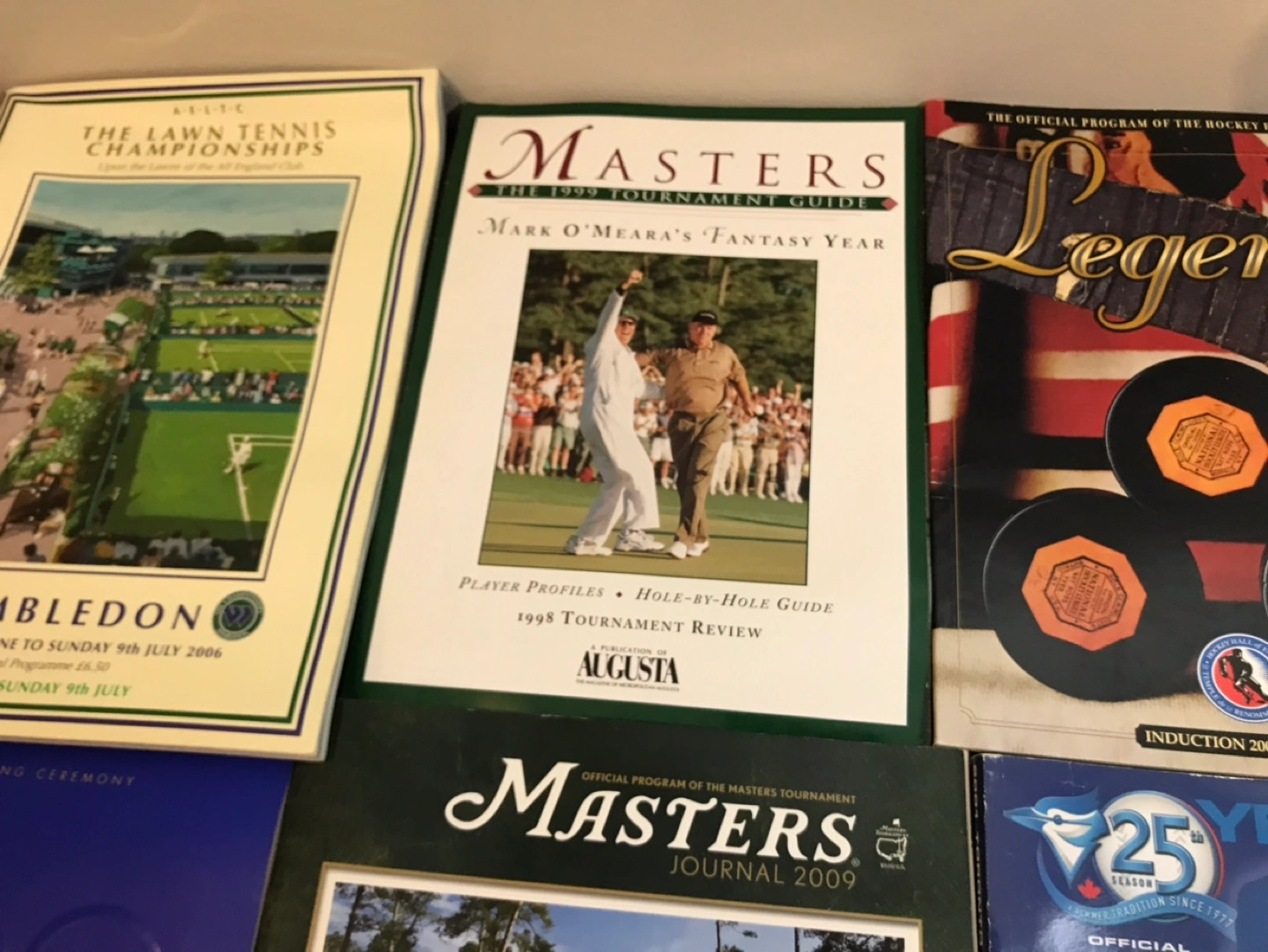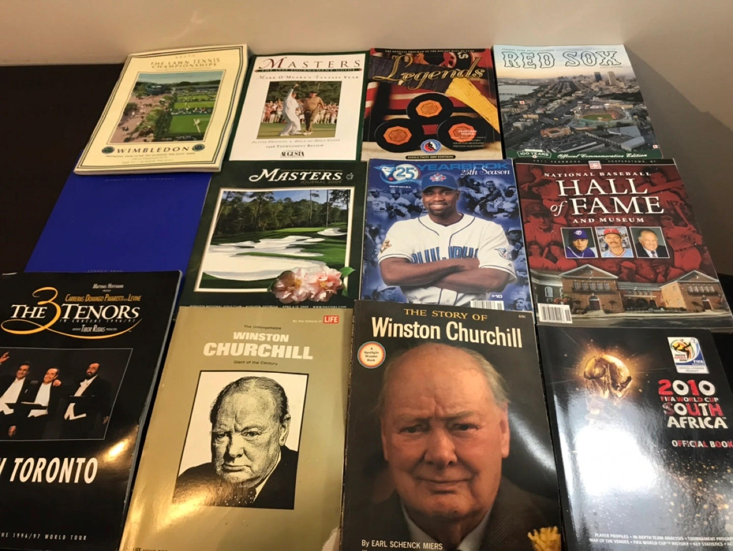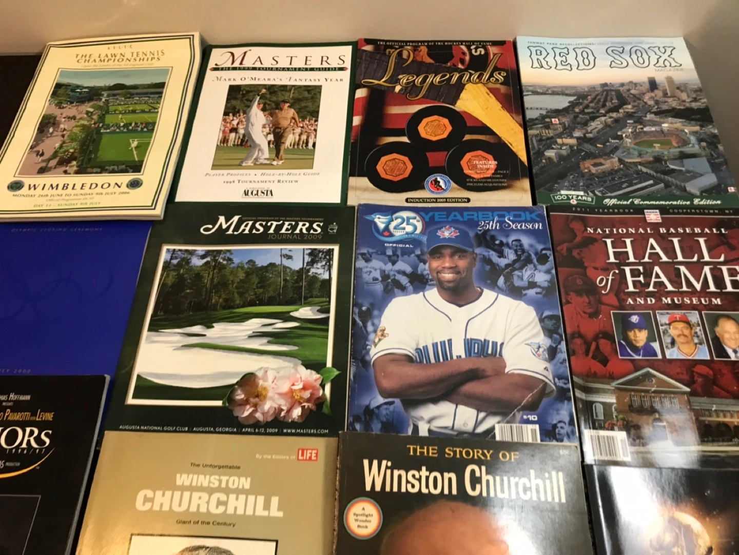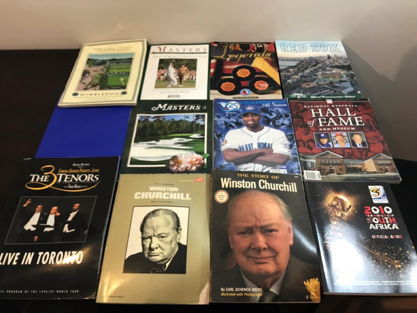 A lot of 12 program books for various sporting events, including Wimbledon, the Masters, the Red Sox, the National Baseball Hall of Fame, and the Olympics. There is also a book about Winston Churchill. Good condition with minimal wear. Only 1$ each