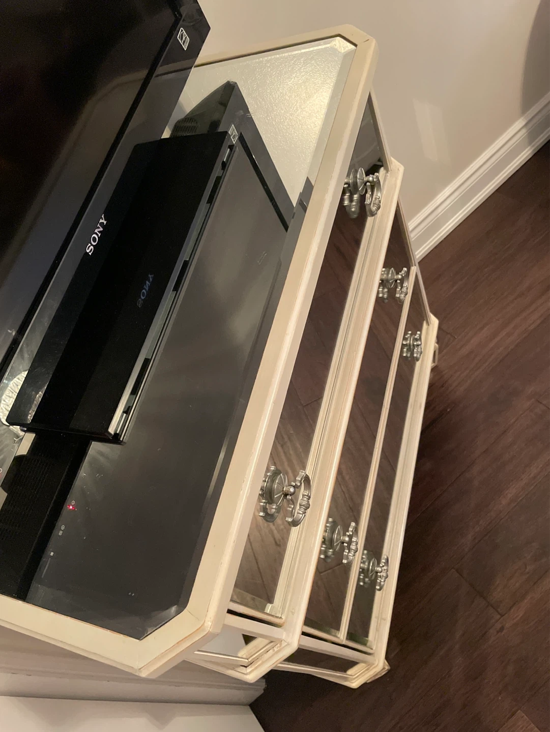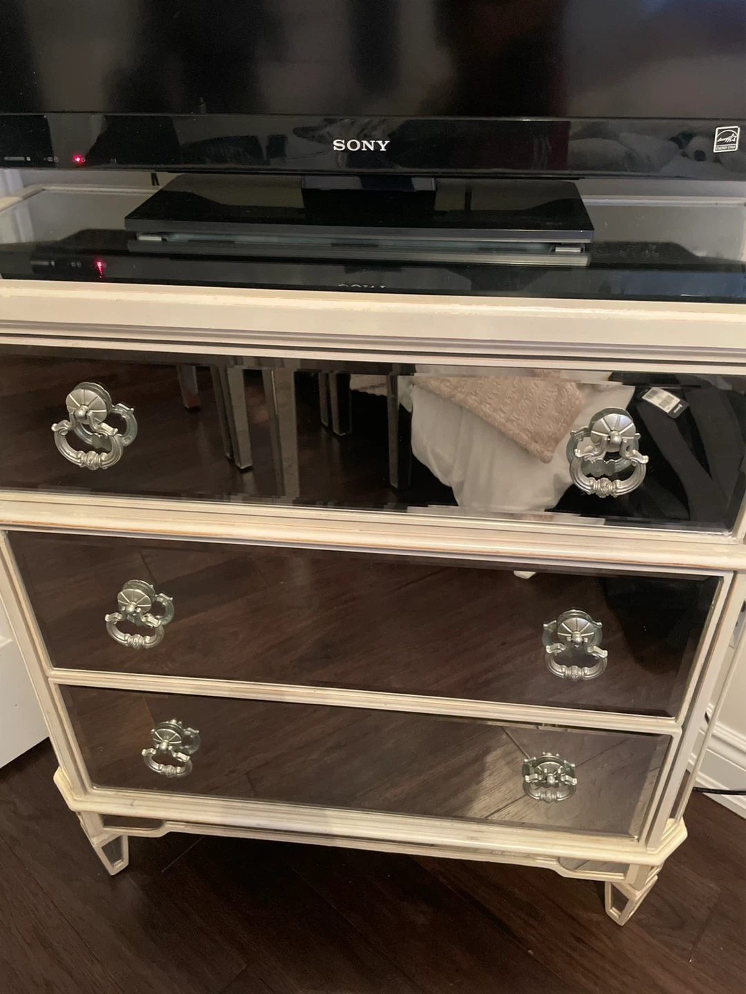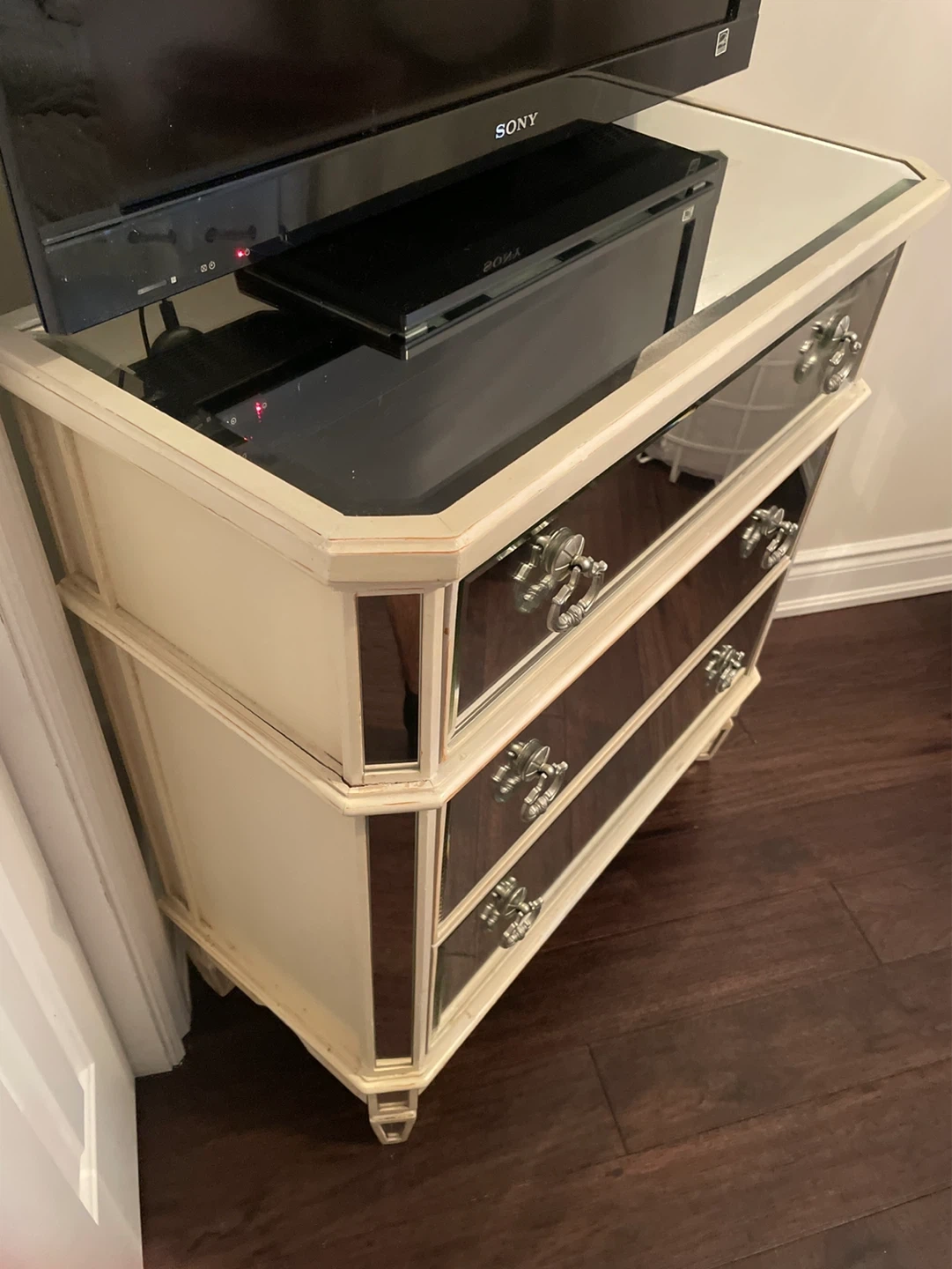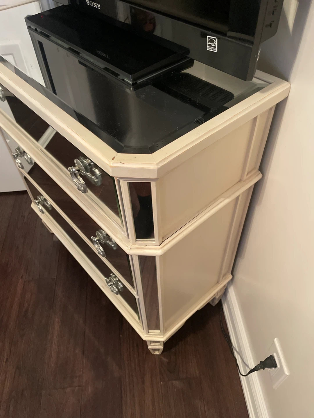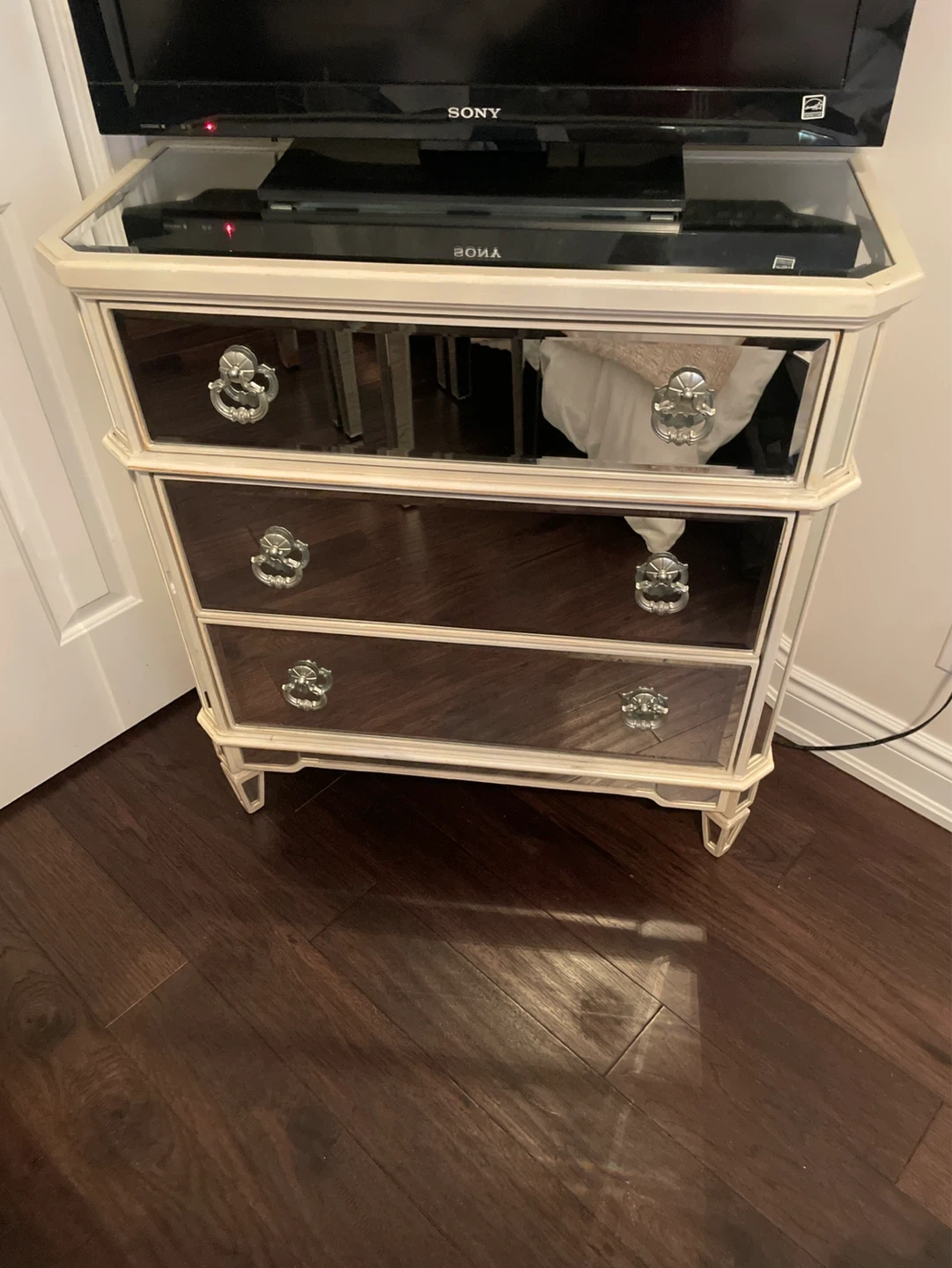 Chic accent chest with mirrored drawer fronts and decorative hardware. Three spacious drawers offer ample storage. Its reflective surfaces add a touch of glam to any room. Bottom right handle is broken.