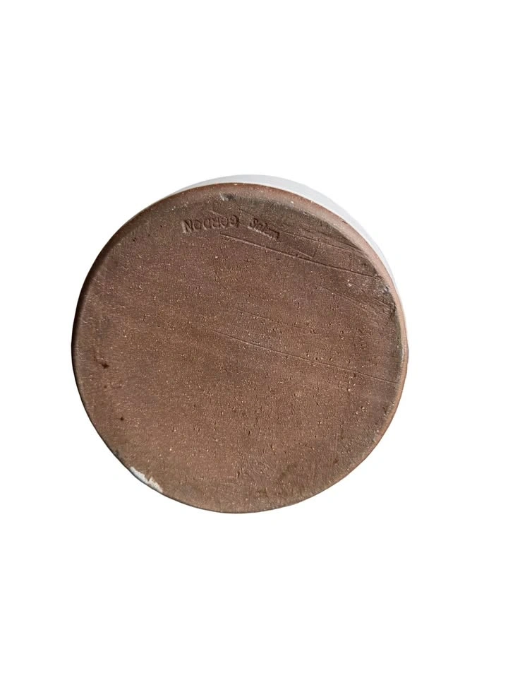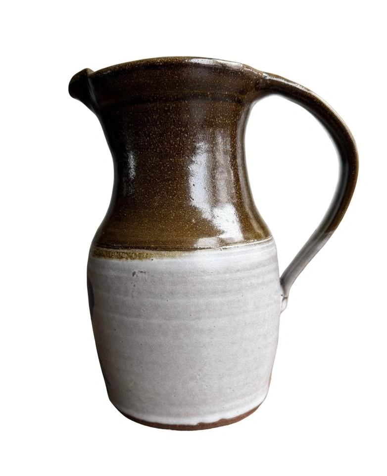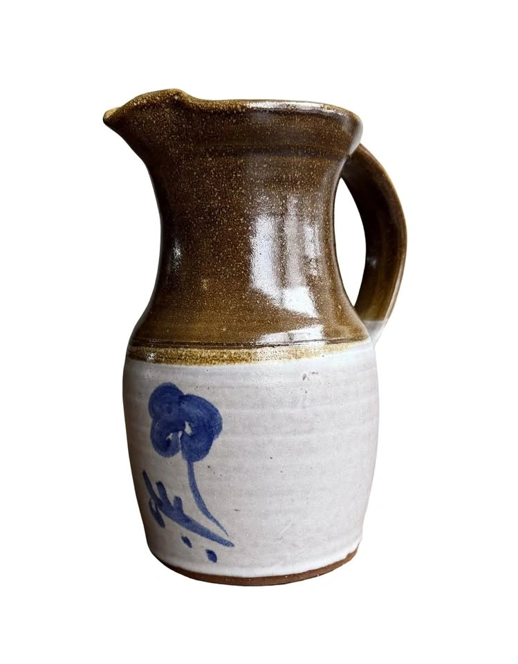 Handmade ceramic pottery made in Salem, Ontario. Features a brown glazed rim and handle contrasting with a grey/white body. Hand-painted blue floral design on the side. Stands 9 inches tall.