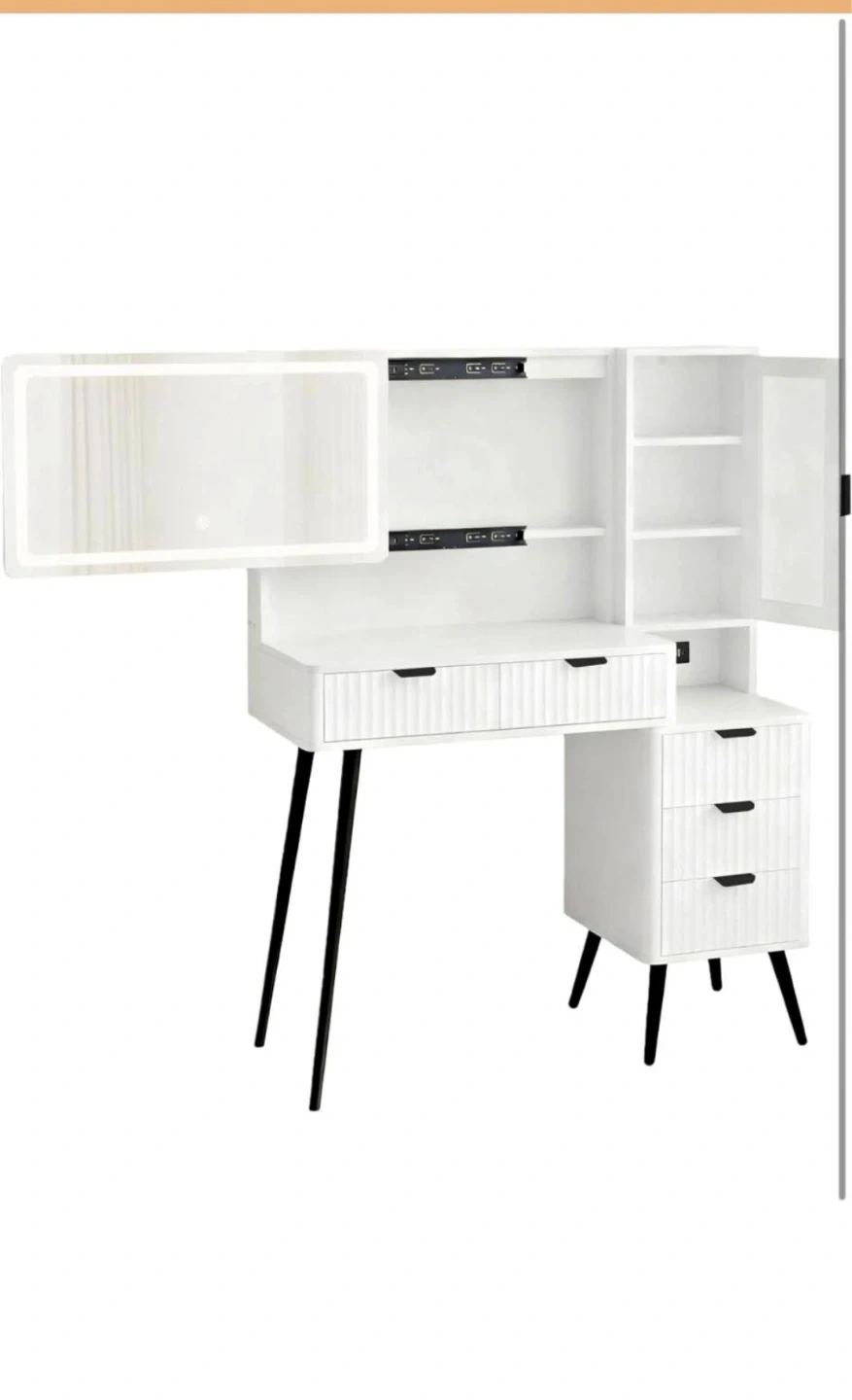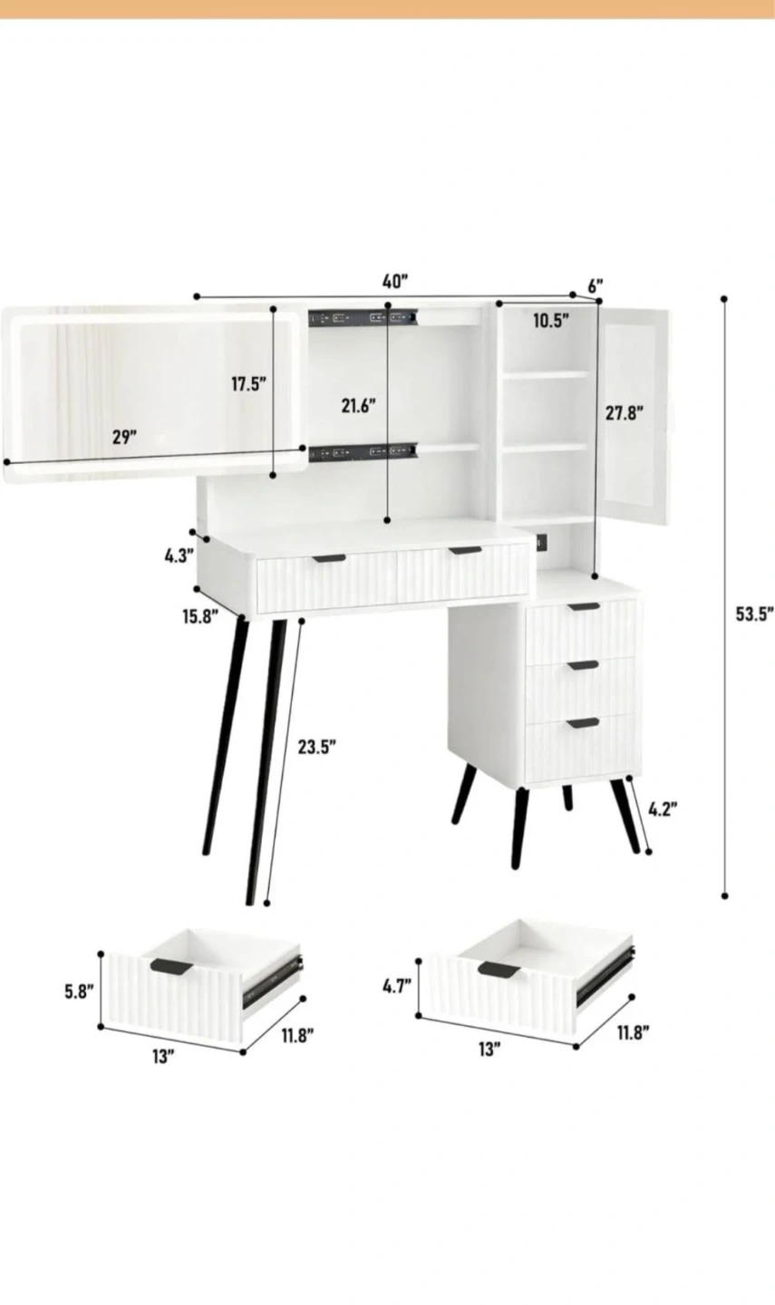 This white vanity desk features a lighted mirror with adjustable brightness and color temperature. It includes a fluted waveform panel design, high-quality alloy handles, a 4-in-1 built-in power strip, and a detachable hair dryer holder. Multiple drawers and shelves offer ample storage space. Overall dimensions are 53.5" H x 40" W x 17.5" D. Perfect for organizing your beauty essentials!