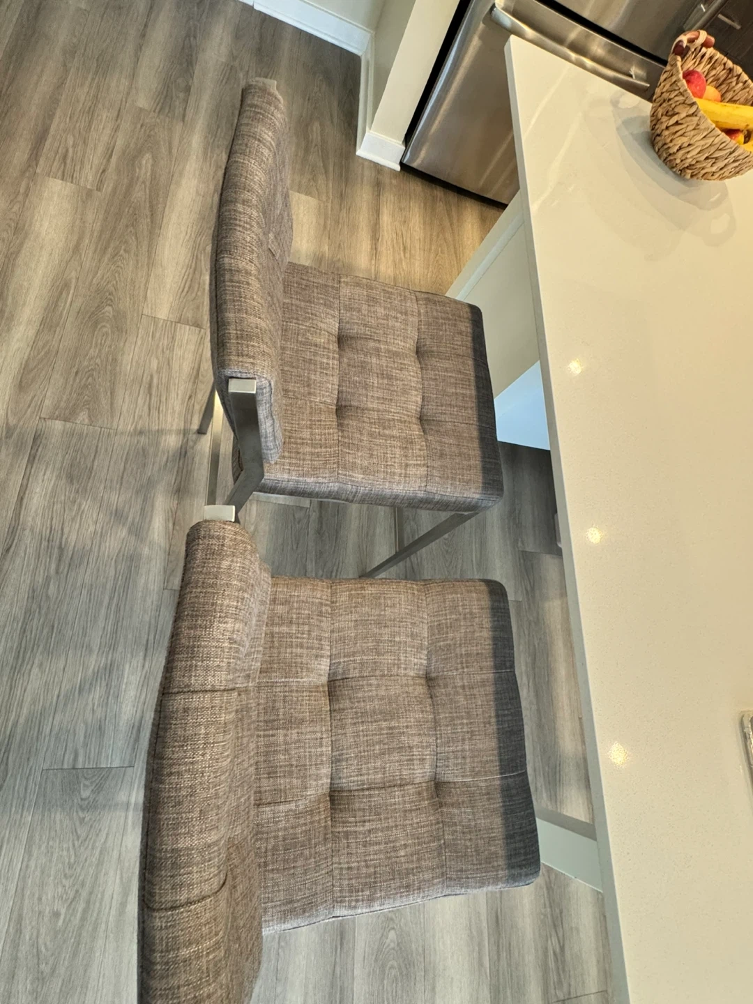 Two upholstered bar stools with a tufted design. They feature a textured gray fabric and a brushed metal frame. These stools offer a comfortable seating option for your kitchen island or bar area.