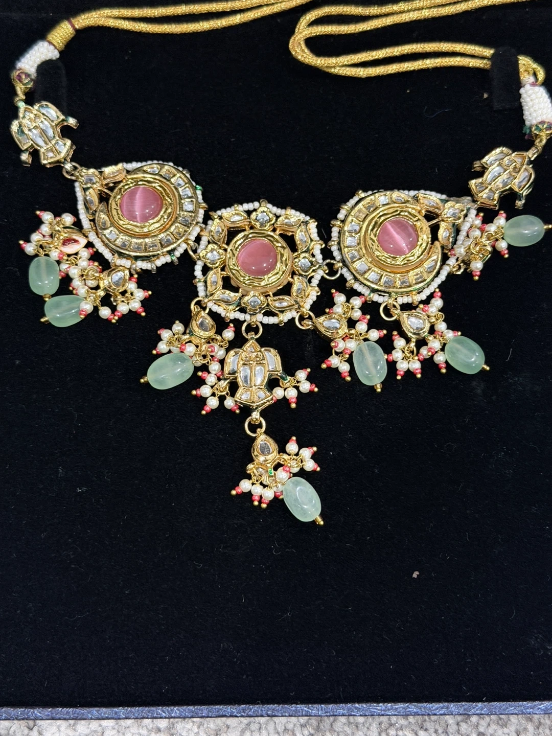 This is a stunning choker necklace set featuring intricate gold-tone metalwork. It's adorned with beautiful pink and green stones, along with pearl accents. The set also includes matching dangling earrings. It comes in a dark blue velvet-lined box.