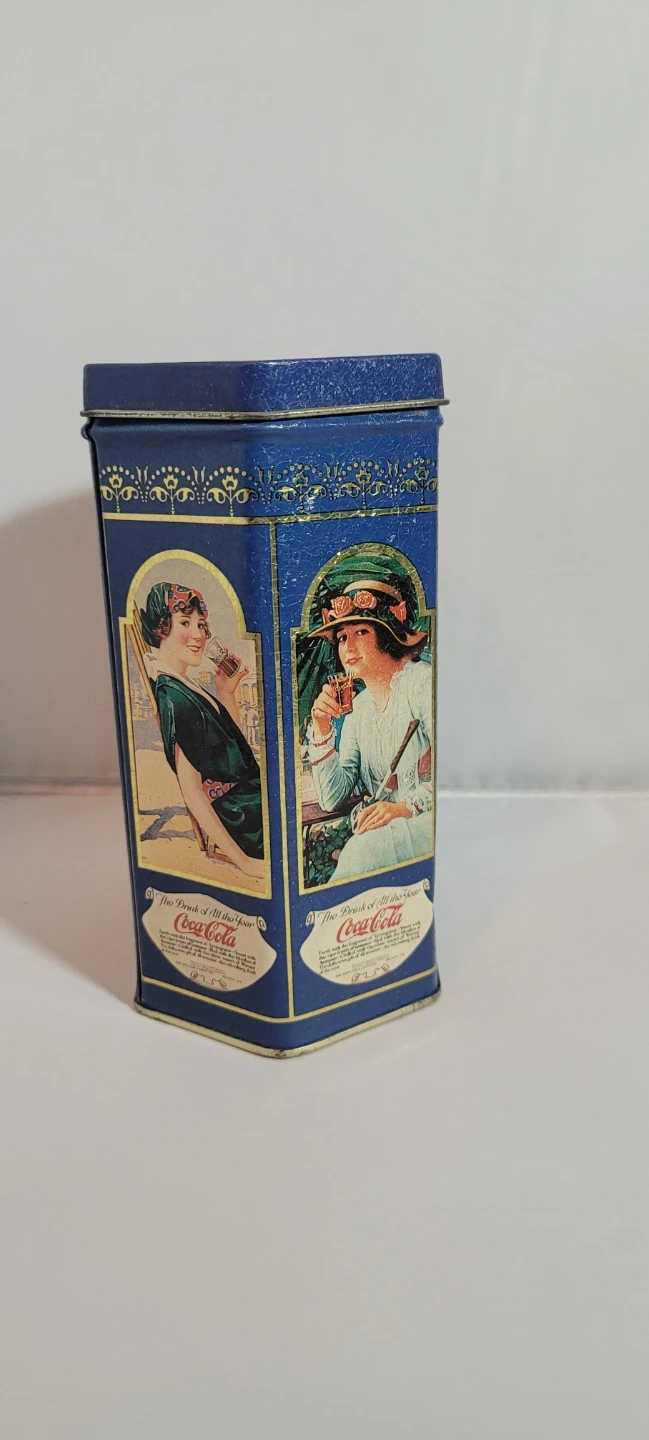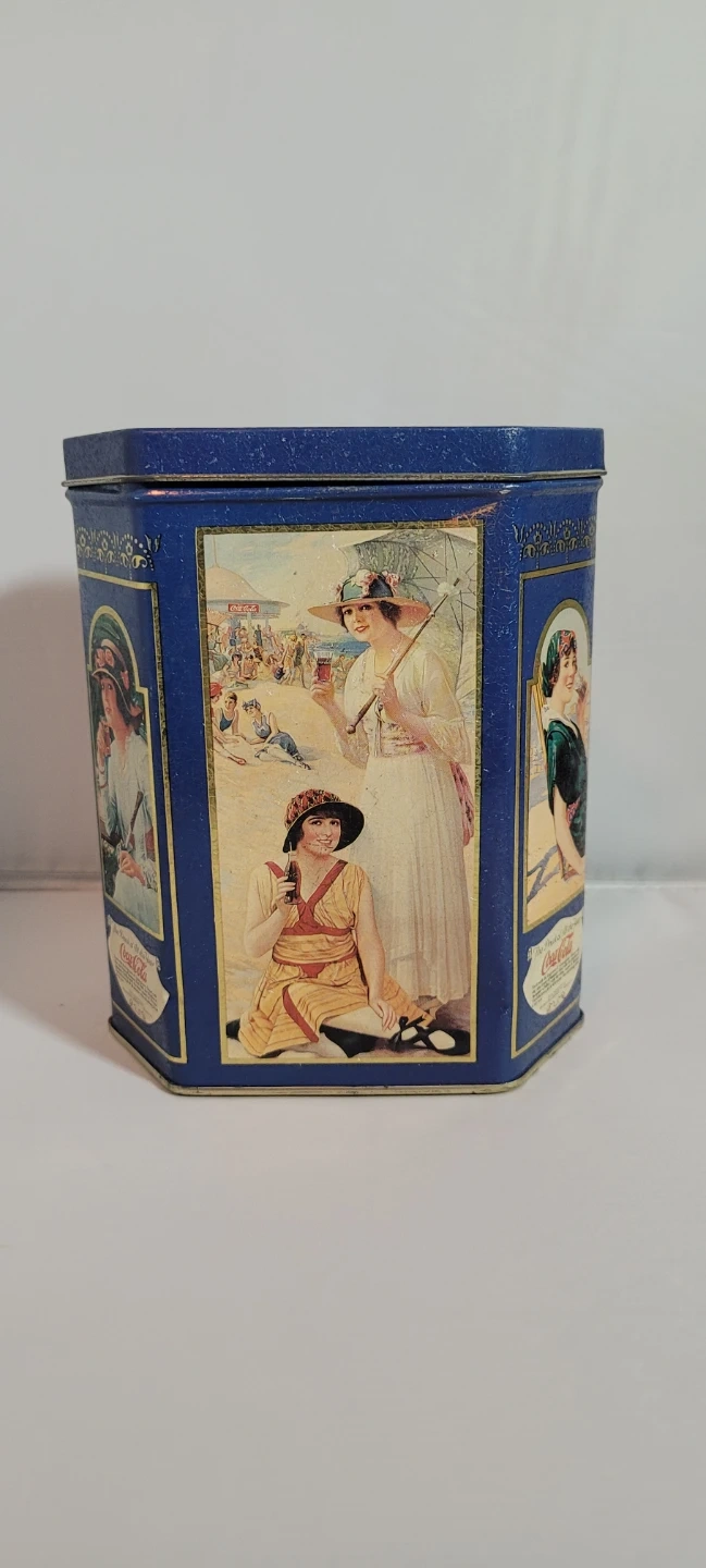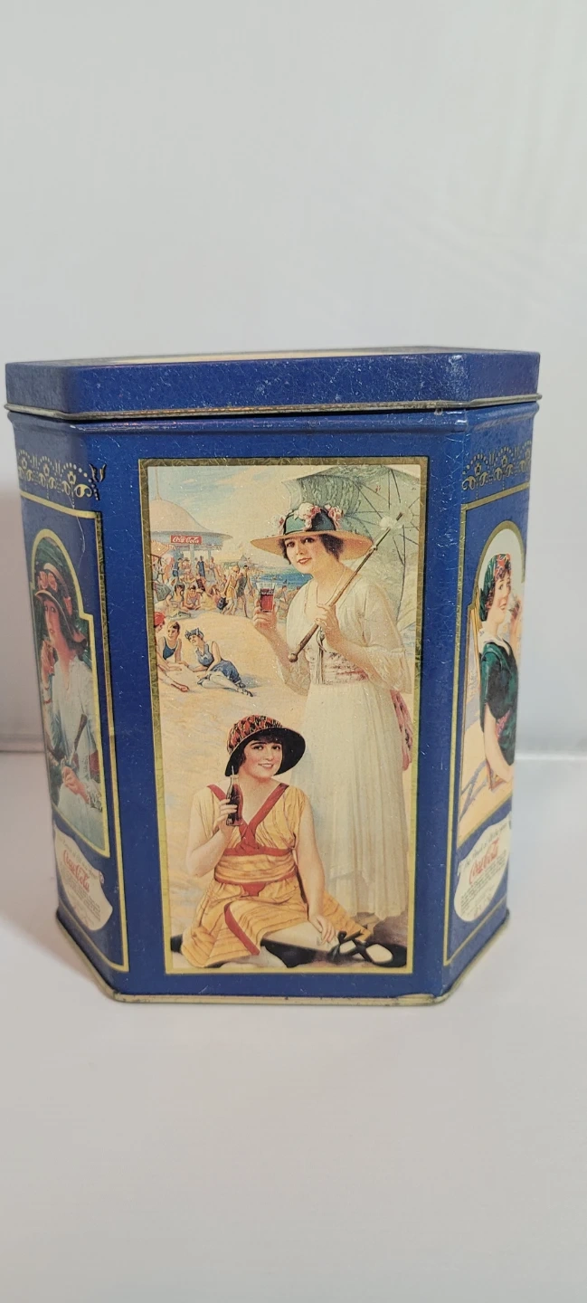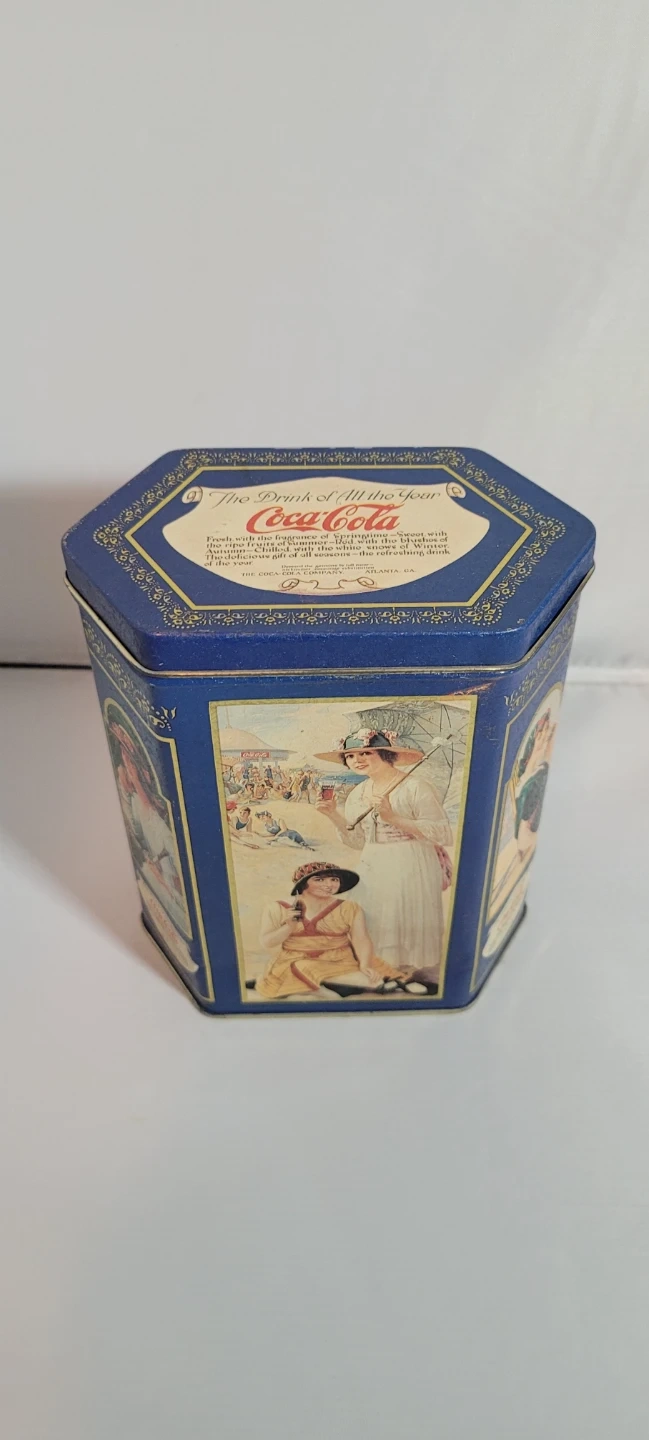 This is a vintage decorative tin featuring classic Coca-Cola imagery. It has a hexagonal shape with detailed artwork on all sides. The tin's vibrant blue colour and intricate gold accents add a touch of nostalgia.