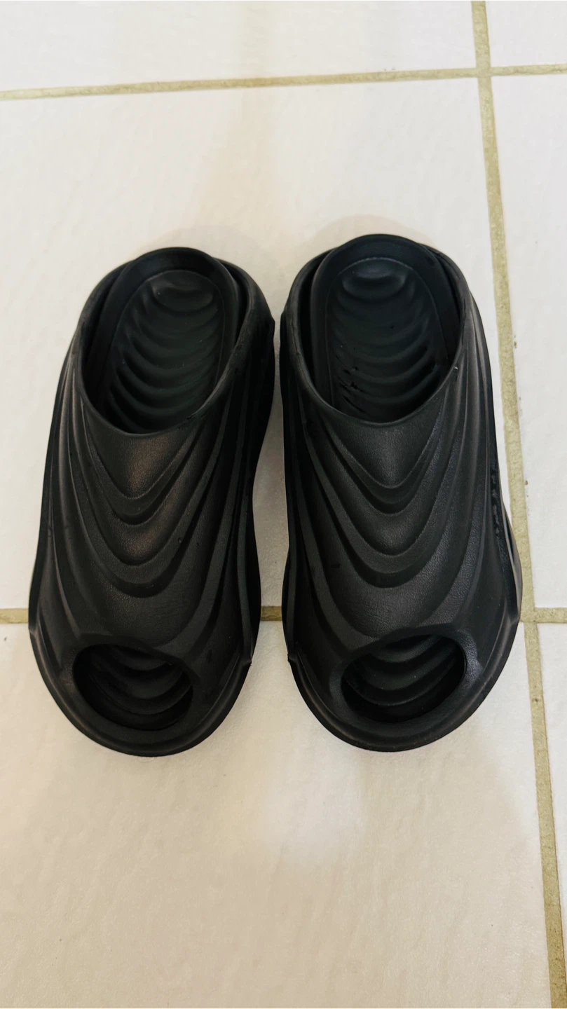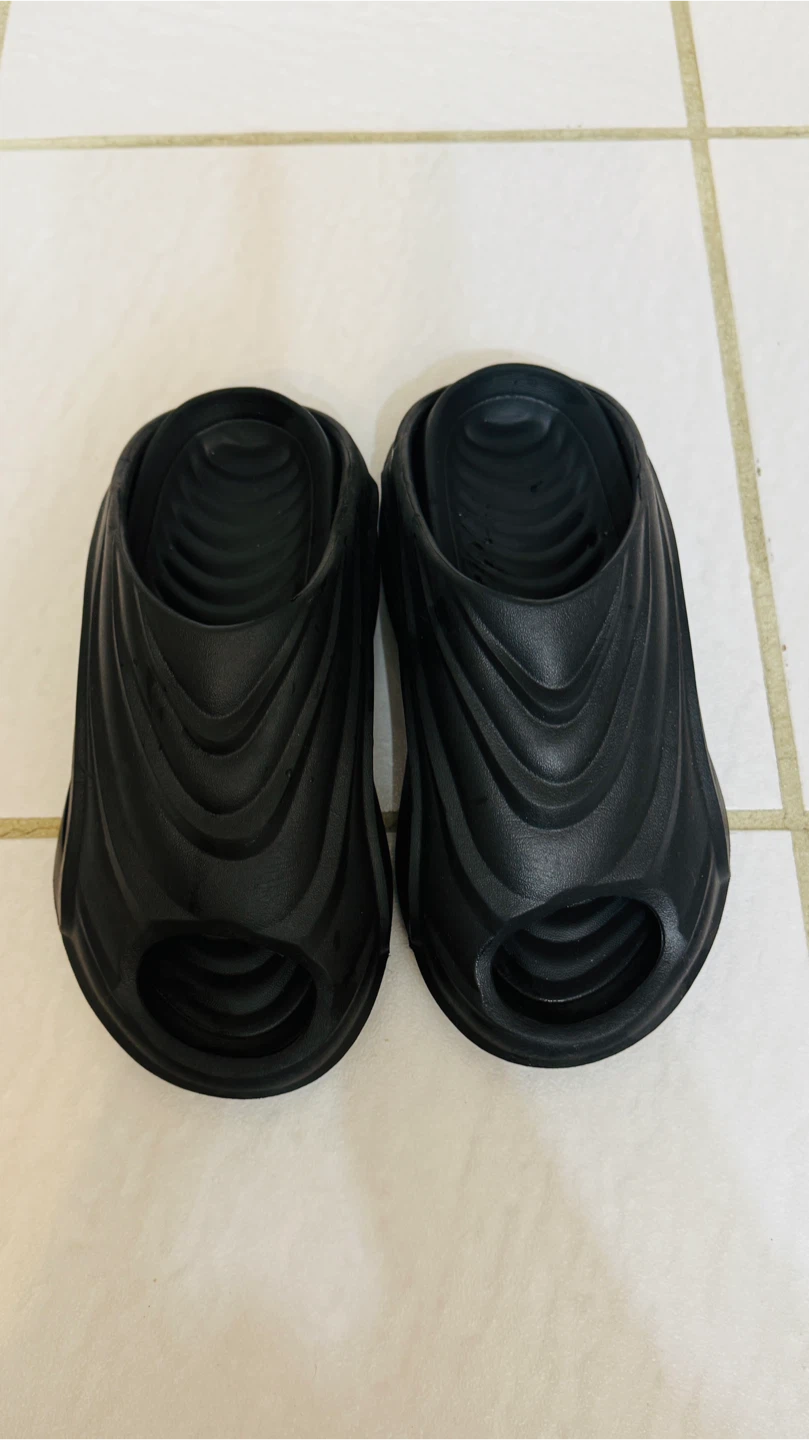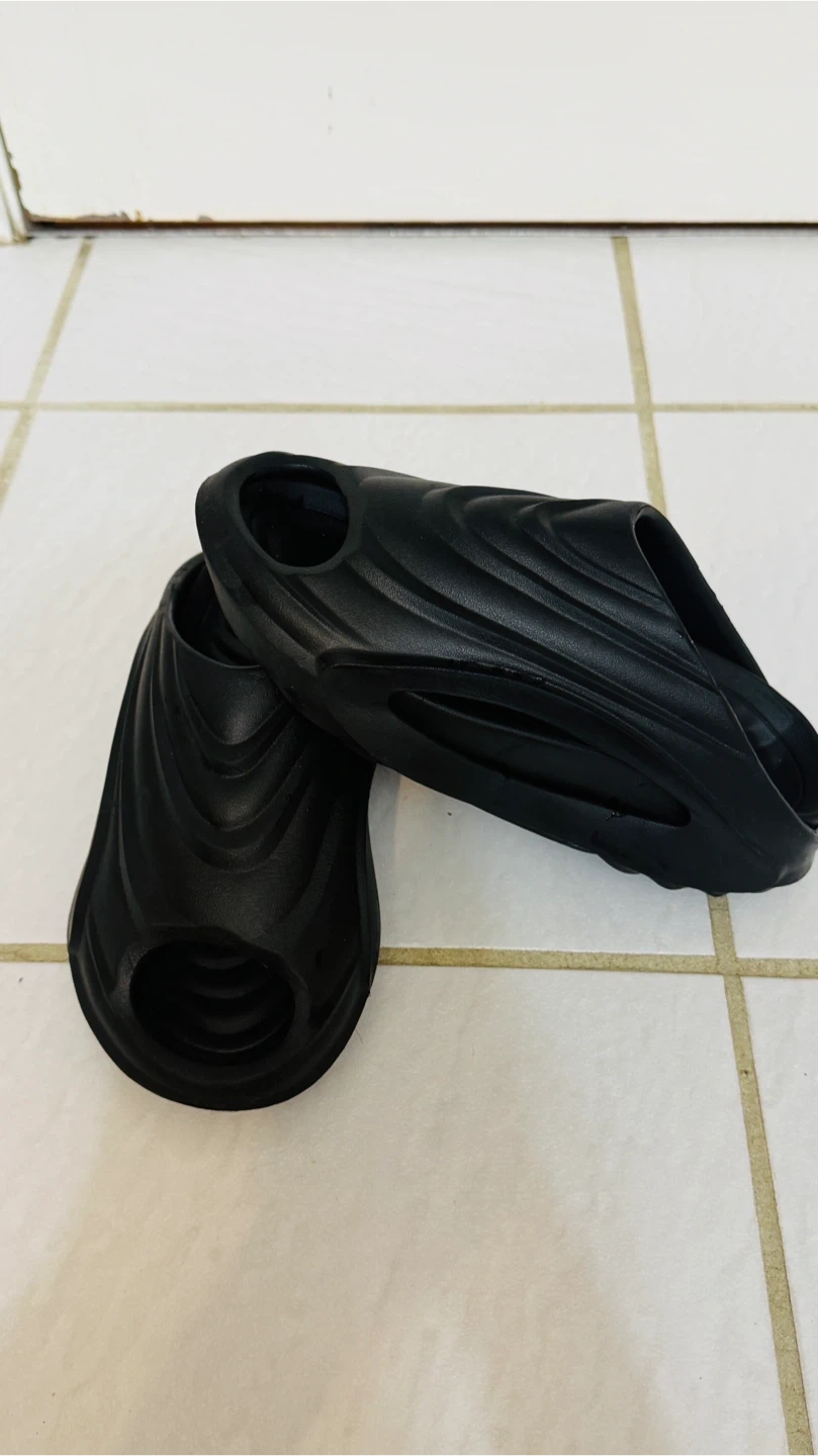 Comfortable black slides with a unique textured design. Easy to slip on and off. Perfect for casual wear and post-workout recovery.