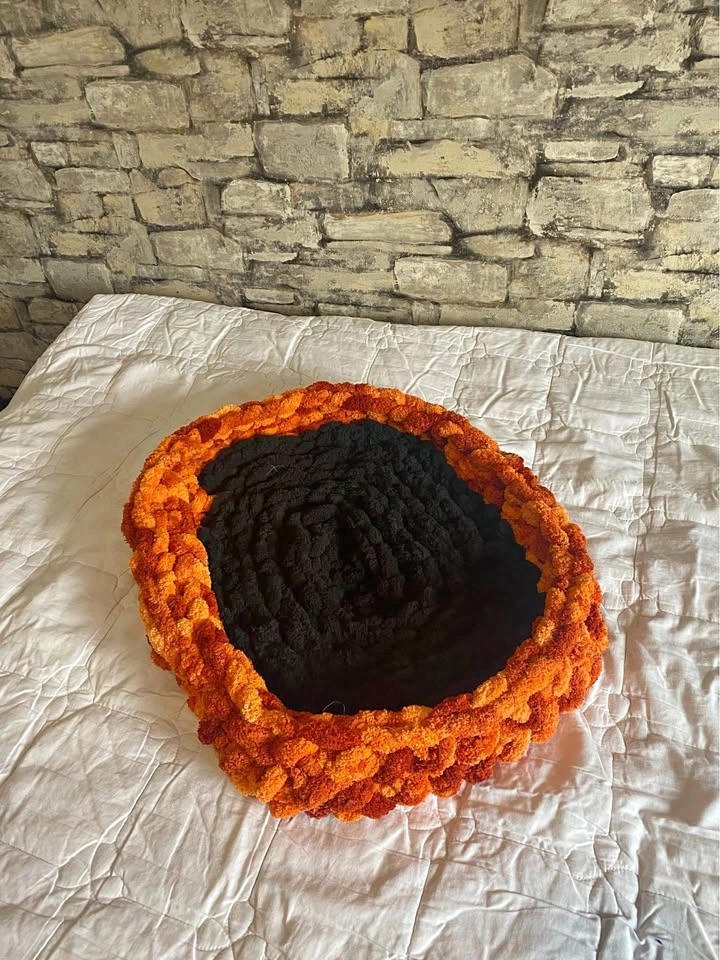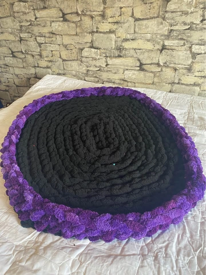 Cozy and stylish pet beds made from Bernat Blanket Big Yarn by Yarnspirations! Small (20 x 15) in black and orange for $35. Medium (20 x 25) in teal and gray for $55. Large (25 x 30) in purple and black for $75.