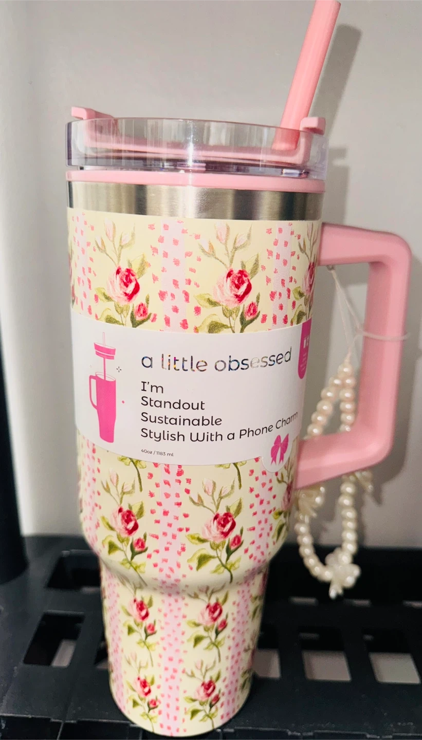 This tumbler combines durability and style with a pink floral design. It features double-wall construction and is condensation-free. This 40oz (1185 ml) tumbler is perfect for home, office, or travel.