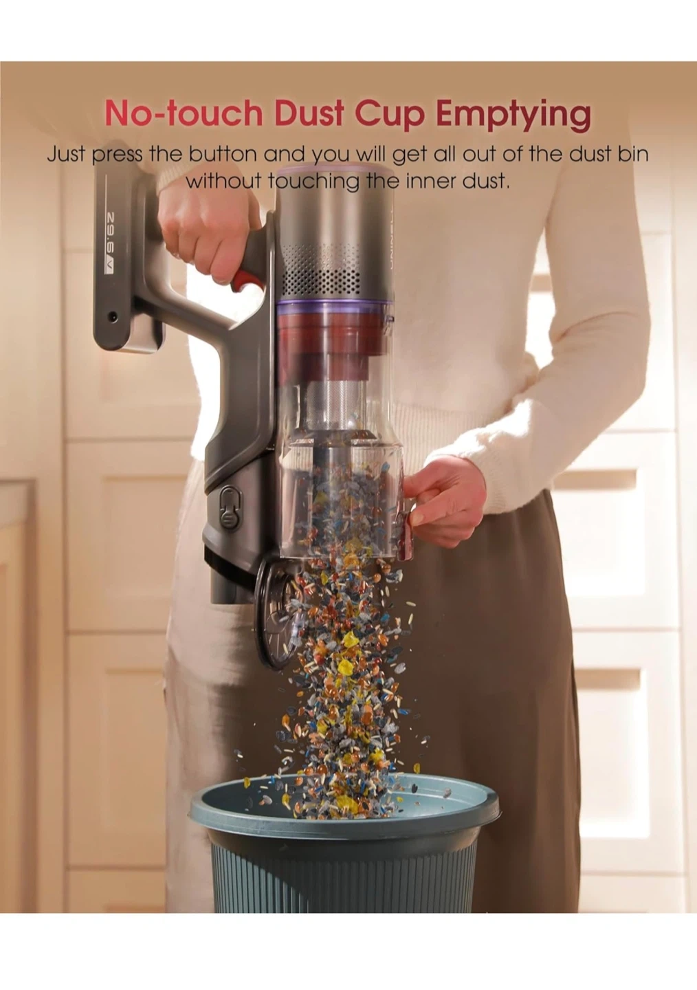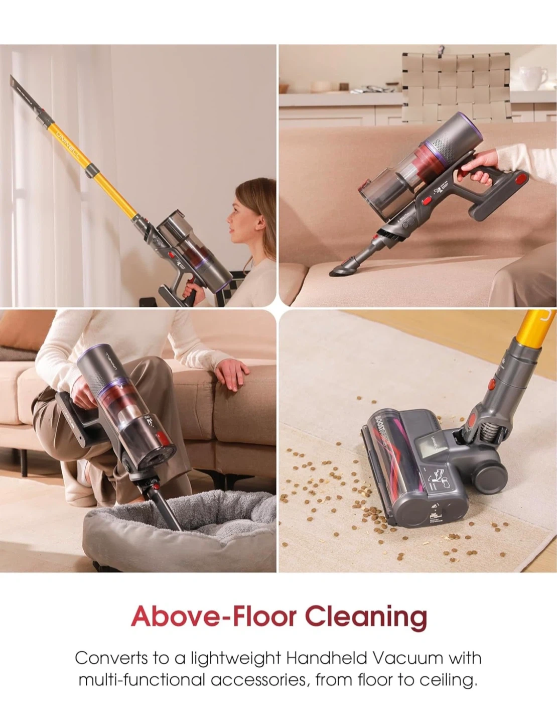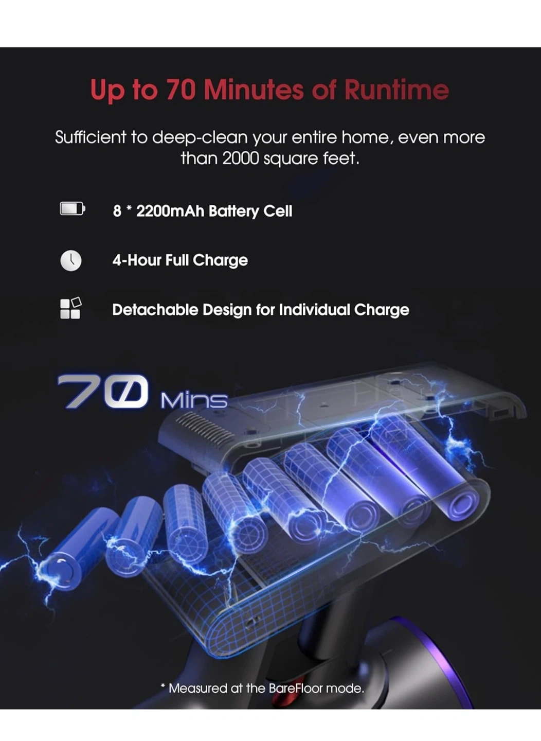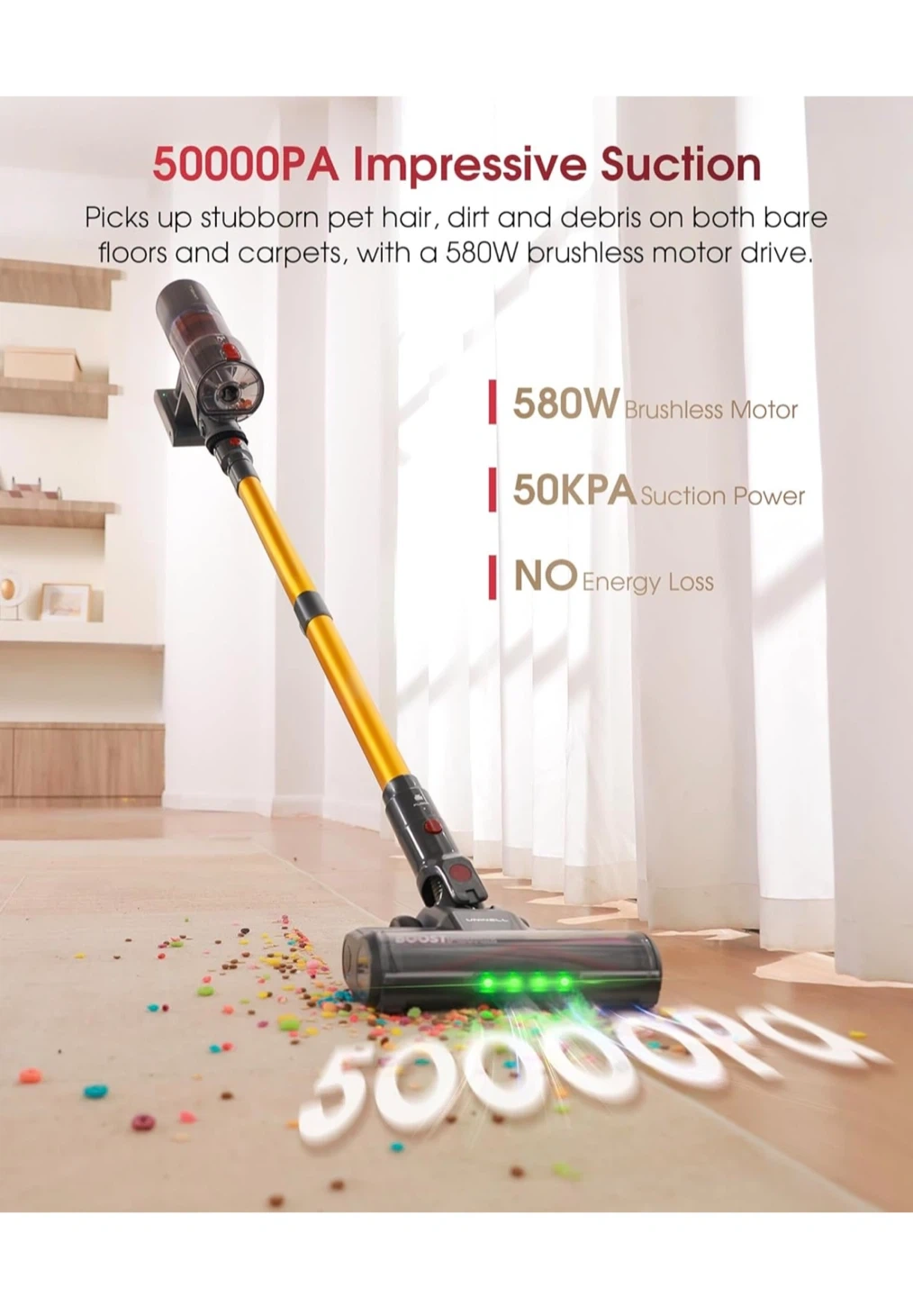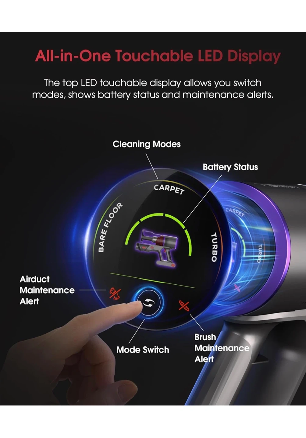 This cordless vacuum features up to 70 minutes of runtime on a single charge. It has 50000PA suction power and an all-in-one touchable LED display for modes and alerts. The design is tangle-free for efficient cleaning.