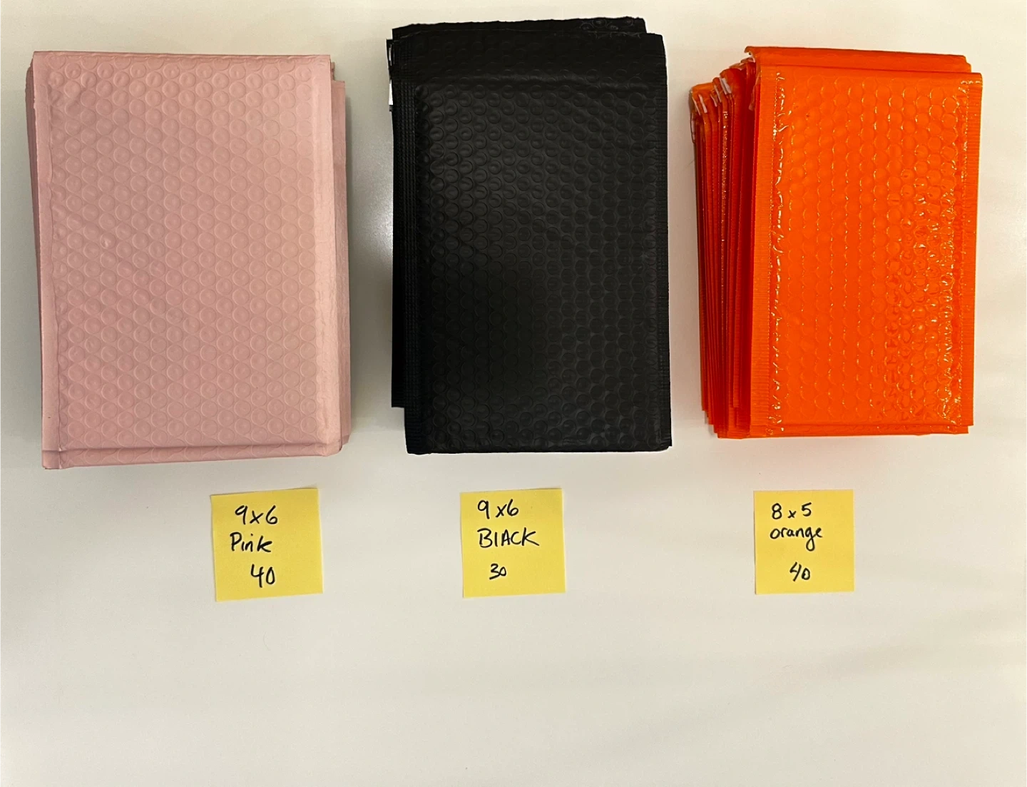 You get a lot of bubble mailers in different colours and sizes. Pink and black are 9x6 inches, with 40 pink and 30 black. The orange ones are 8x5 inches and there are 40 of them. They're great for shipping small items safely!