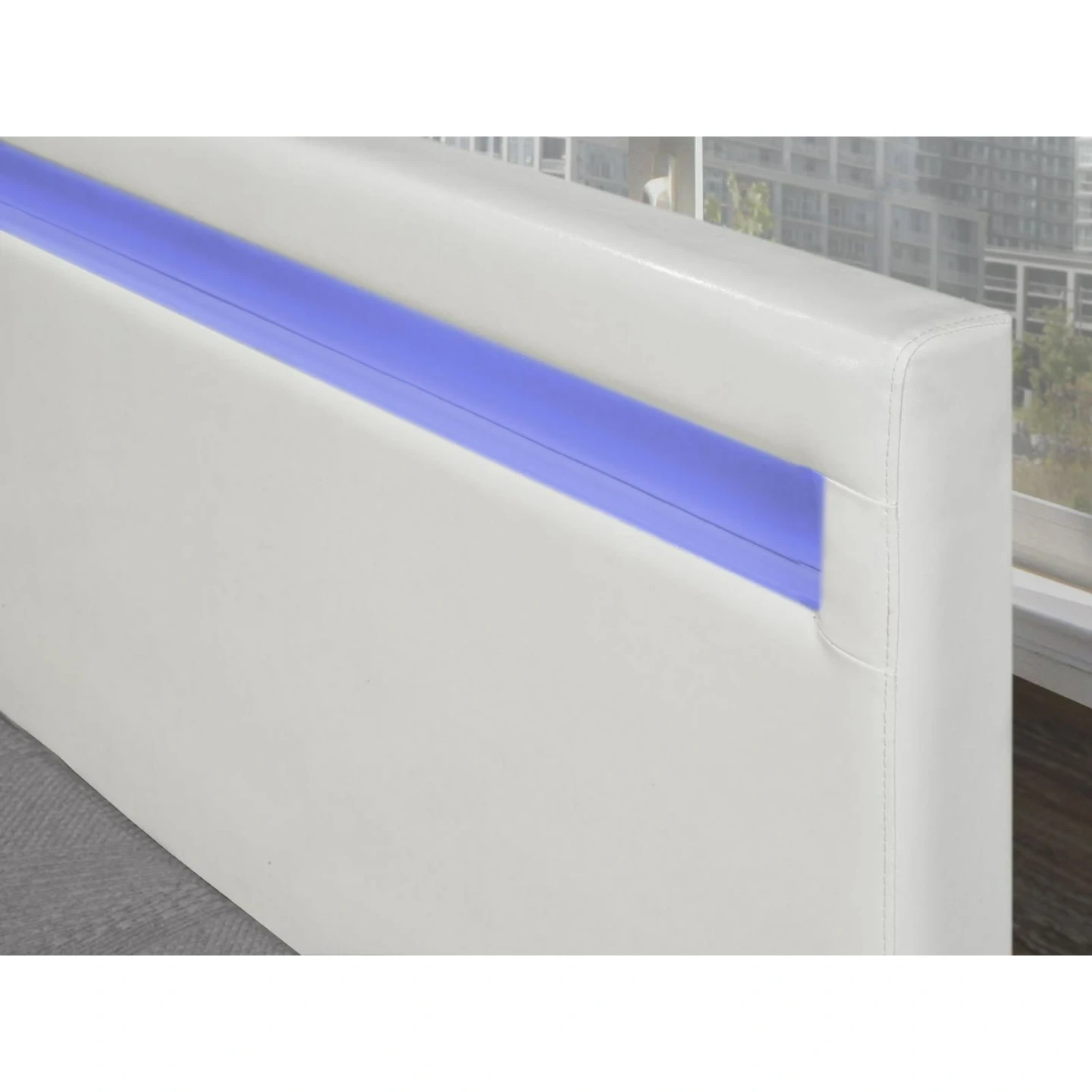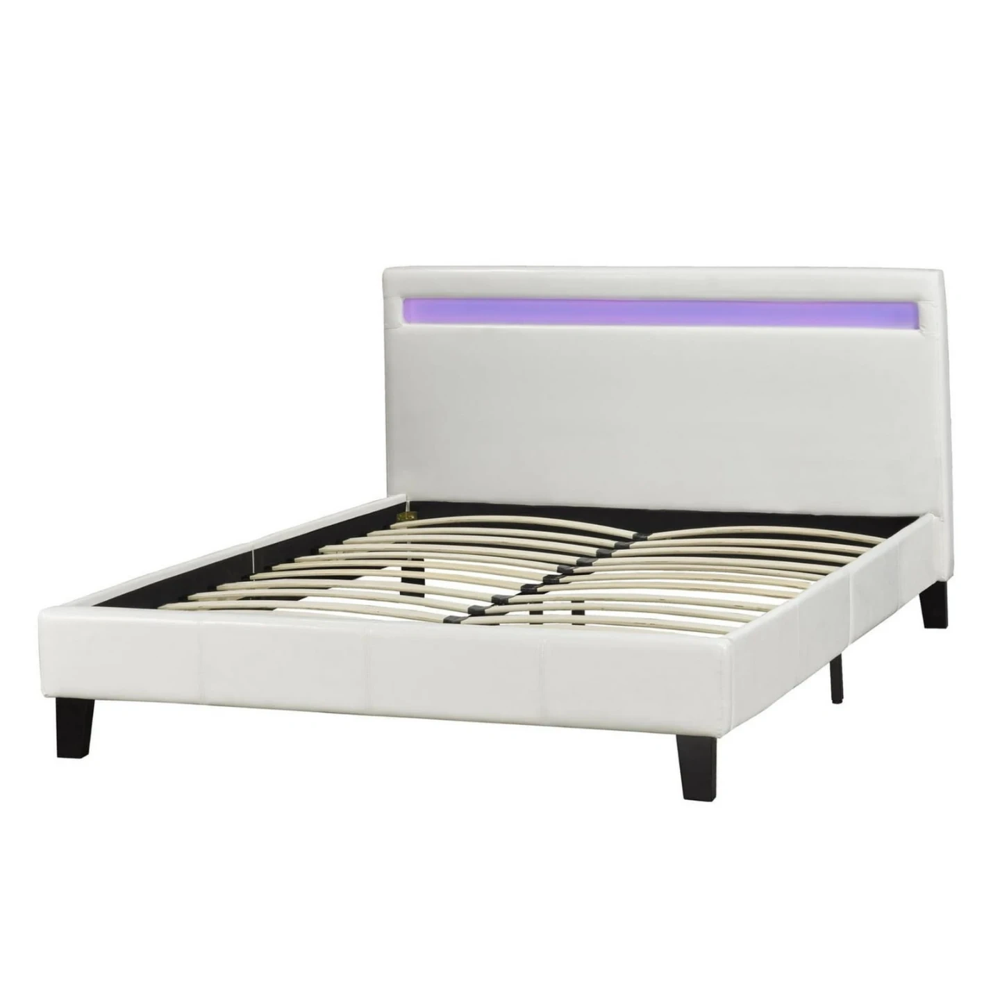 Modern white faux leather bed frame featuring a built-in LED headboard with multiple colour options. Slatted base provides mattress support. Simple assembly required.Pillow top queen mattress
