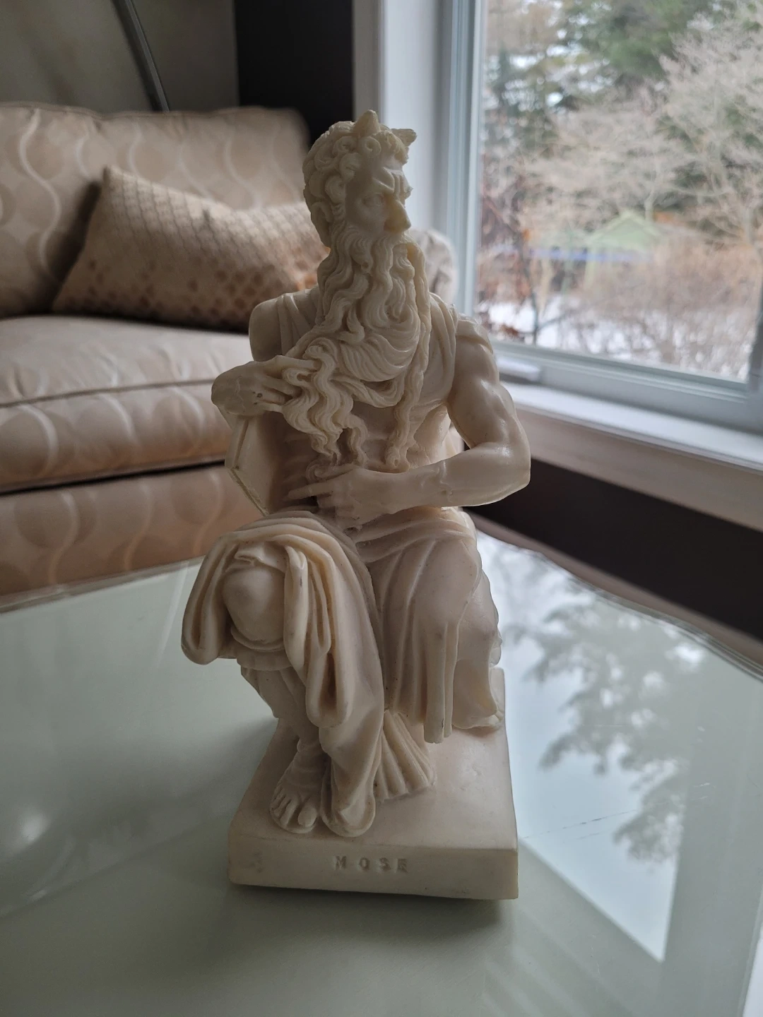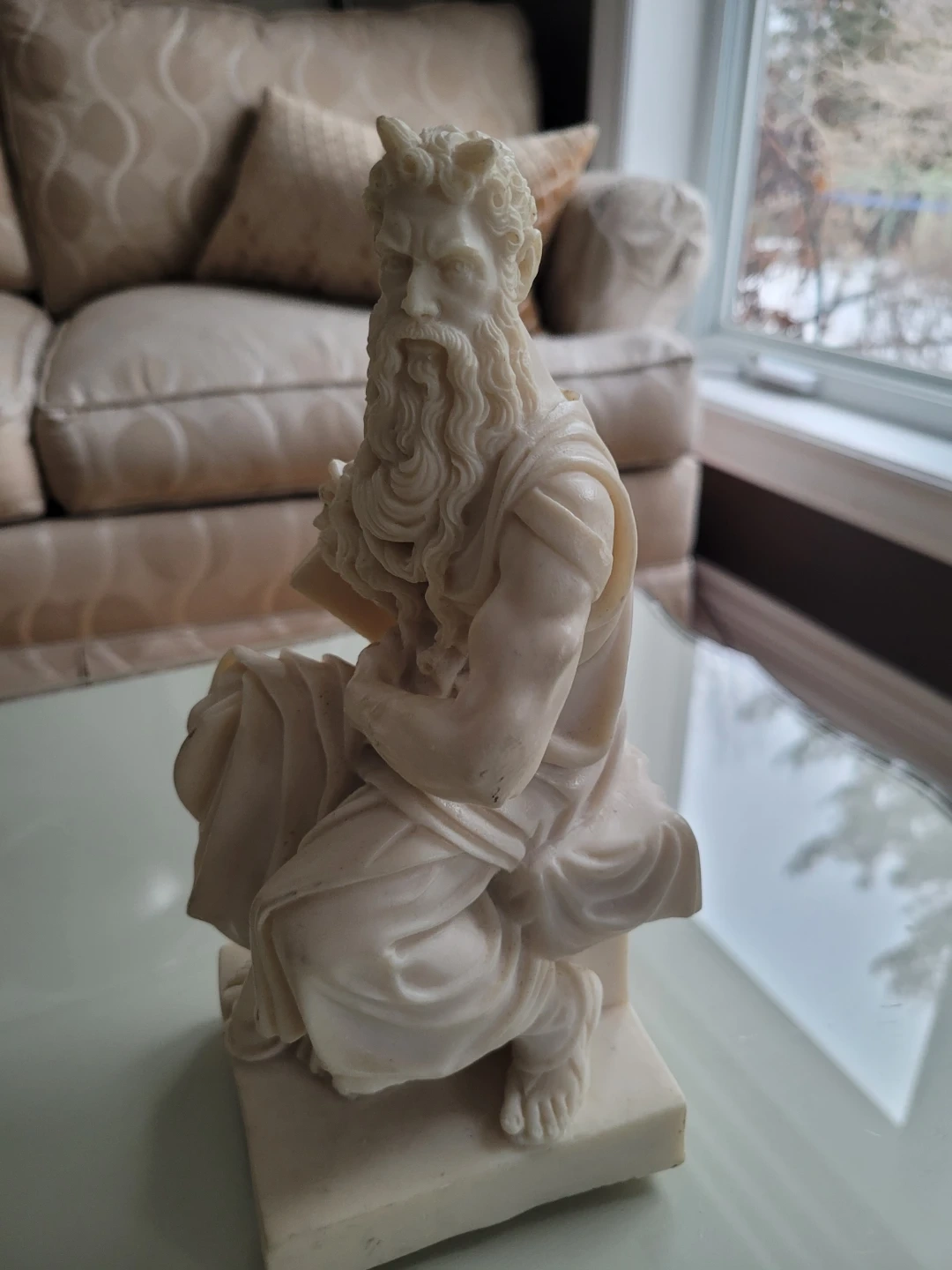 This is a vtg statue of Horns of Moses. It appears to be made of a resin or alabaster like material--heavy. The inscription "MOSE" is visible on the base, he is carrying a book, probably the 10 commandments.