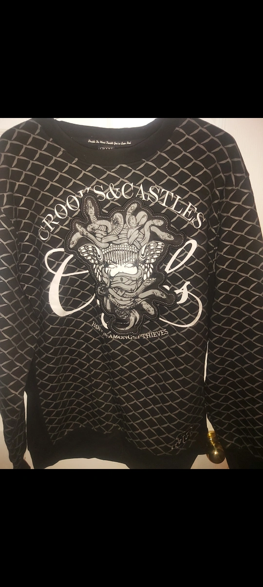 Black and grey crewneck sweatshirt. Features a Medusa graphic and a geometric pattern. Long sleeves. new condition.