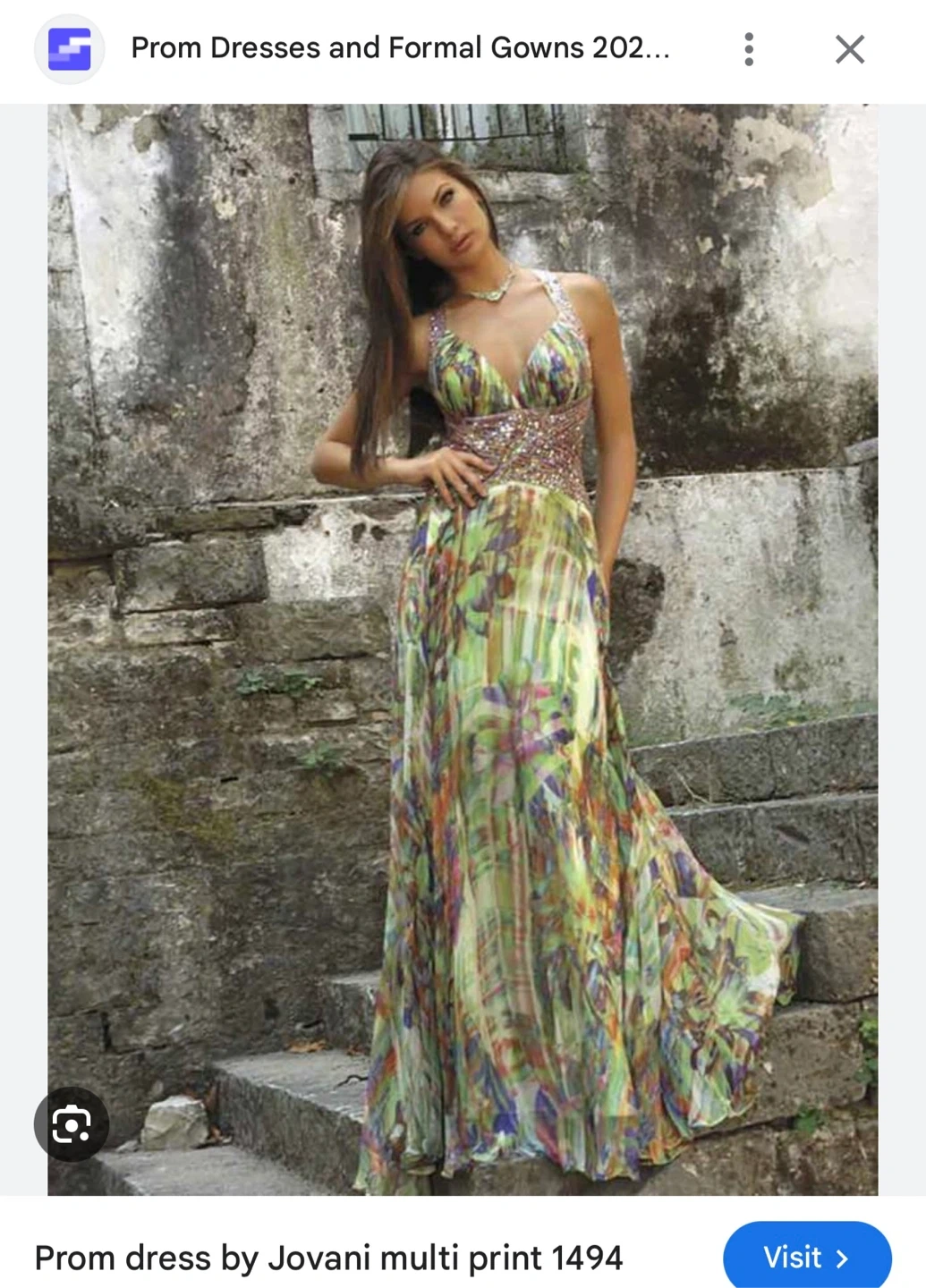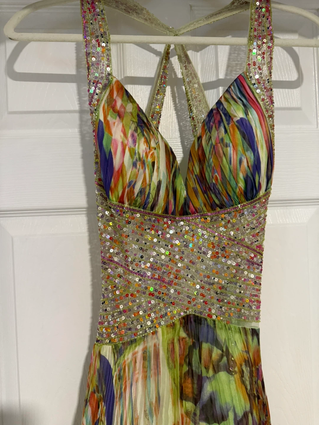 This stunning maxi dress features a vibrant, abstract print with intricate beadwork along the bodice and straps. It has a flattering halter neckline and a flowing, pleated skirt. Perfect for prom or a special occasion.