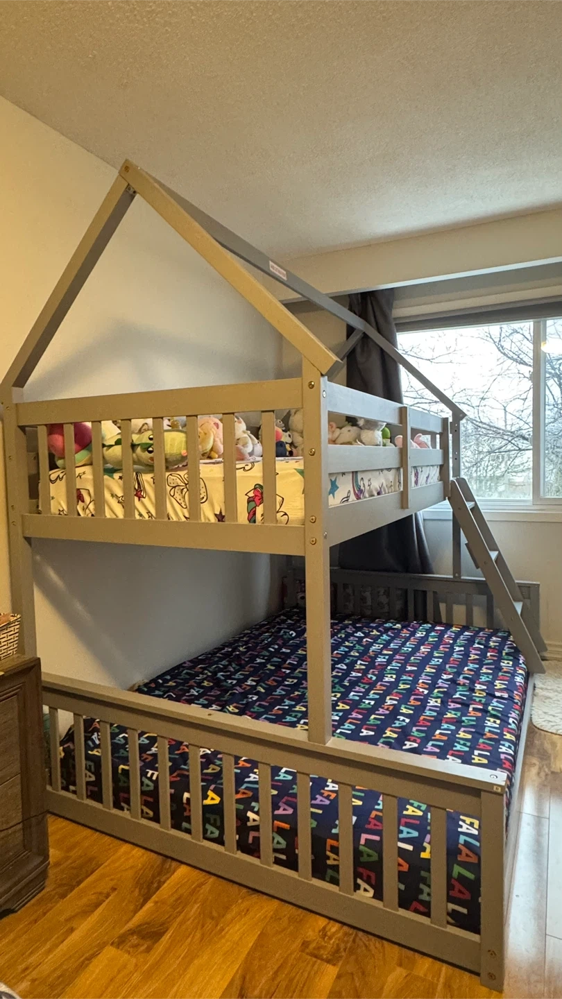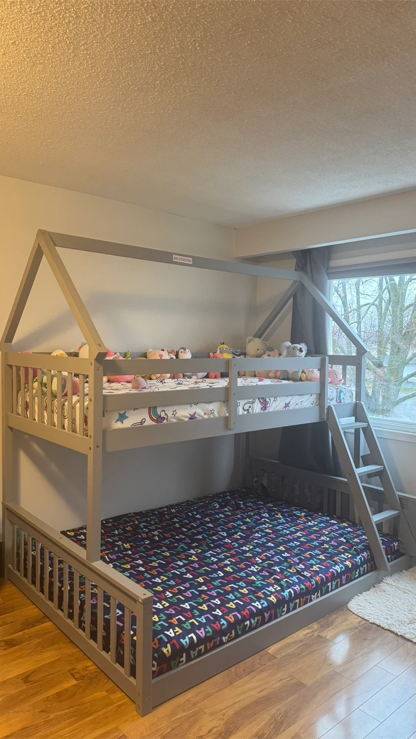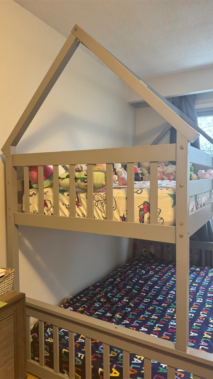 Adorable house-style bunk bed in grey — the roofline frame gives it a unique, playful look that kids absolutely love.