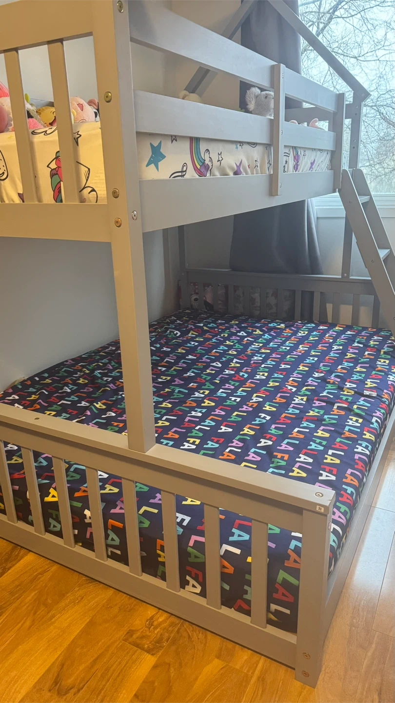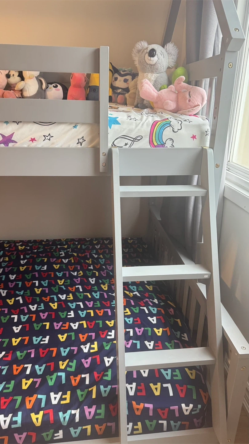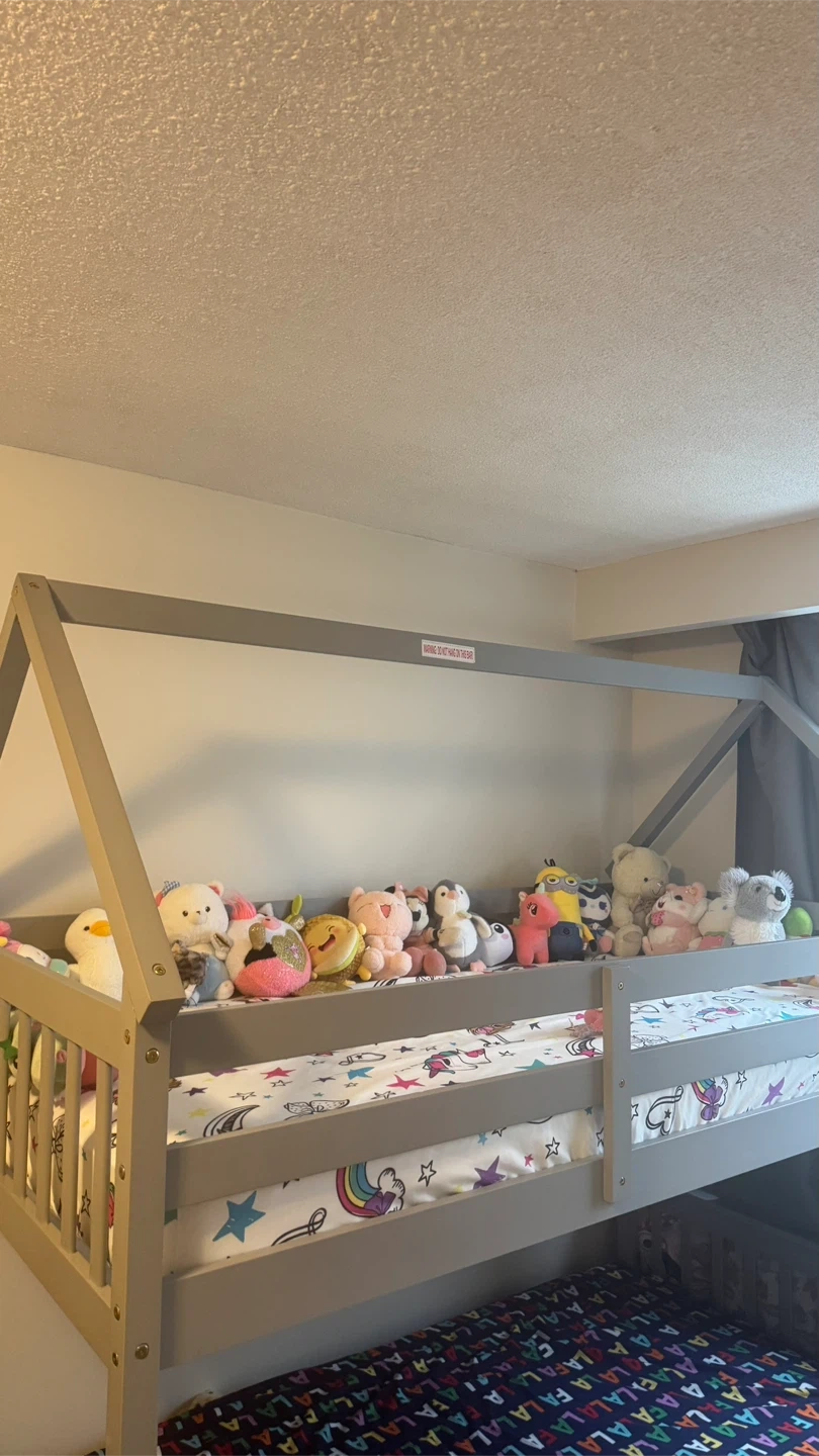 Adorable house-style bunk bed in grey — the roofline frame gives it a unique, playful look that kids absolutely love.