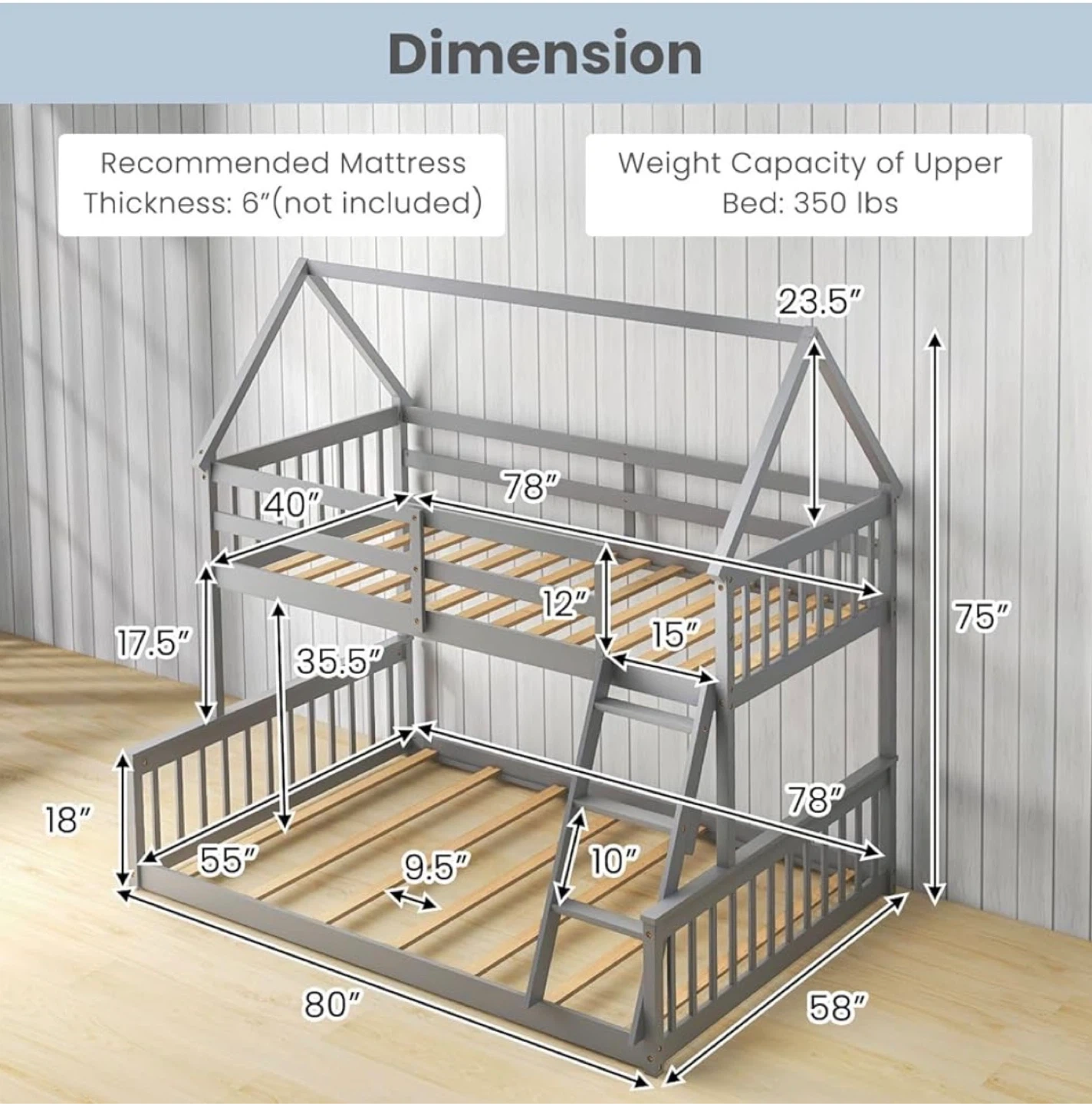 Wood Twin Over Full House Bunk Bed with Built in Ladder, Solid Pine Wood Bunk Bed Frame with Safety Guardrails, House Bunk Bed Frame for Kids, Teens, Juniors, No Box Spring Needed (Grey)