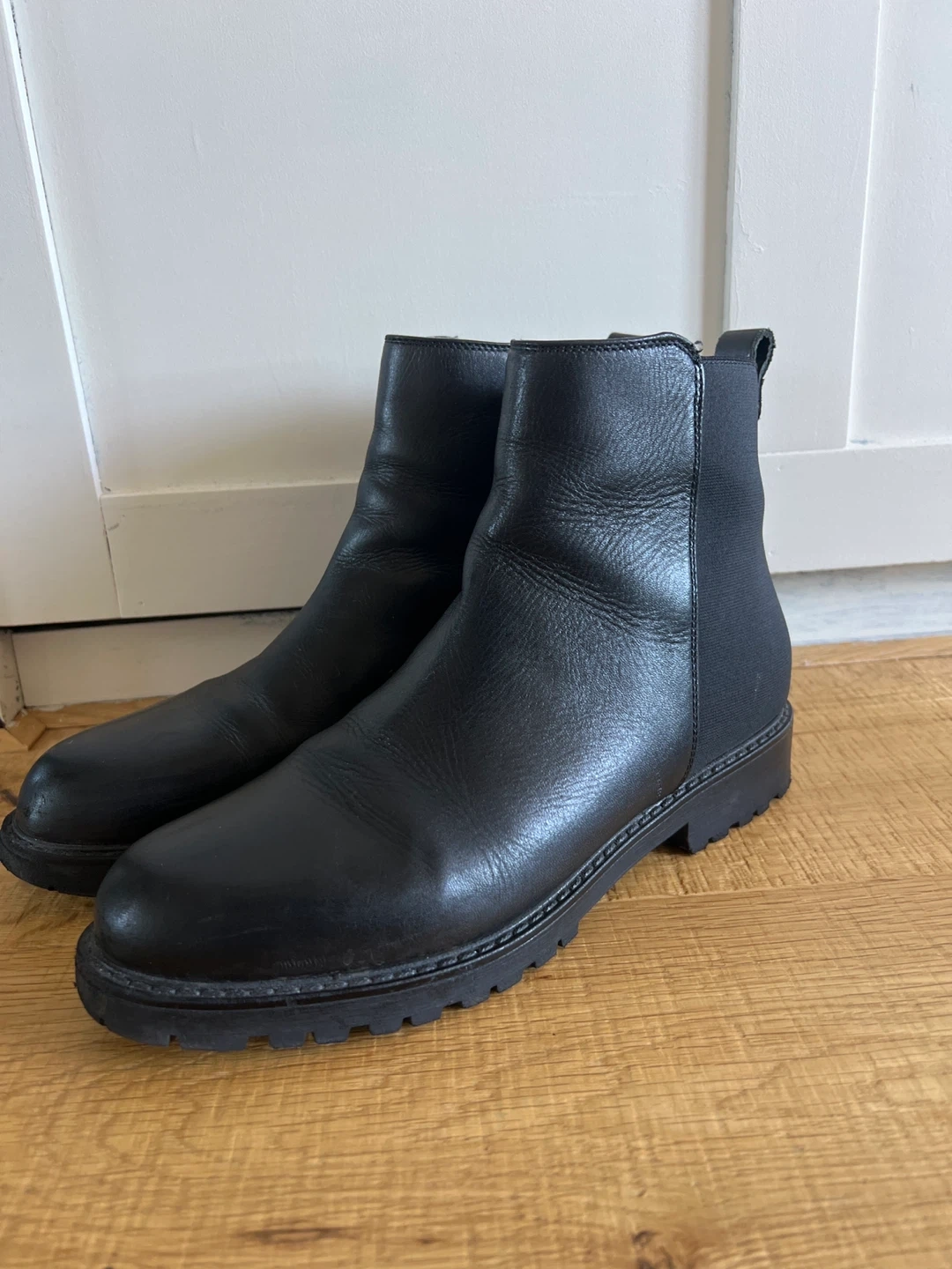 Classic black leather Chelsea boots with elastic side panels. Features a durable sole for everyday wear. Perfect for pairing with jeans or dresses!