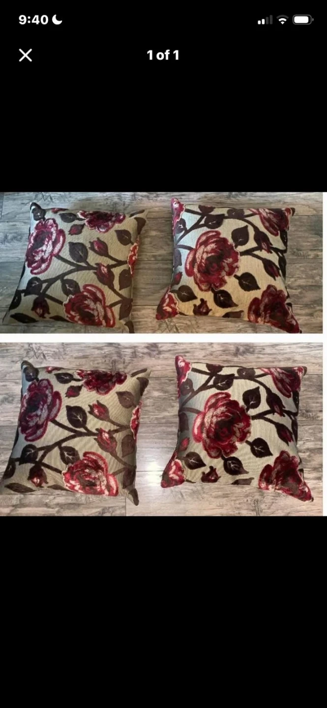 Set of four square throw pillows featuring a repeating floral pattern in burgundy and brown on a beige background. It's a nice way to add a touch of colour to your sofa or accent chair. Material appears to be a woven fabric.