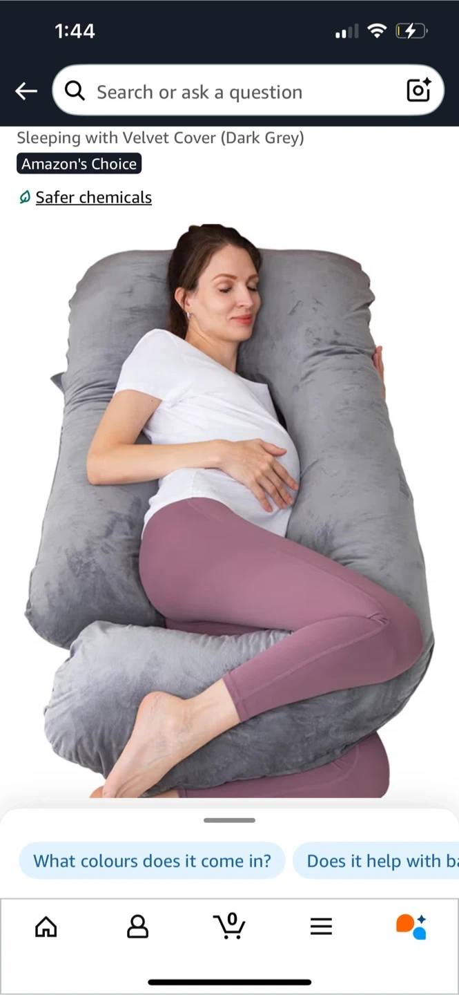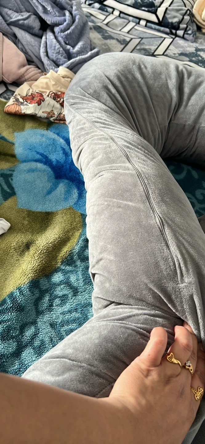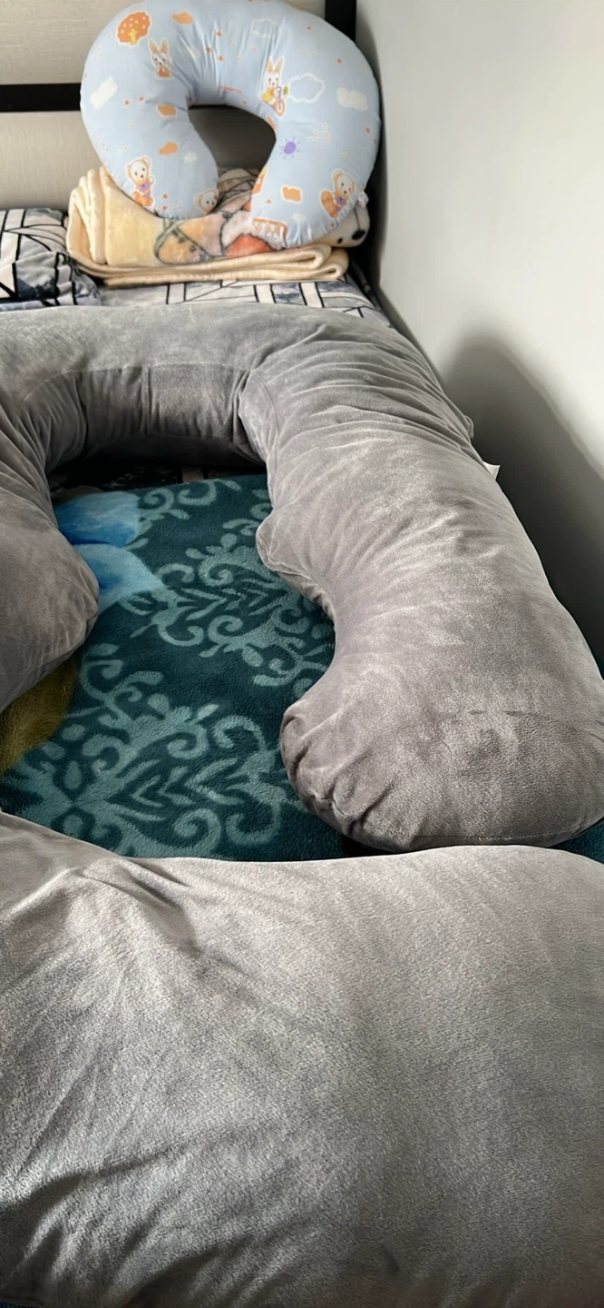 This U-shaped pillow is covered in soft velvet and is grey. It's designed for comfort during pregnancy. The pillow is a good size for support.