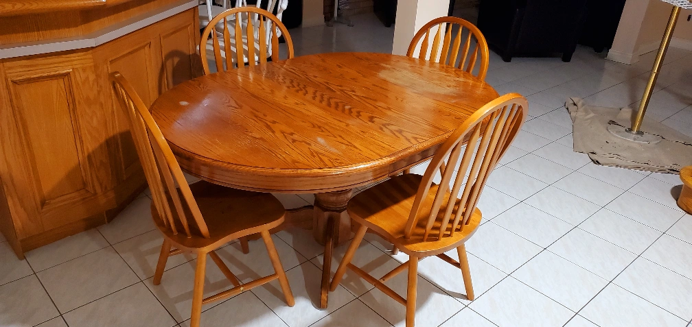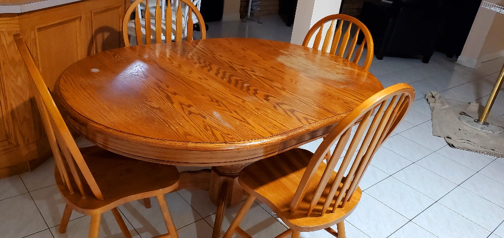 Beautiful oval dining table. Four matching chairs. Solid wood construction. Excellent for smaller spaces. Some minor wear.