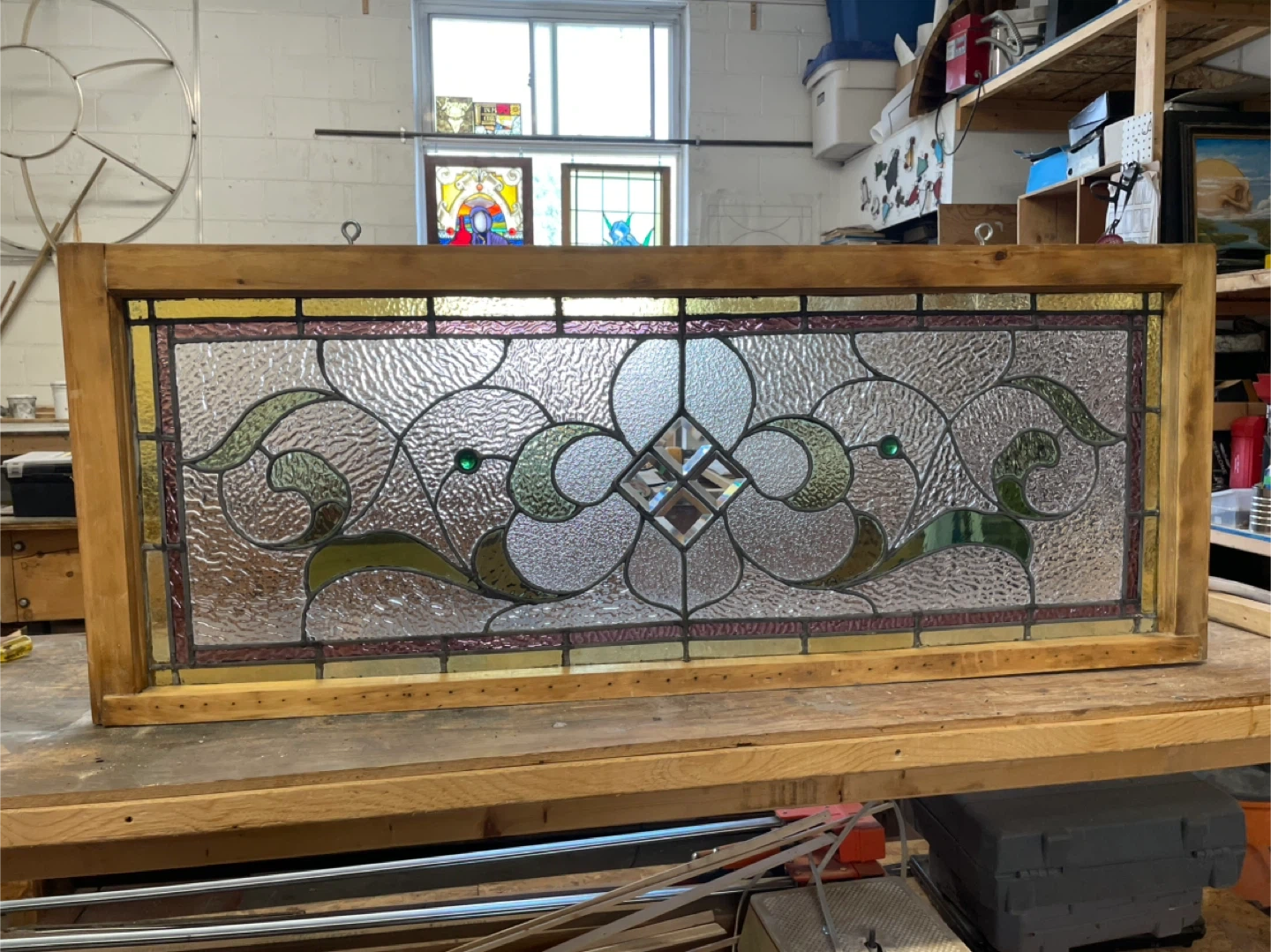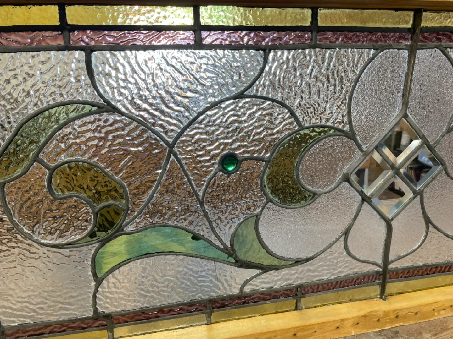 A restored beautiful stained glass window panel with a wooden frame and 2 eye hooks for hanging. The glass features a floral design with green accents. It's in great condition and ready to add a touch of elegance to your home