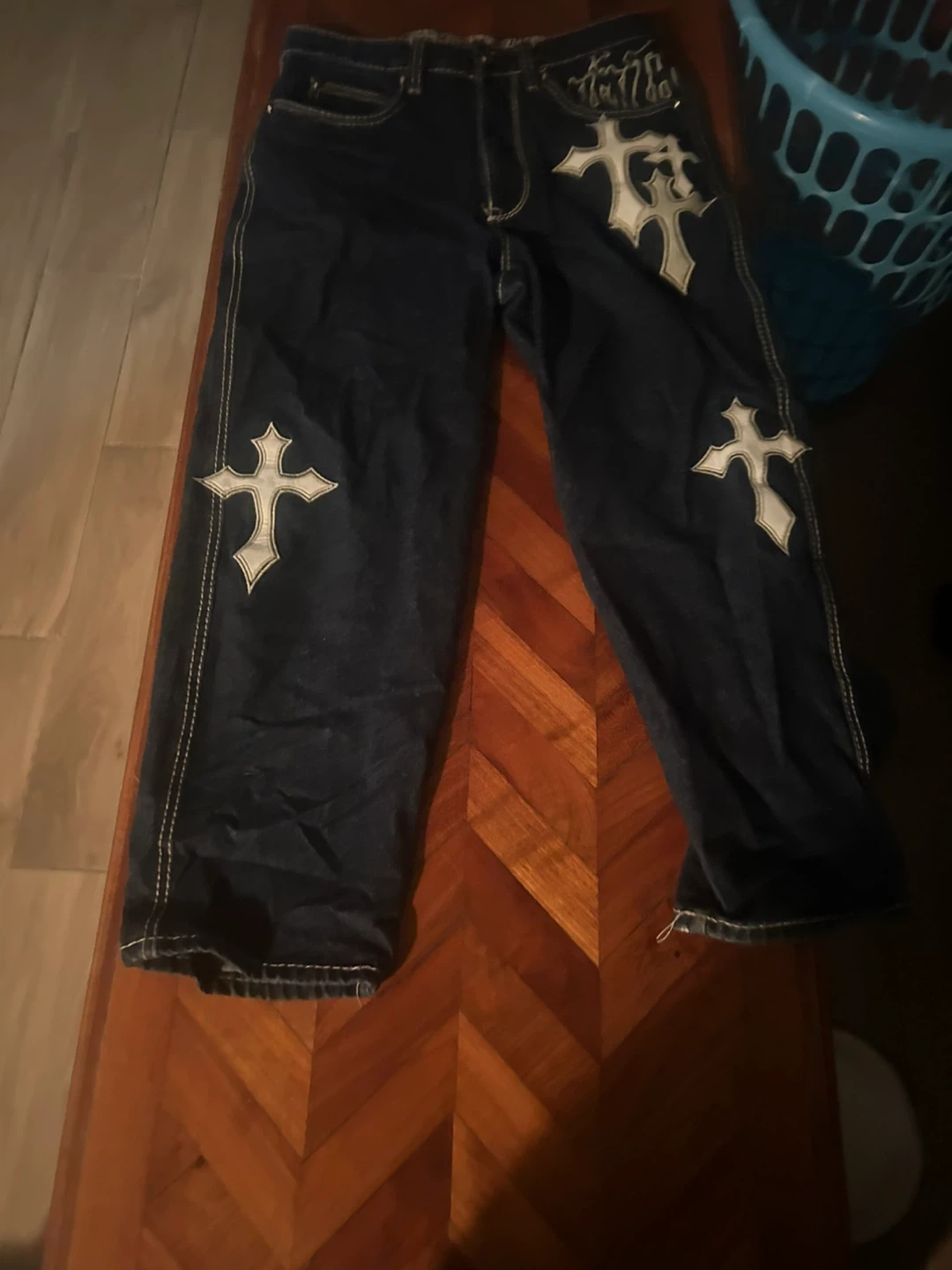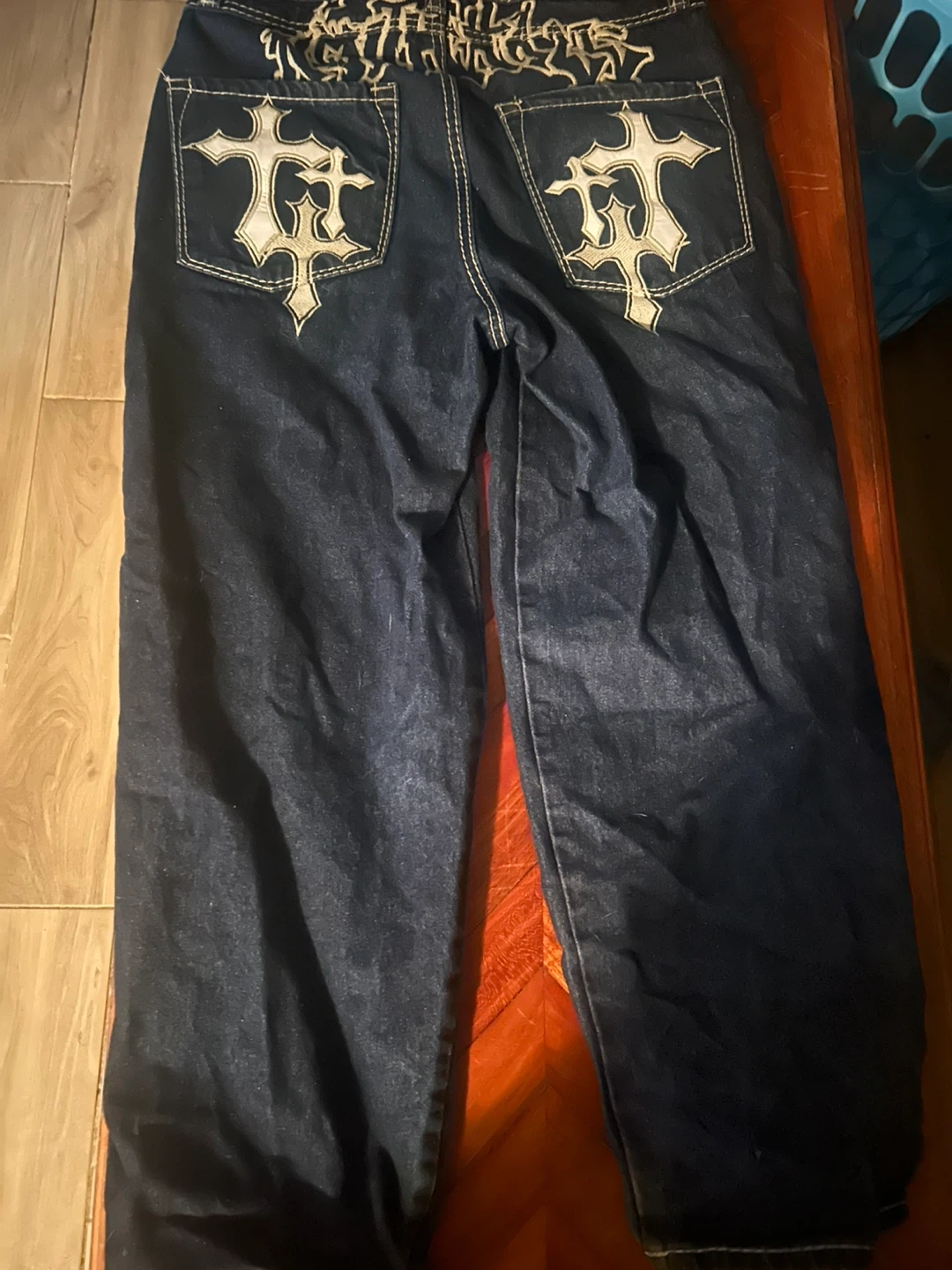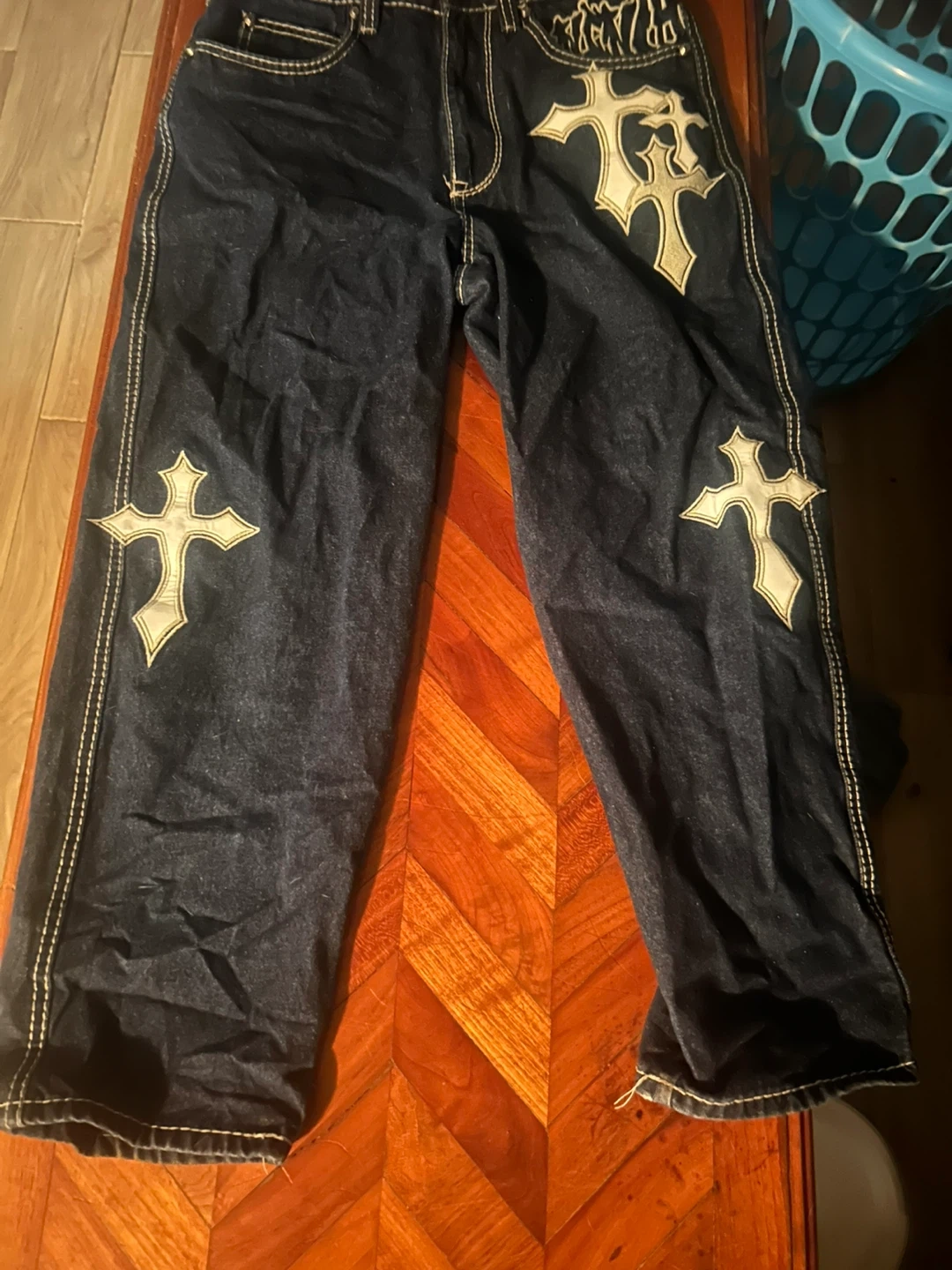 These dark wash denim jeans feature bold cross embroidery on the front and back pockets. They have a size 28 waist. The inner lining has a unique graphic print. With a 34 length.