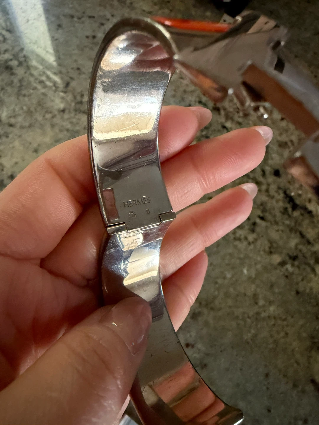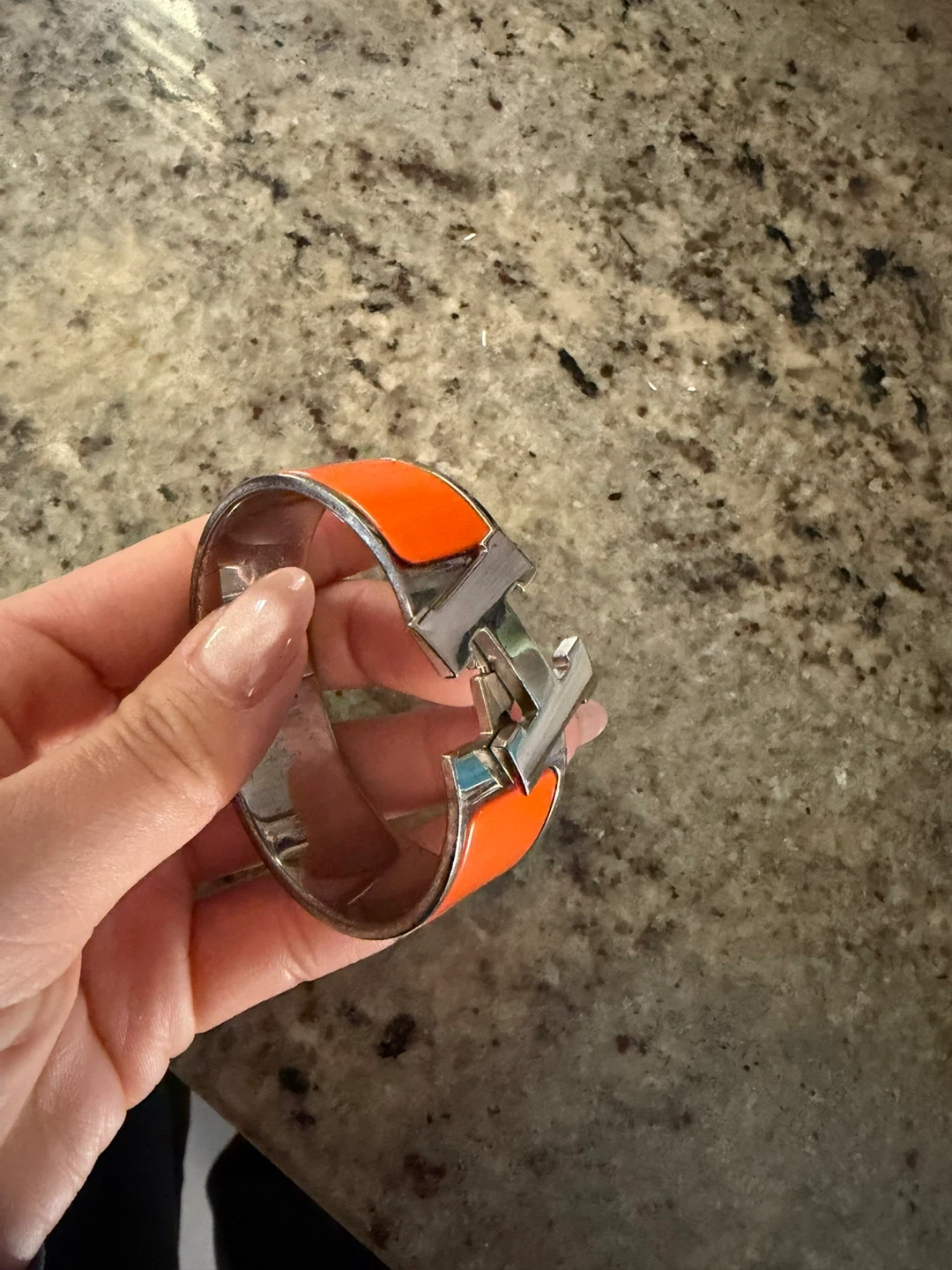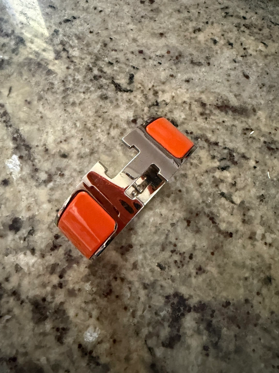 A stylish Hermès Clic Clac H bracelet in silver and orange enamel. It features the iconic H clasp. This elegant accessory adds a pop of colour to any outfit. Purchased Hermes’ on Bloor st.