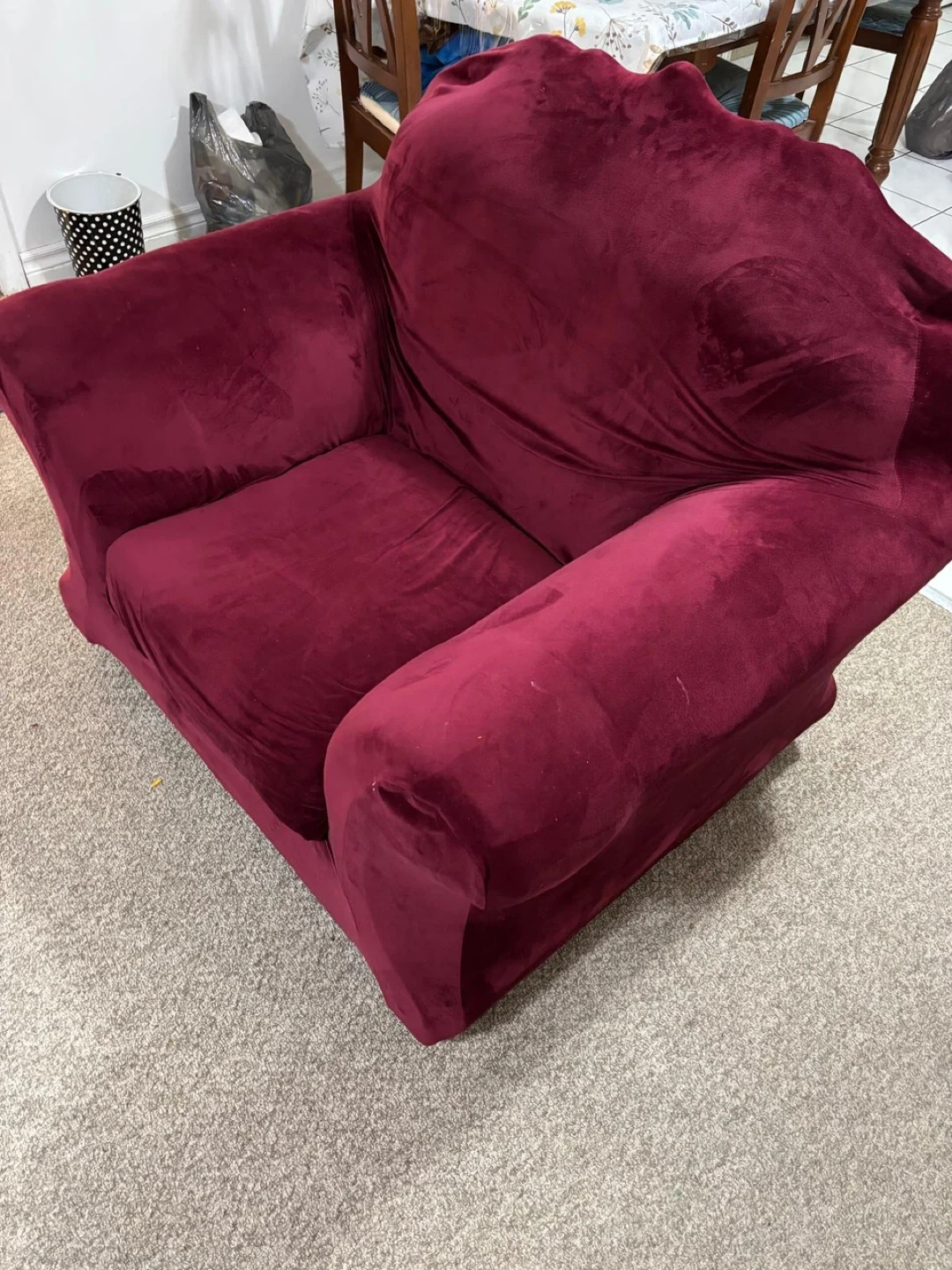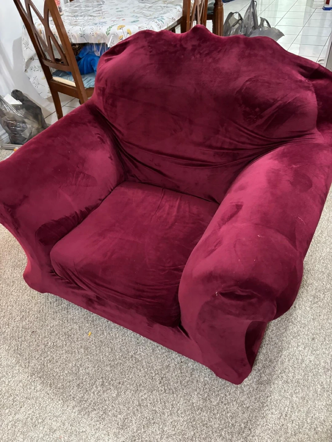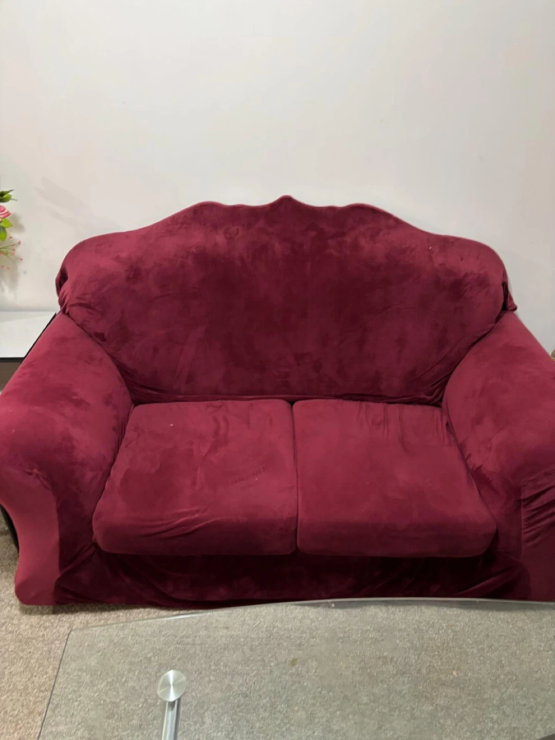 This burgundy velvet sofa offers a plush seating experience. It's designed with comfortable cushions and elegant rolled arms. Adds a cozy touch to any living space!