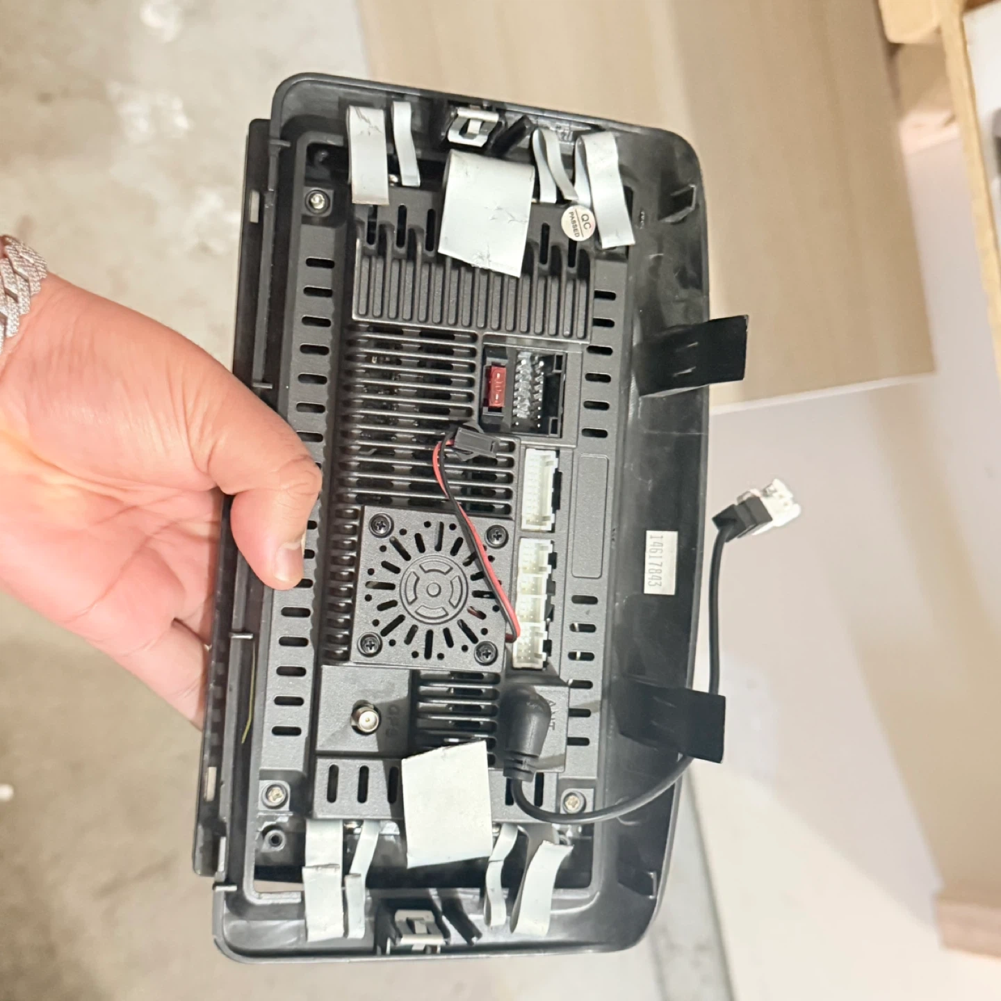 This is a car stereo head unit with a touchscreen display. It features a built-in fan for cooling and various connection ports on the back. Perfect for upgrading your car's audio system!