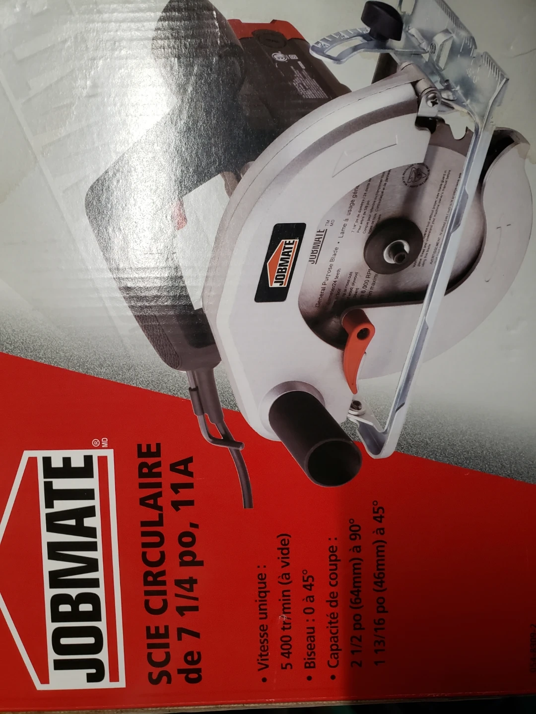 This is a new Jobmate circular saw. It features a no-load speed of 5400 RPM. The bevel capacity is 0 to 45 degrees. It has a cutting depth of 2 1/2" (64mm) at 90 degrees and 1 13/16" (46mm) at 45 degrees.