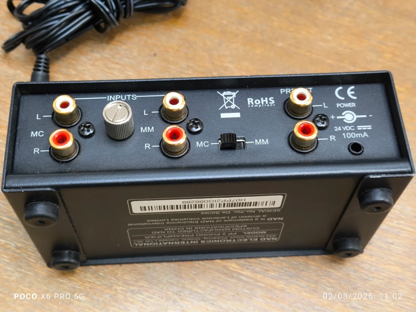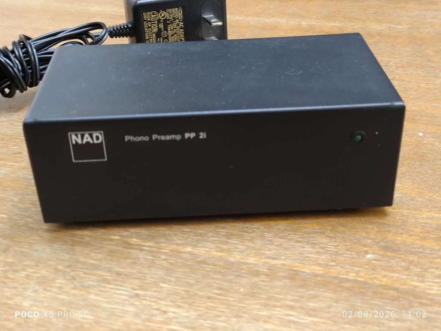 NAD PP 2i phono preamplifier with power adapter. It supports both Moving Magnet (MM) and Moving Coil (MC) cartridges. This unit is compact and black.