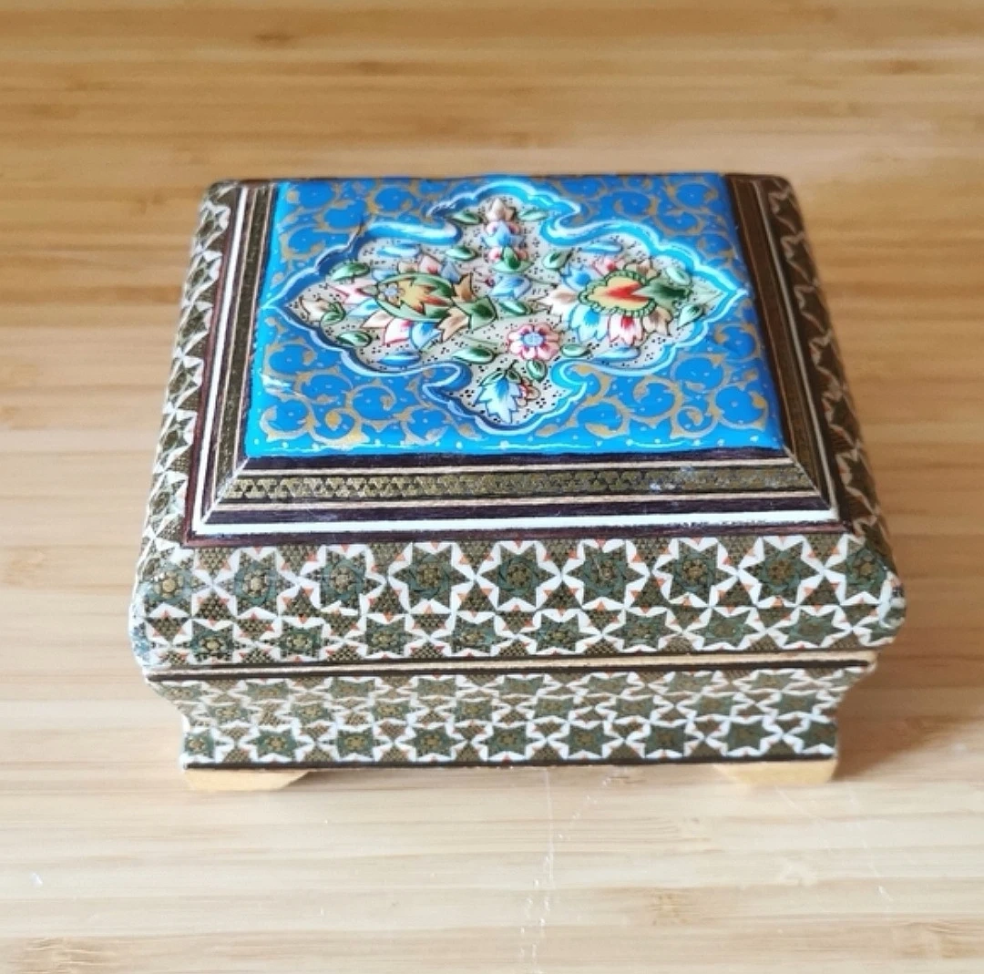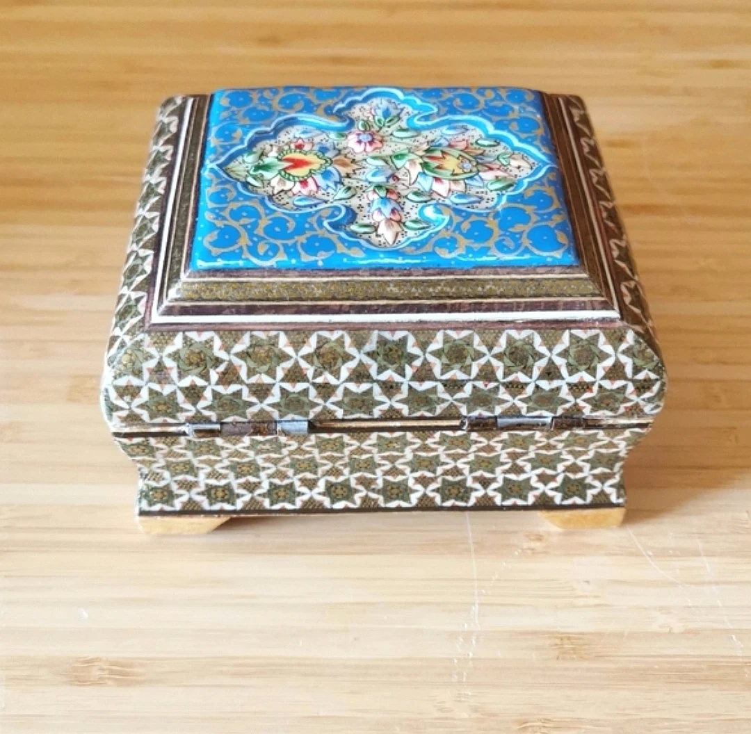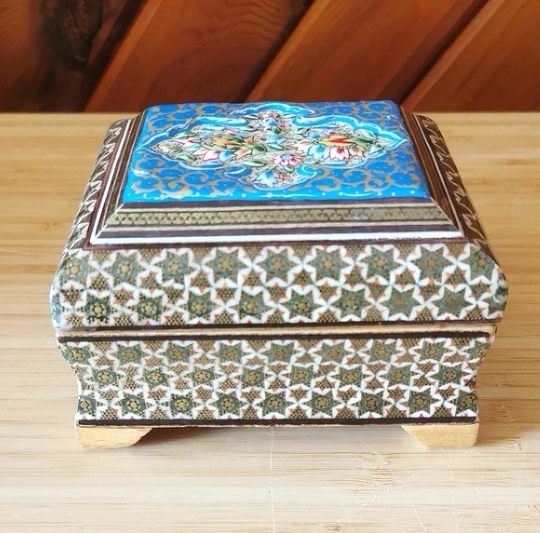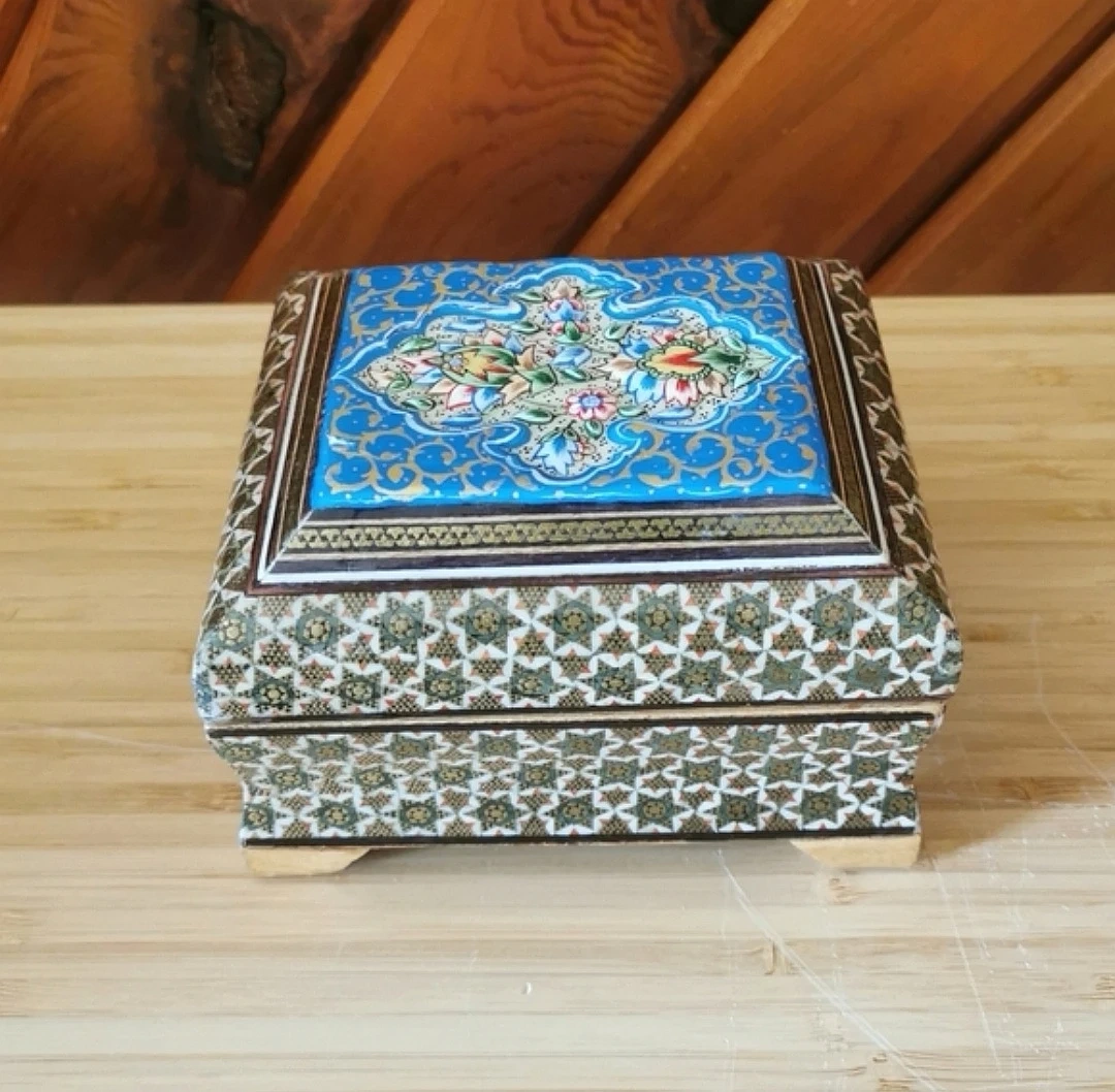 Beautiful vintage Persian Khatamkari jewelry box featuring intricate geometric inlay and a hand-painted floral lid.