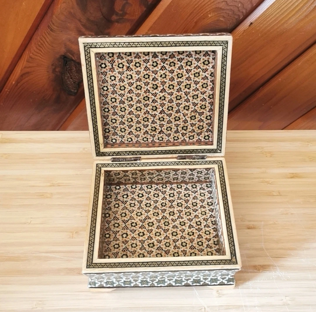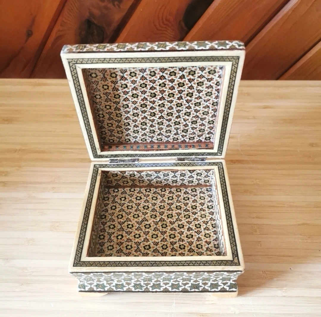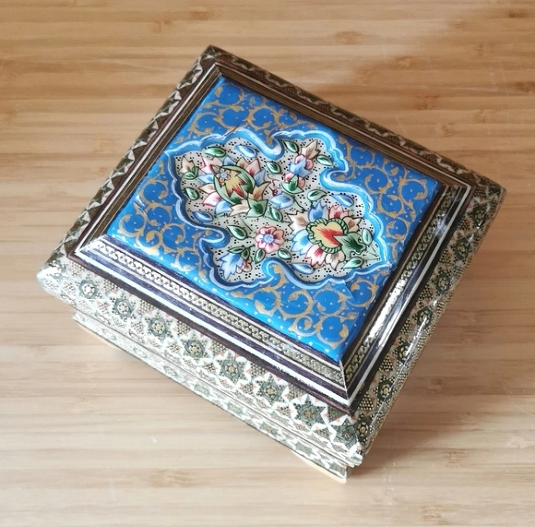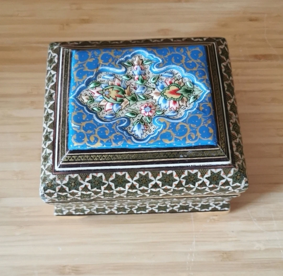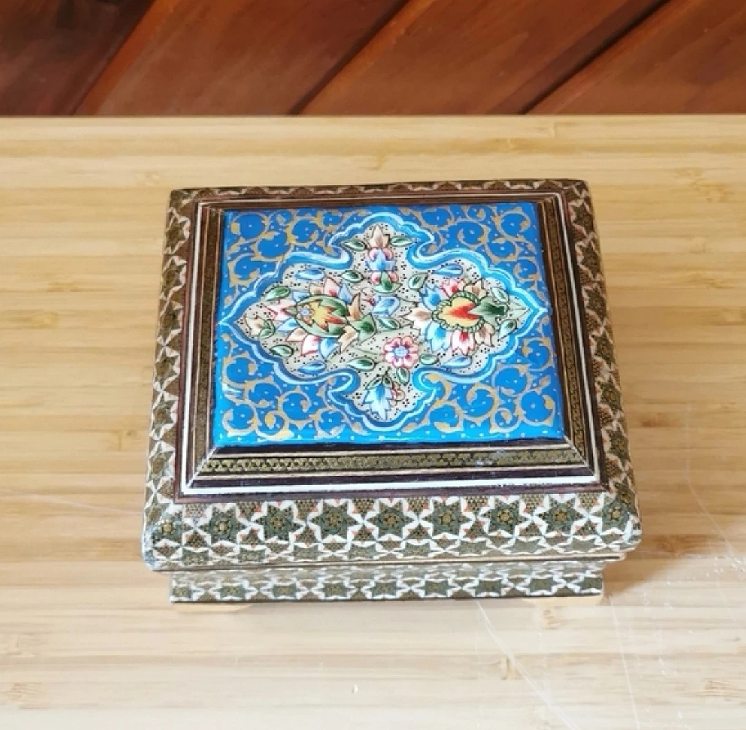 Beautiful vintage Persian Khatamkari jewelry box featuring intricate geometric inlay and a hand-painted floral lid.
