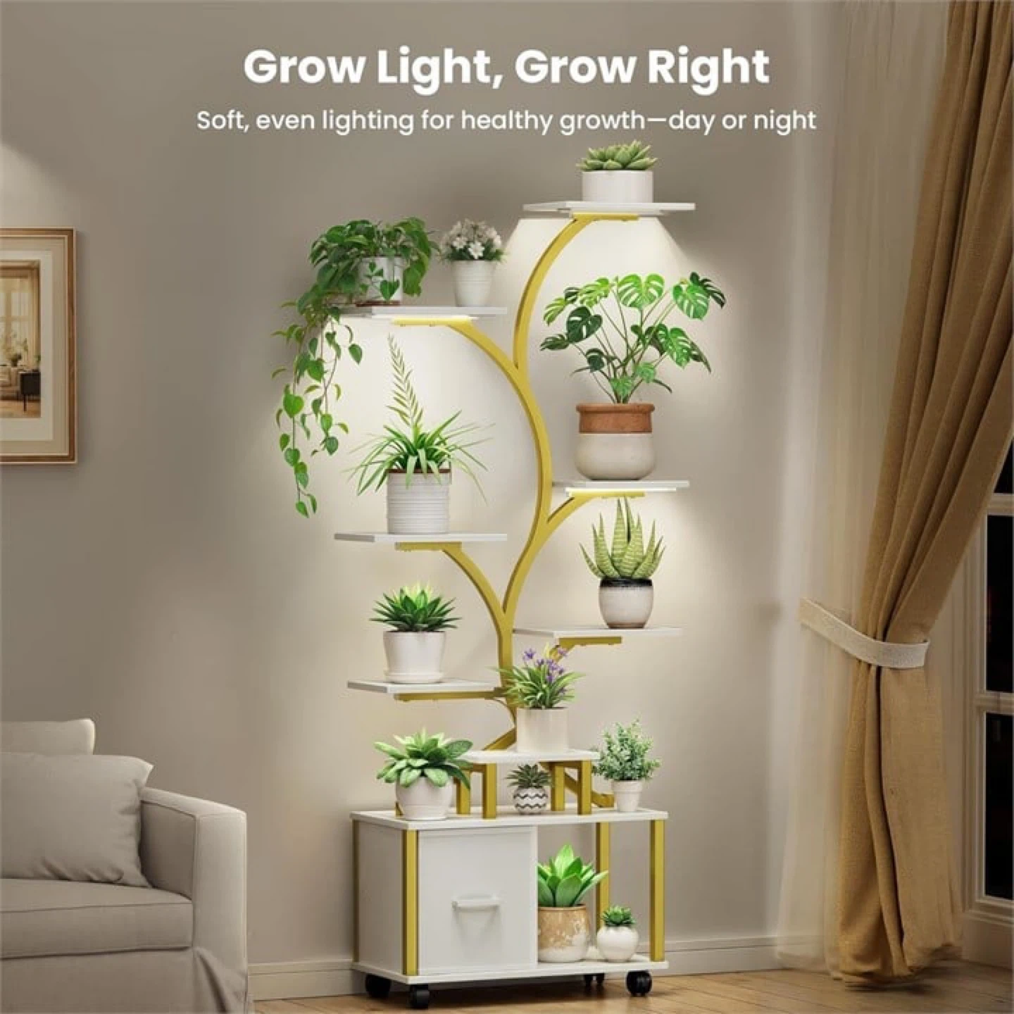 I'm selling a Gujjiam plant stand with a built-in grow light. It's perfect for both large and small plants, helping them thrive day or night. The stand features a white and gold finish, adding a touch of elegance to any room. It also includes anti-tip fittings for improved structural strength. The dimensions are approximately 12.2" x 10.6" at the base, with shelves ranging from 7.8" x 11.8" to 18" x 11.8".