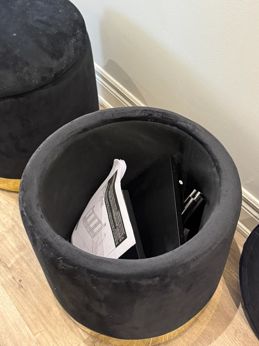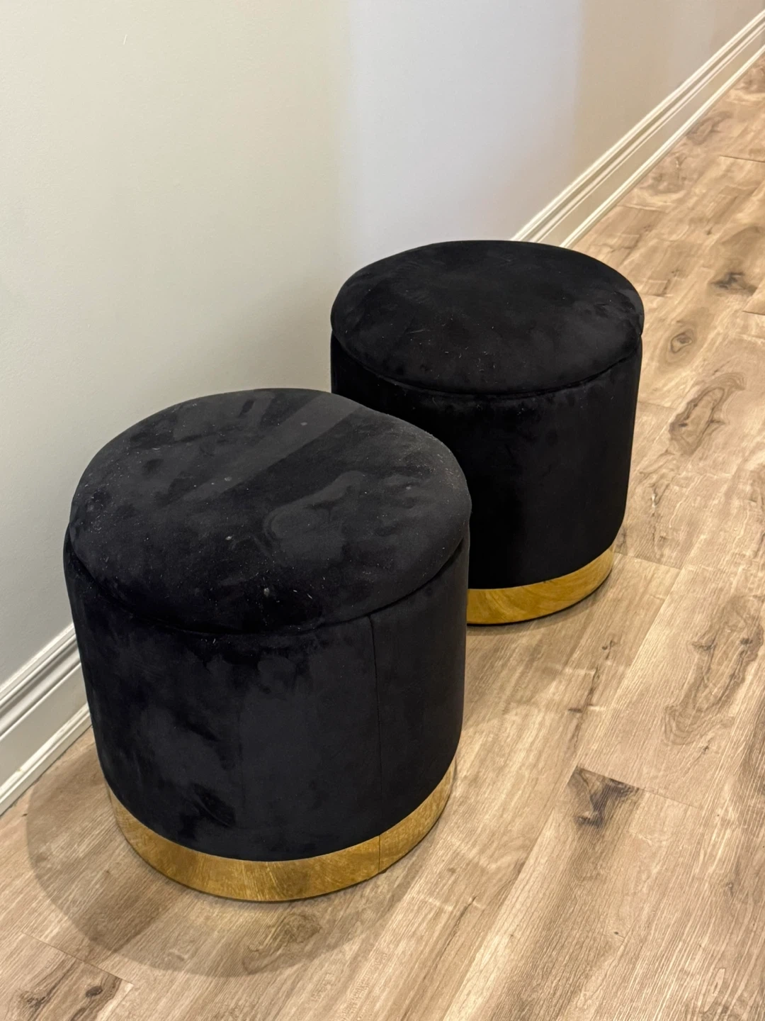 These round storage ottomans are upholstered in soft black velvet with a stylish gold base. They offer hidden storage space inside, perfect for small items. Includes assembly instructions.