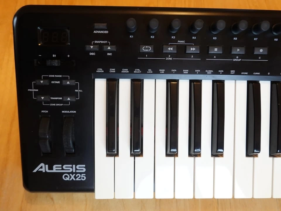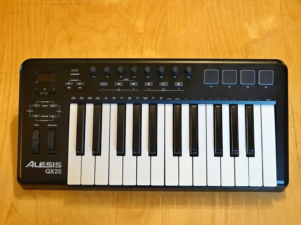 Alesis QX25 - Two-octave (25-key) touch-sensitive (with Aftertouch) USB MIDI keyboard, with pitch and modulation wheels, record/playback functionality, transpose, four velocity-sensitive drum pads, and 8 programmable dials.