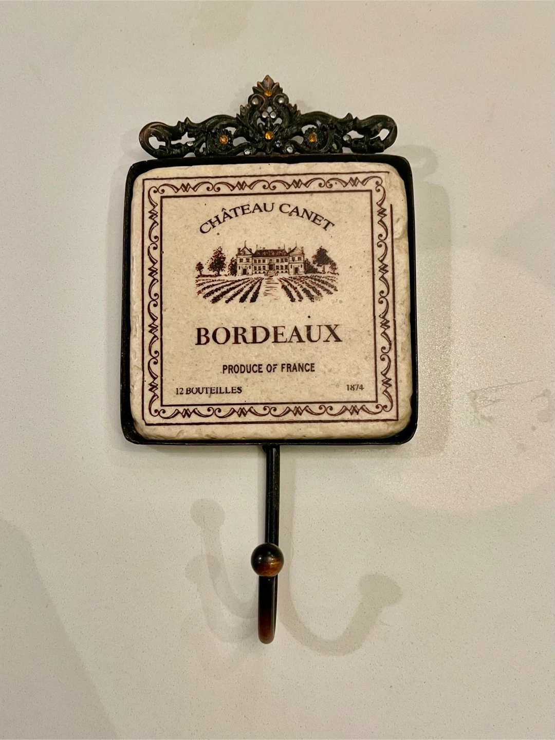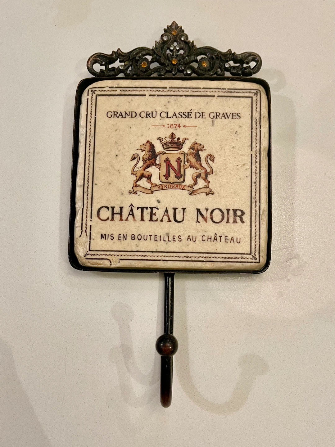Two decorative wall hooks featuring wine label designs! One says Château Canet Bordeaux and the other says Château Noir. They would add a touch of rustic charm to any room. Tile is 3 3/4 x 4 inches….overall 3 3/4 x 8 inches. Pick up location main intersection is Dundas & Trafalgar in Oakville.
