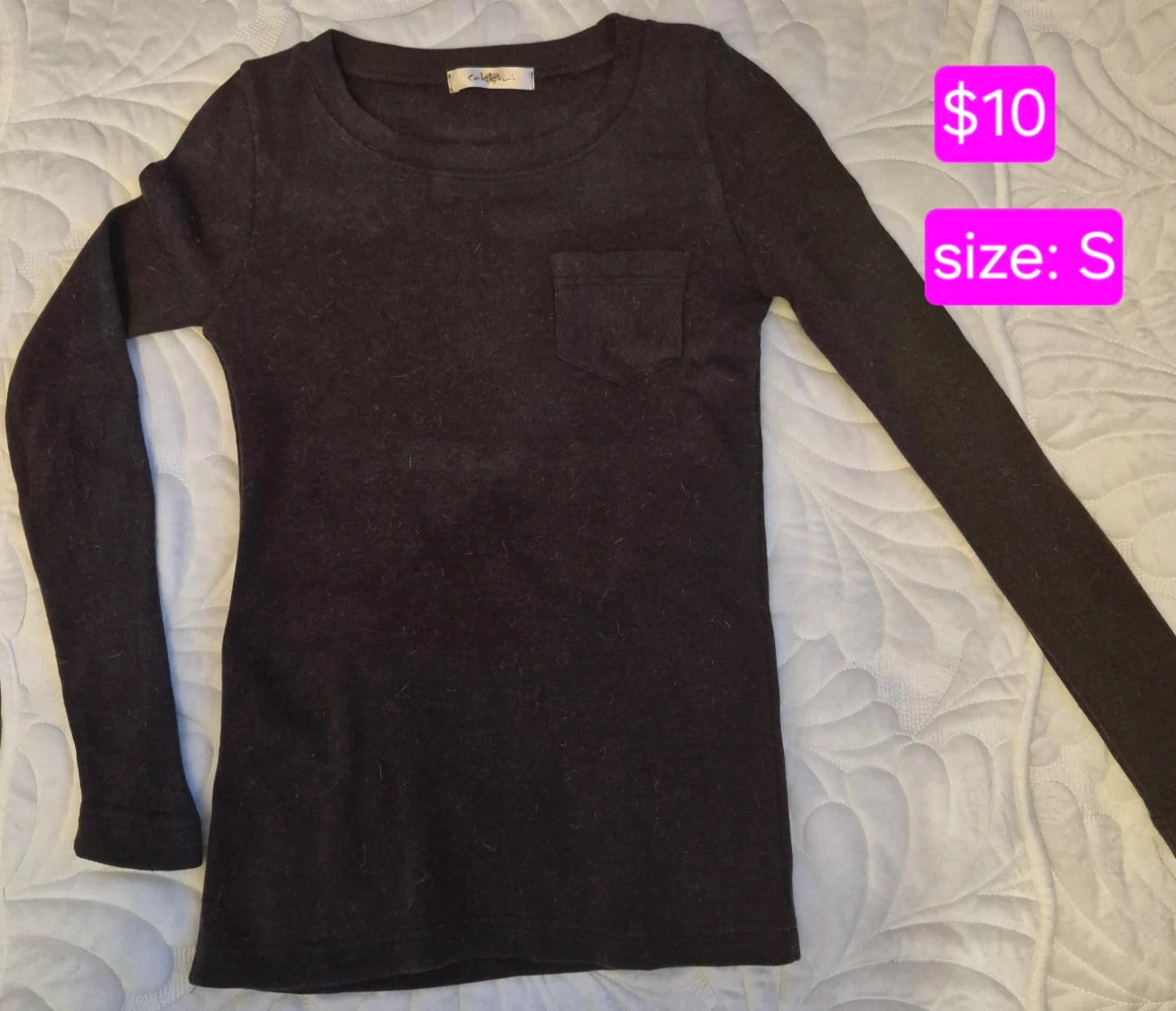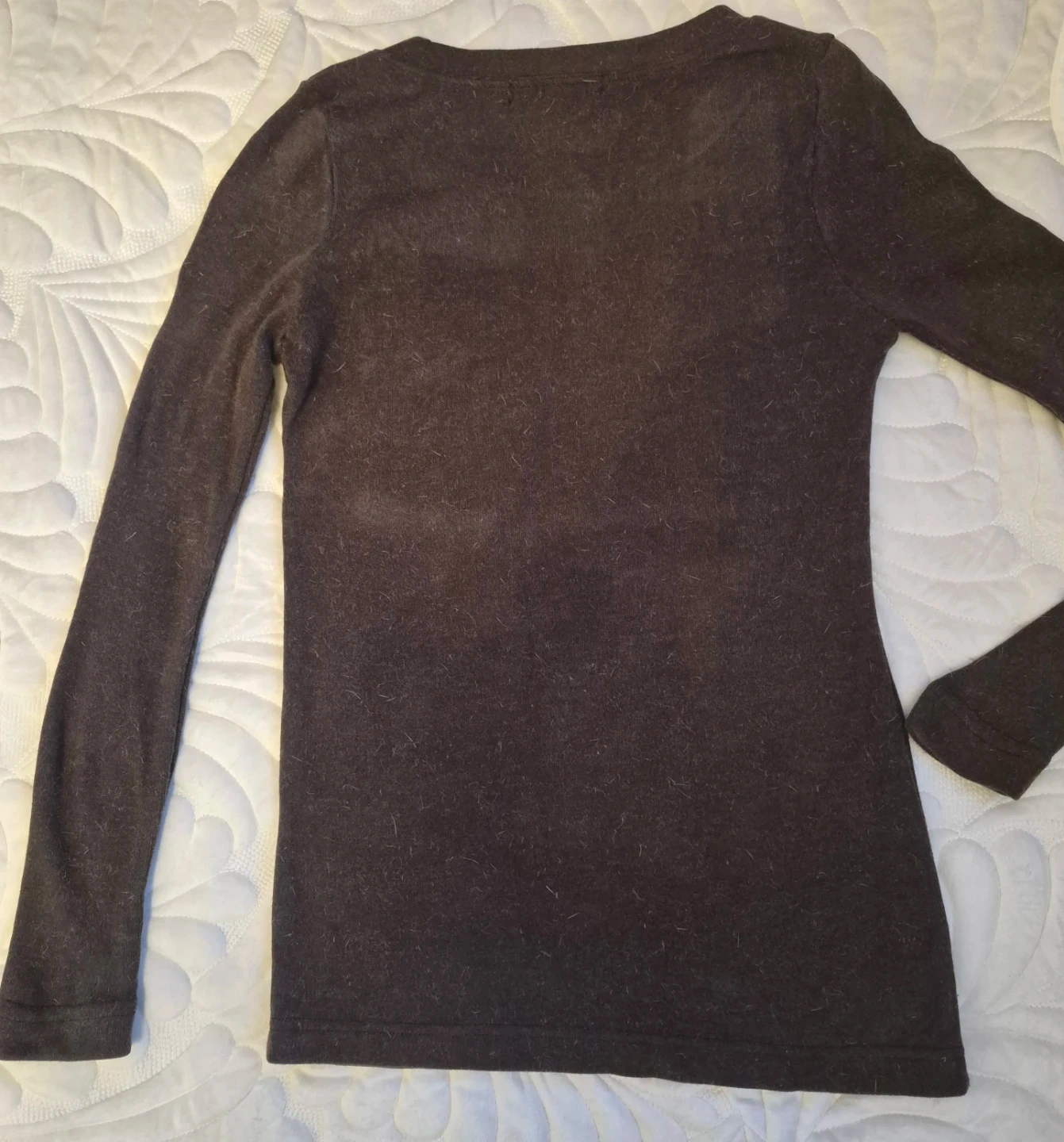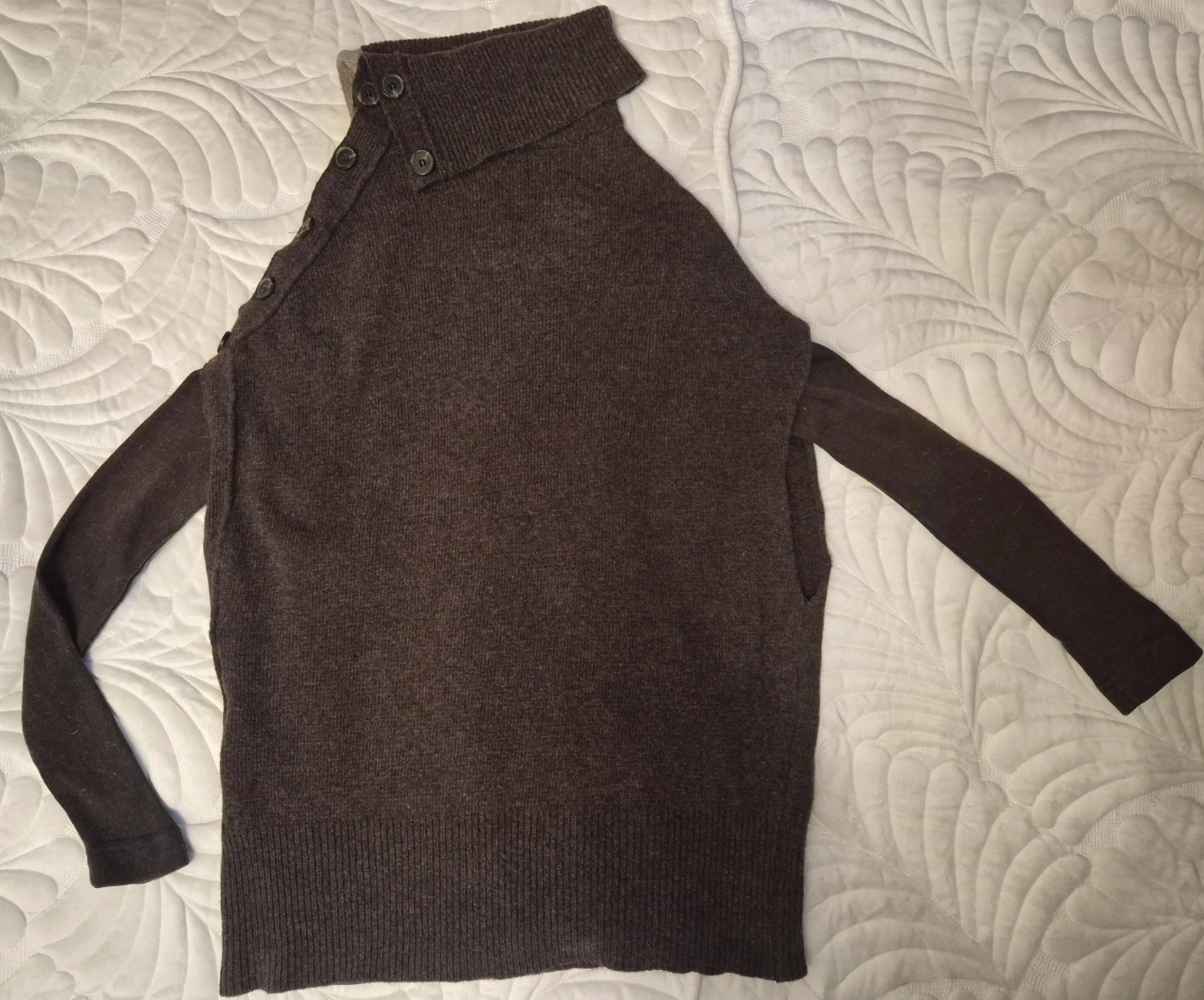 This dark brown sweater features a unique asymmetric button closure and a cozy sleeveless turtleneck design. It's crafted from a soft knit material, perfect for cooler weather. The size is S-M.