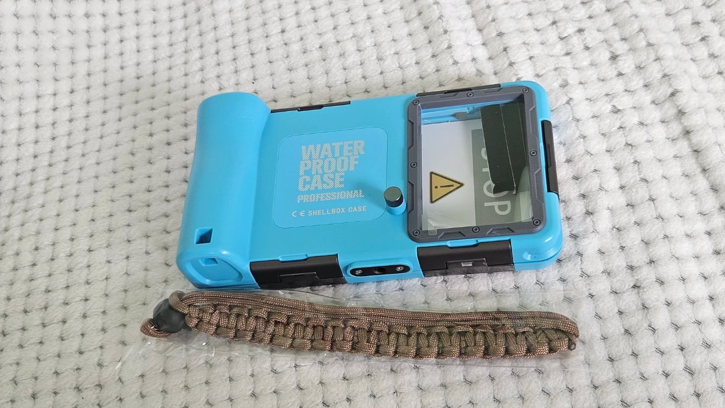 This is a blue SHELLBOX CASE waterproof diving case for phones. It's designed for protection during water activities. Includes a wrist strap.