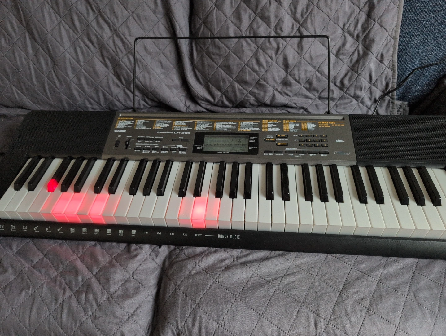 The Casio LK-265 is a 61-key portable keyboard designed specifically for beginners, using a visual lighting system to teach music. It serves as a transitional instrument that focuses on "instant gratification" to build confidence in new players. Comes with an adapter and it is minimally used.