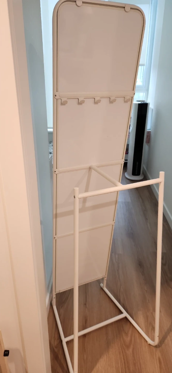 IKEA KNAPPER standing mirror in white. It's 48x160 cm, great for checking your outfit. The back has hooks for hanging items.