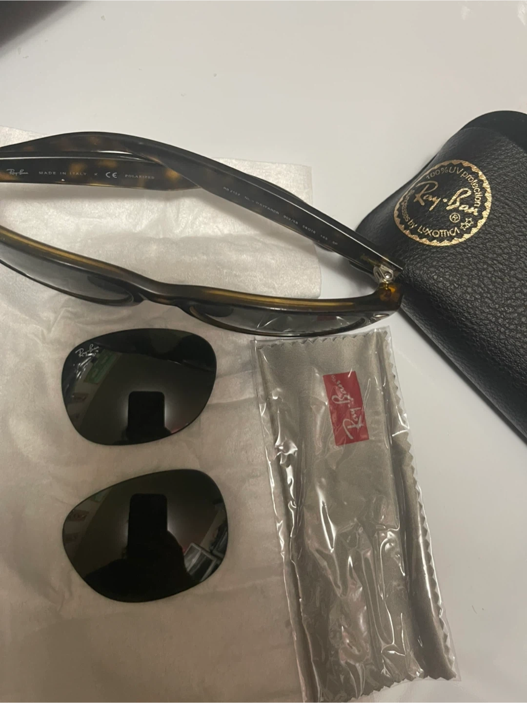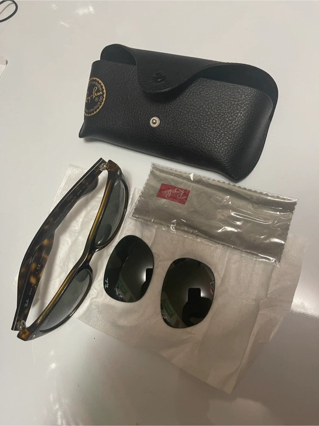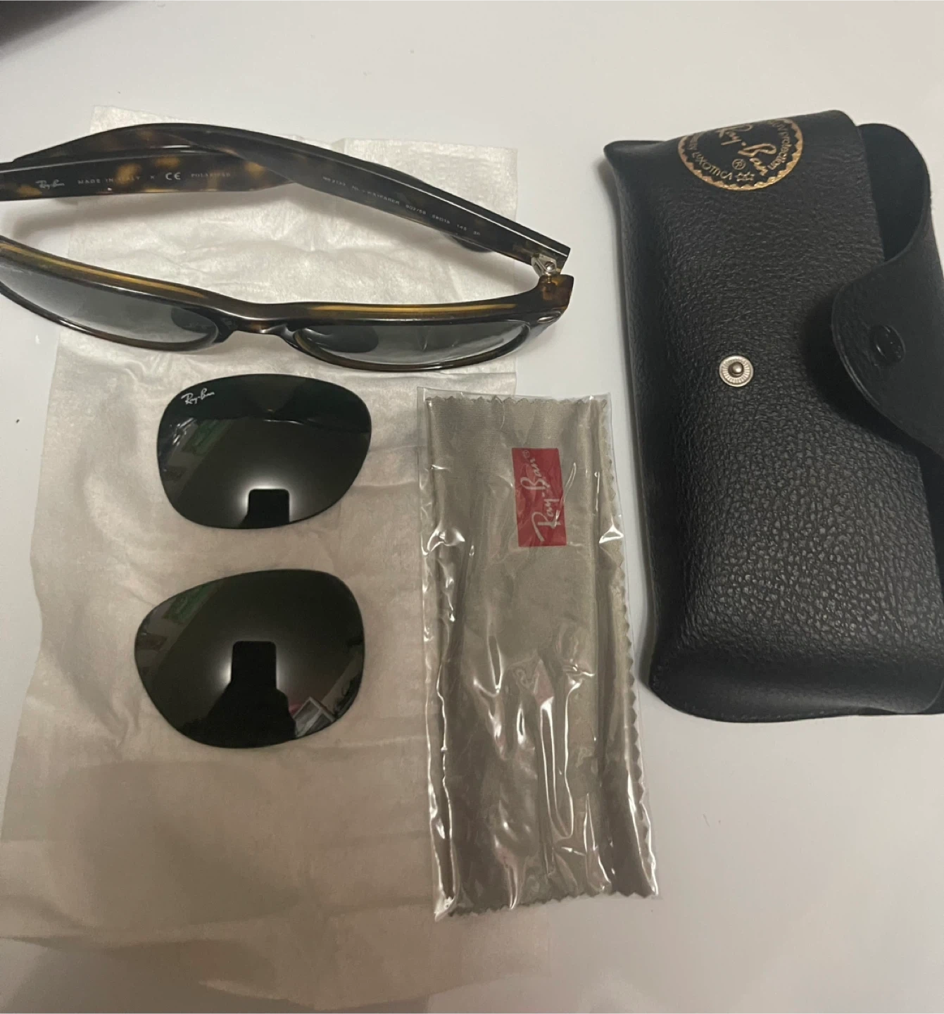 Ray-Ban RB2132 New Wayfarer sunglasses with tortoiseshell frames. Includes original case, cleaning cloth, and two sets of lenses. Polarized lenses offer great glare reduction. Brand new. Purchased a while ago. Misplaced them so never really got to use them. Looking to sell. Pick up Dundas and Spadina. Cash only.