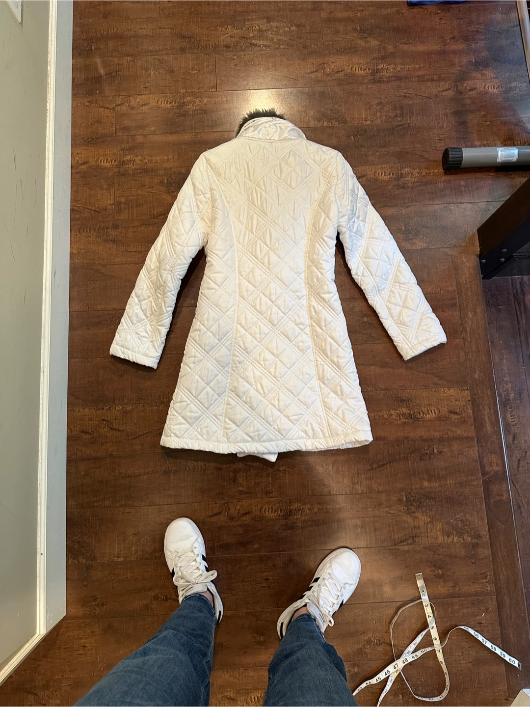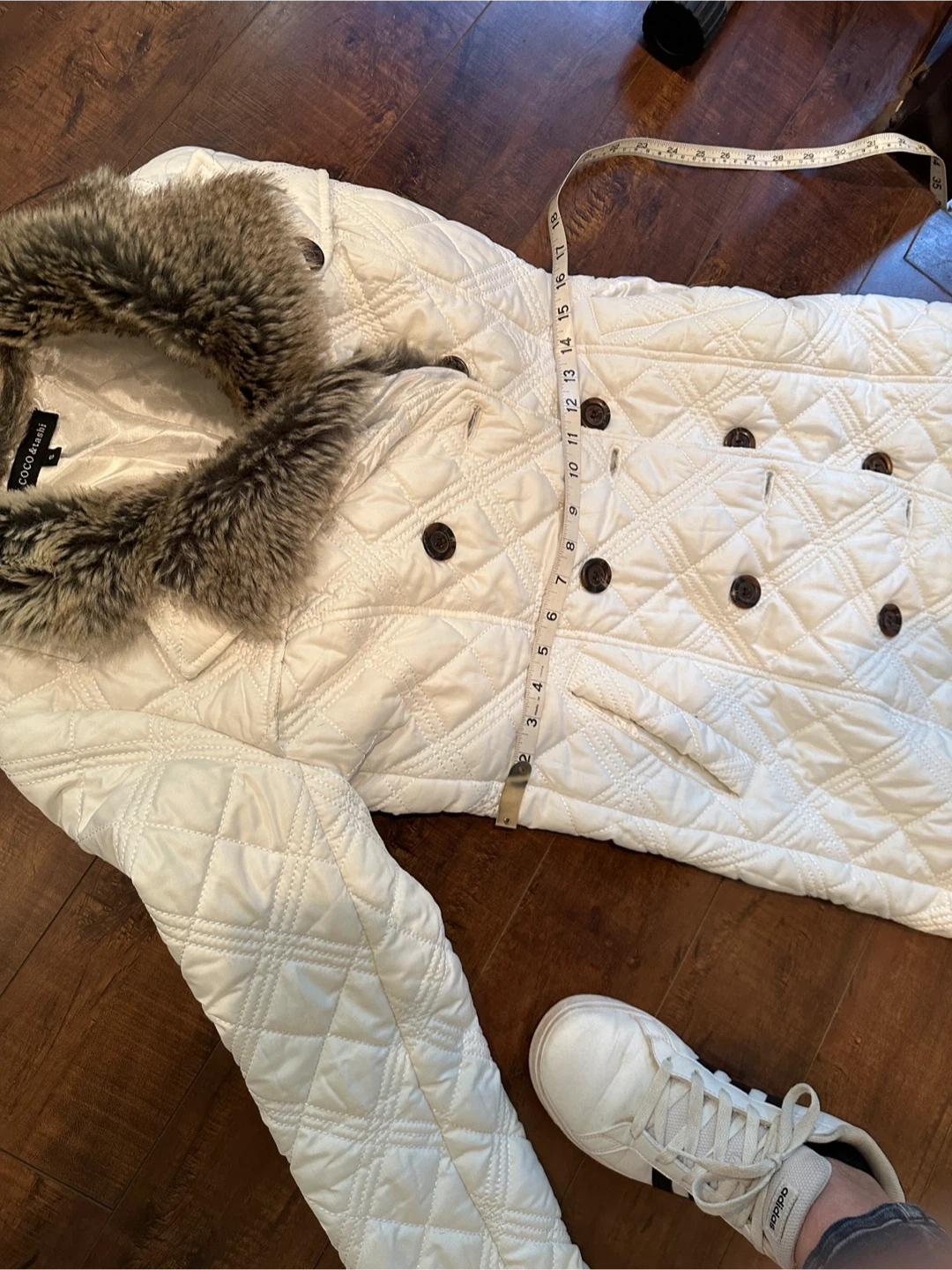 Coco & Tashi chic white quilted coat size Small. Featuring a plush faux fur collar, which is removable. Pockets in the front and button up, it's designed for both warmth and style. Perfect for any occasion. Excellent Condition. All Measurements are approximate.