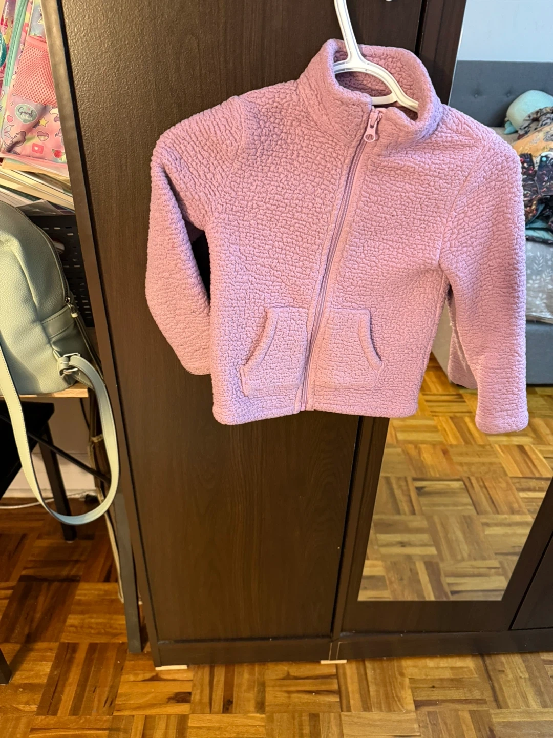 A cute pink zip-up fleece jacket for girls. It's soft and cozy, perfect for cooler weather. The jacket has two front pockets and a stand-up collar. XS size