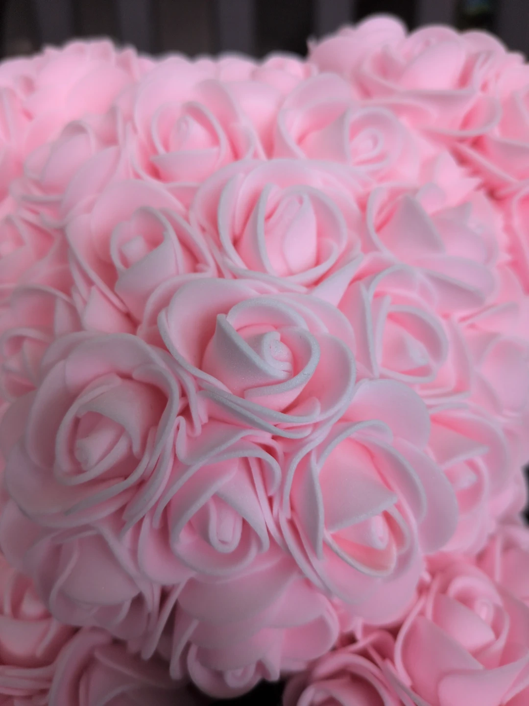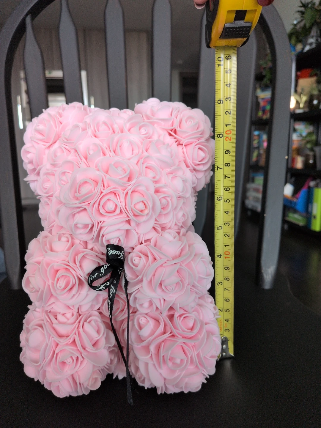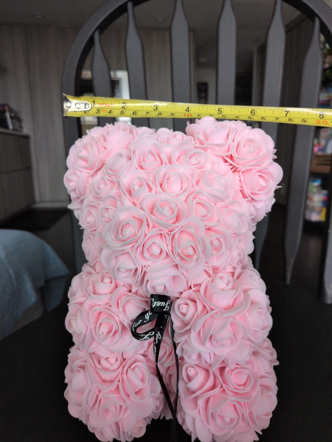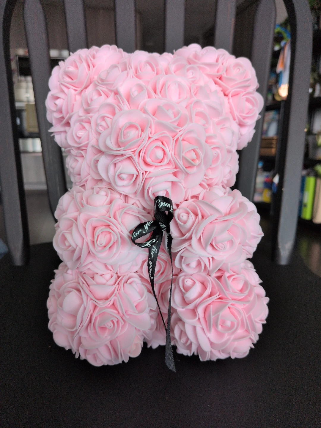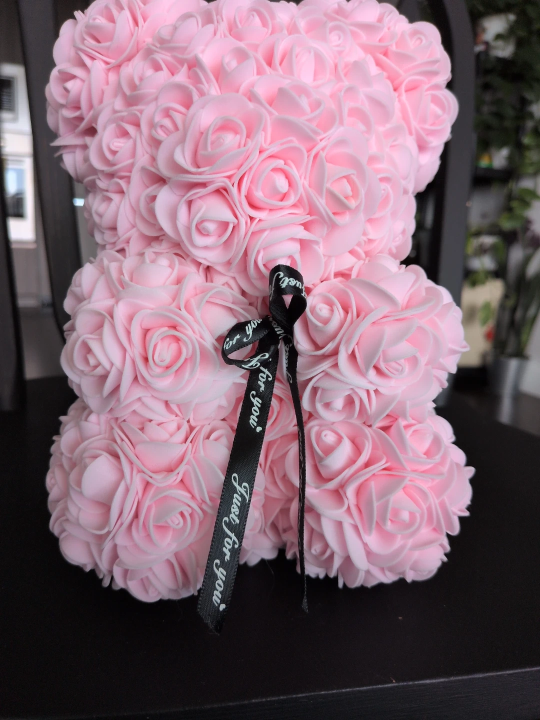 This is a pink teddy bear made of artificial roses. It measures approximately 9 inches tall. A black ribbon with 'Just for you' printed on it is tied around its neck. This teddy bear would be nice gift for your girlfriend.