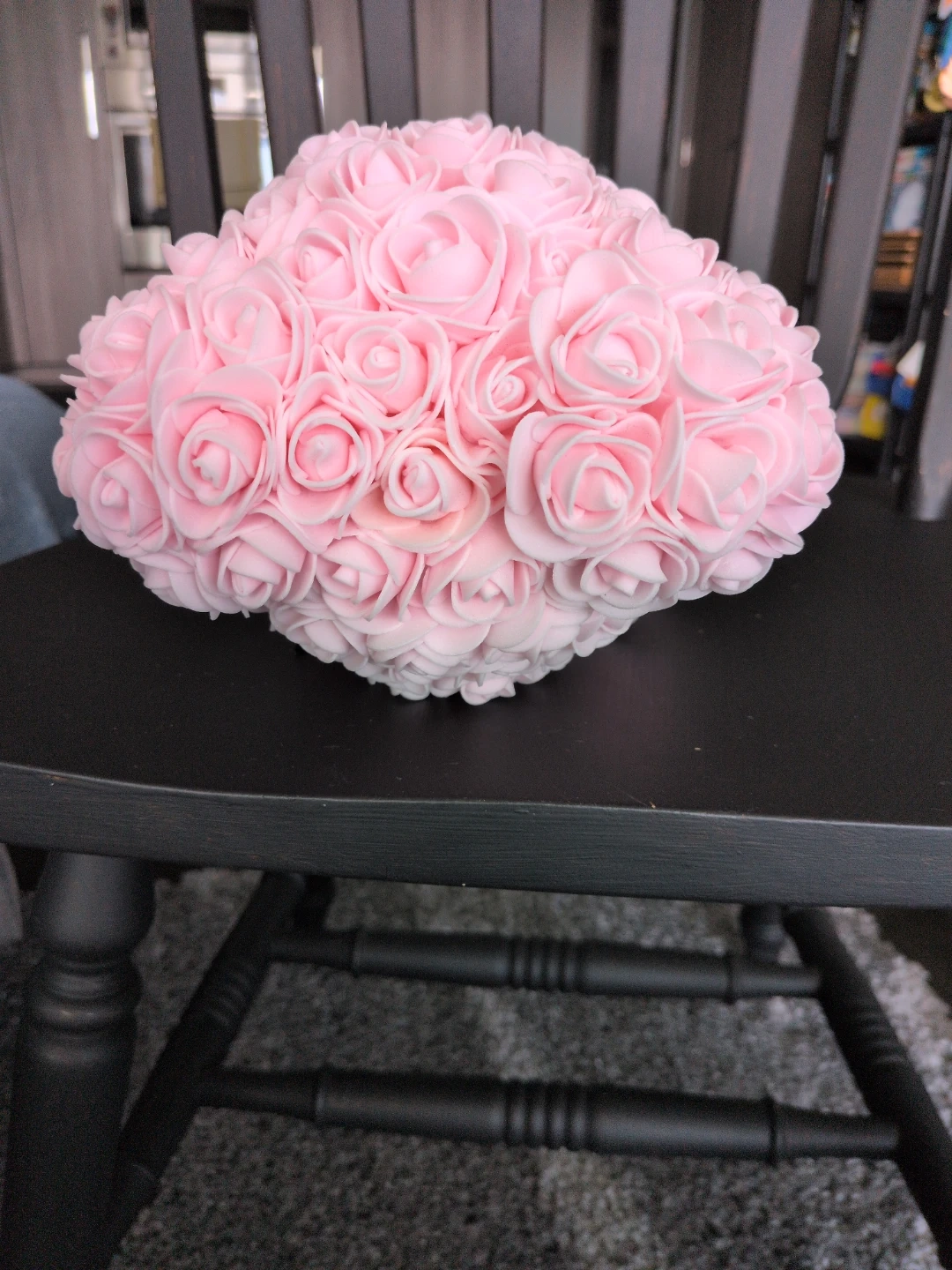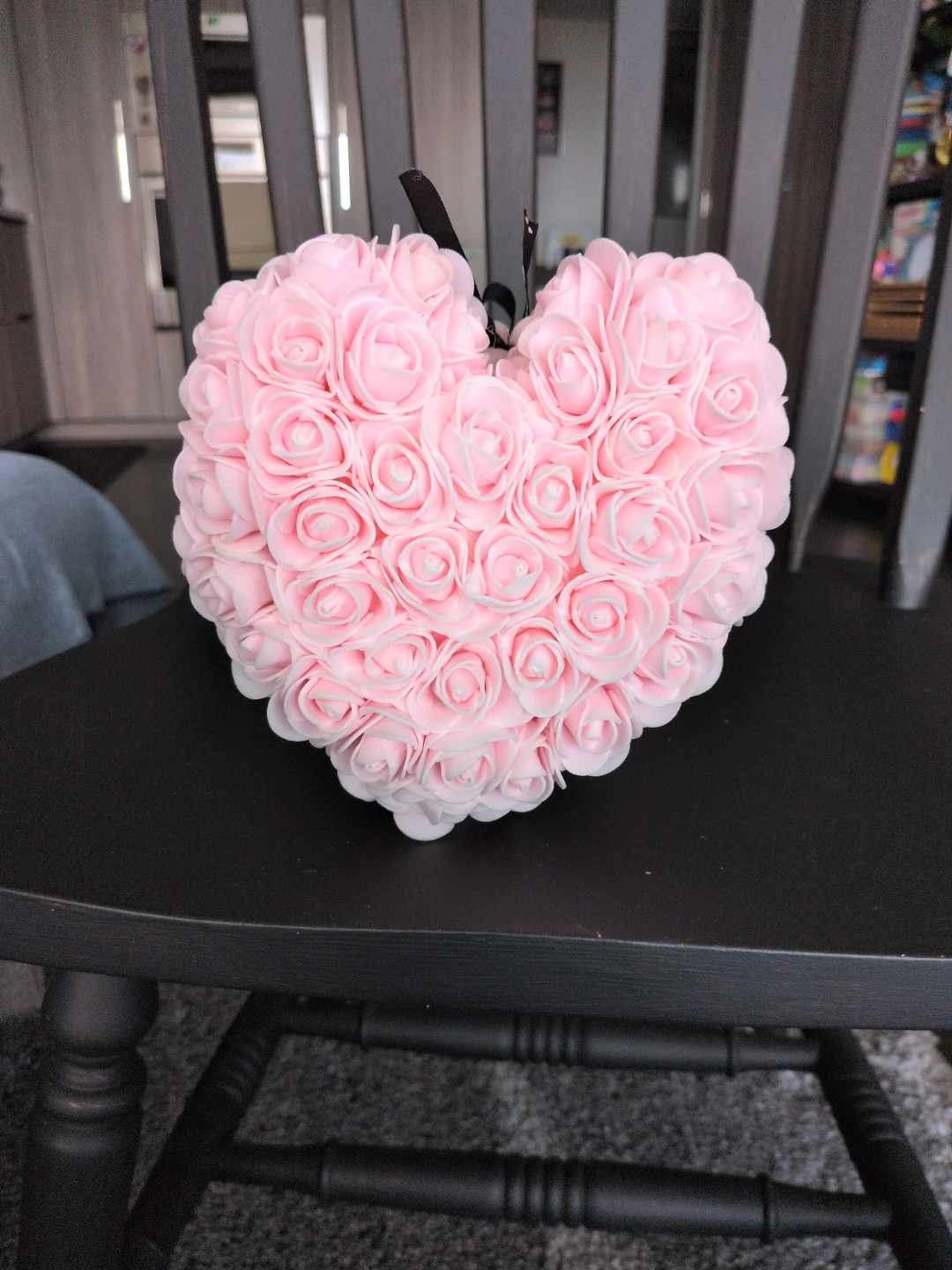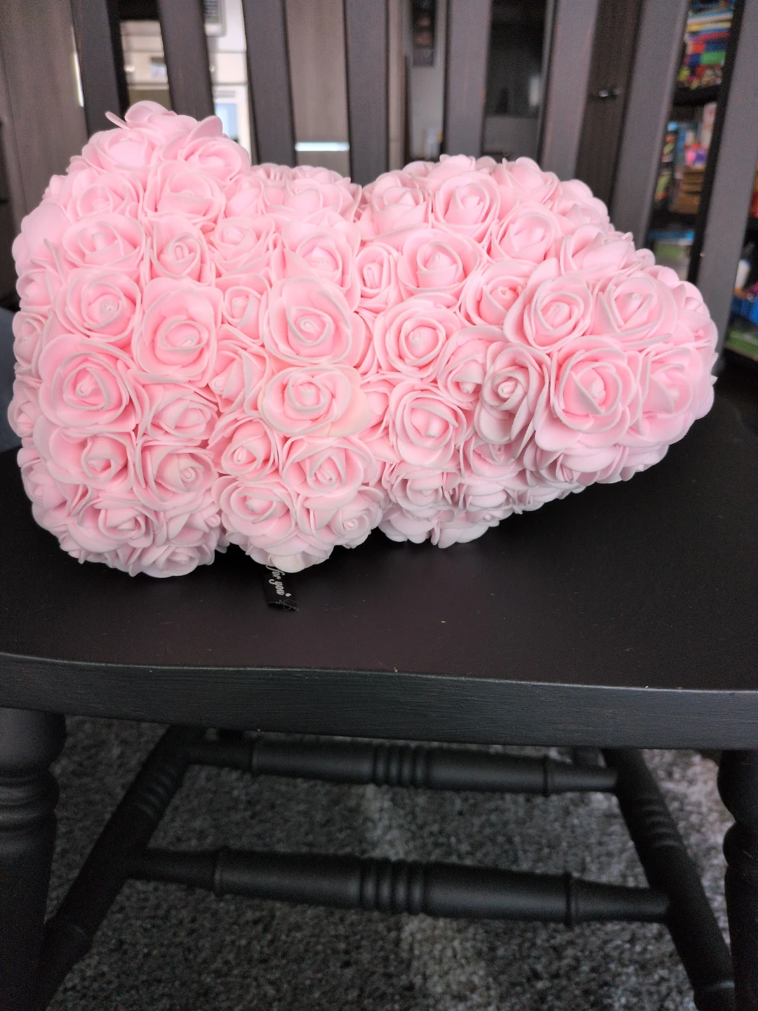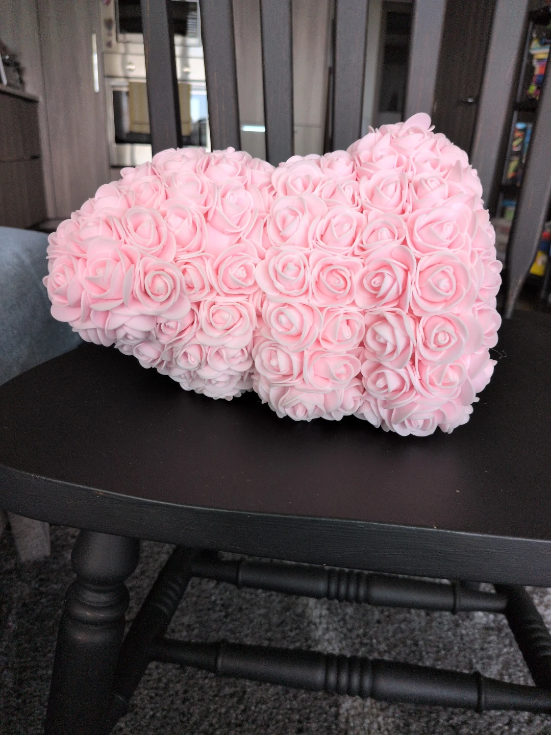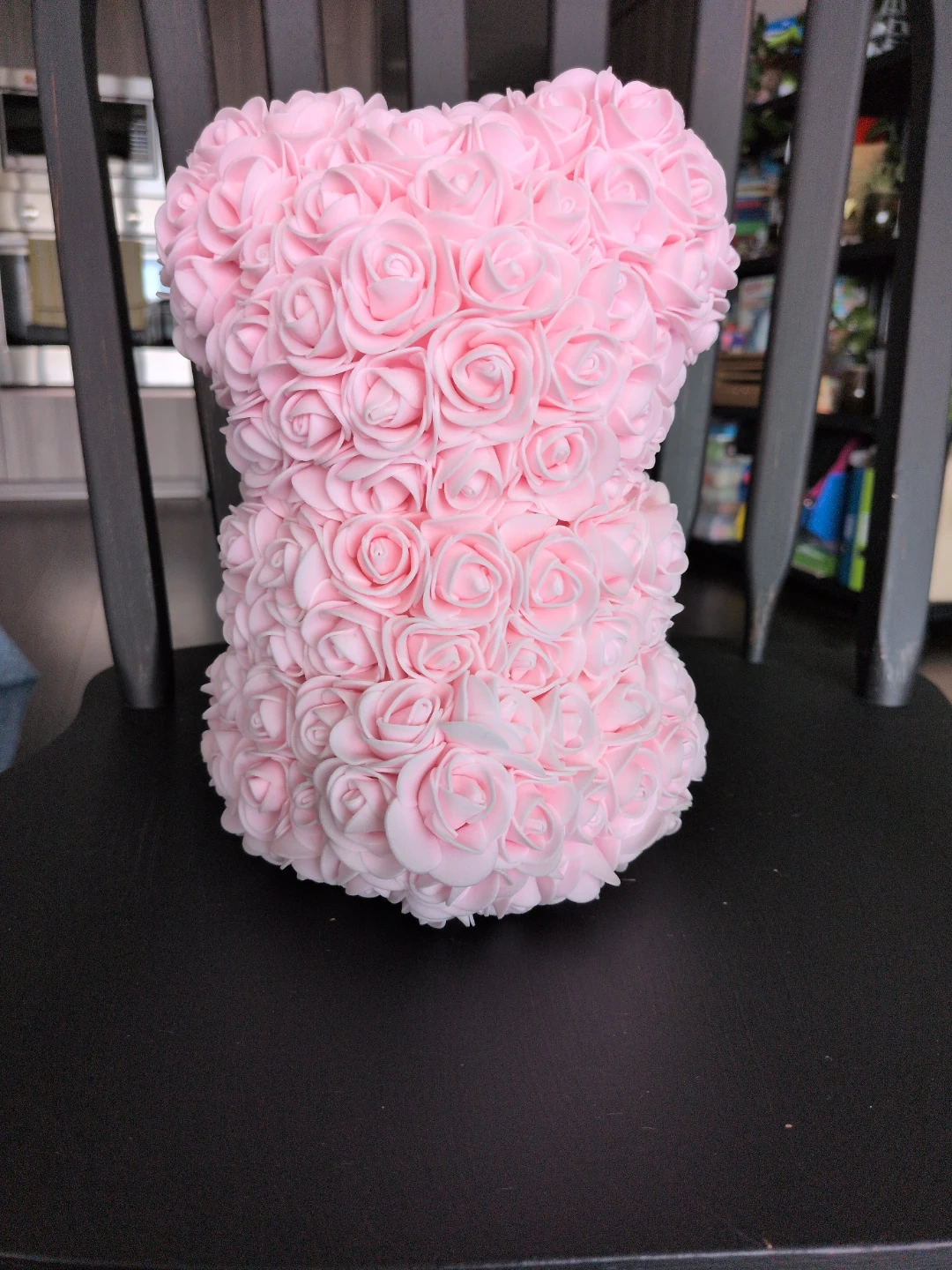 This is a pink teddy bear made of artificial roses. It measures approximately 9 inches tall. A black ribbon with 'Just for you' printed on it is tied around its neck. This teddy bear would be nice gift for your girlfriend.